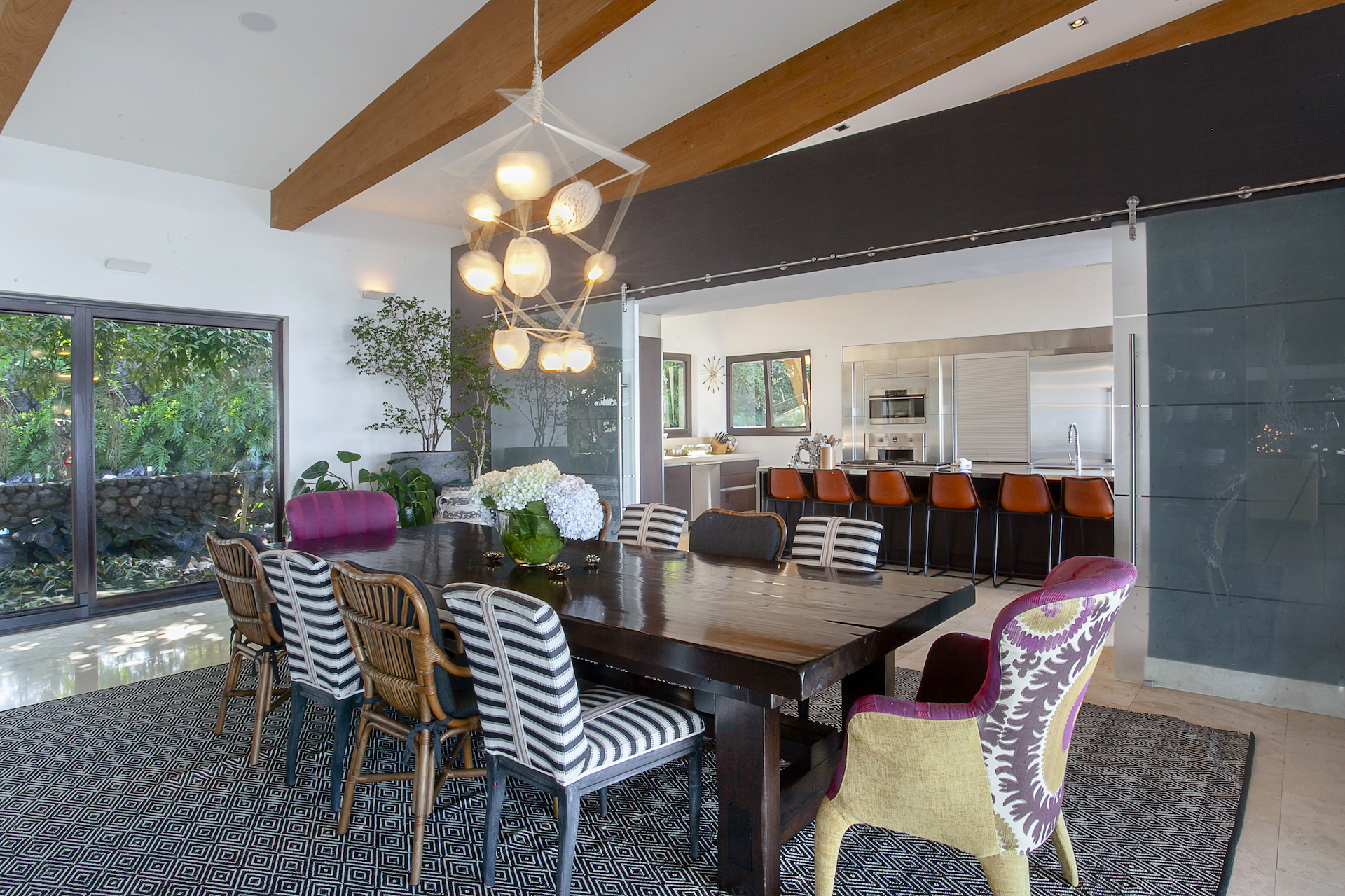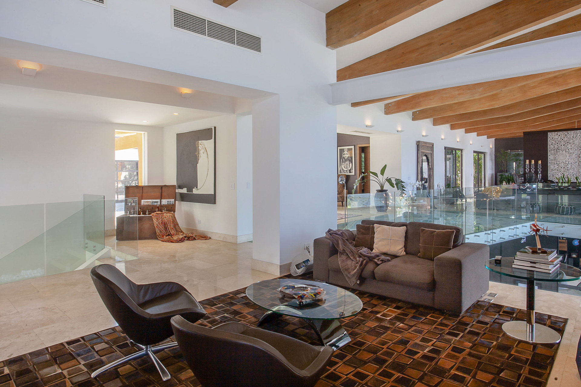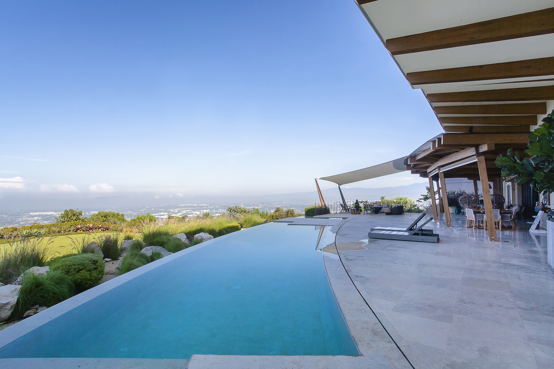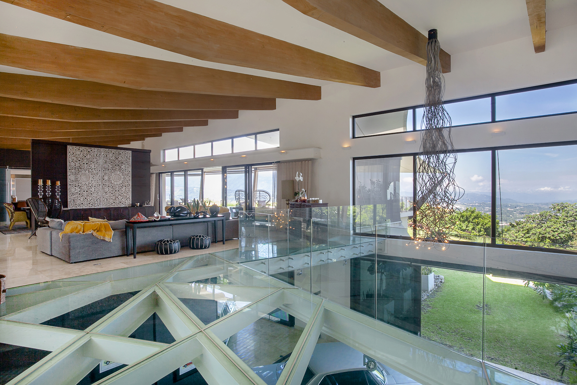 The entrance to the home abounds with natural light and the infinite views and forest in the backdrop, as the "back" of the home is lined with windows from top to bottom. You will find a warm, visitor's bath at the entrance with stone fixtures, and textured wallpaper. As you walk towards the social areas of the home, you will be drawn to the unique, glass floors of this space, which allow you to visualize the bar and casual living room on the lower level, straight through the sliding glass doors to the backyard. Moving towards the left of the main floor, you will find a living room, dividing the dining room on the other side with a half wall, hiding a large, flat-screen tv, and access to the terrace, pool, and backyard, on either side through the wall to wall, sliding glass doors. The vaulted ceilings throughout this entire space are lined with natural hardwoods, which, together with the glass in the backdrop, and the marble floors in the social areas, create the perfect combination of finishes for a contemporary, yet warm residence. To the other side of the dining room, the sights, and Smells begin to loom from this one of a kind, chef's kitchen whose stainless steel double island and appliances truly reflect and exude both the luxury and elegance of this home. The kitchen is equipped with every bell and whistle imaginable, and like the other social areas, boasts direct access to the expansive terrace, pool and football field like yard in the forefront. (behind the kitchen, you will find laundry and service as well as a two-car day garage).... From these social areas, it is impossible not to wander outside...the entire home and its design center around not what is inside, but rather on what is outside. No expenses were spared to create a unique, flat land in Villa Real, allowing for an enormous infinity-edge pool, but also a true and impressive yard, which is accented with line and manicured gardens just as the land drops off and the endless views begin.