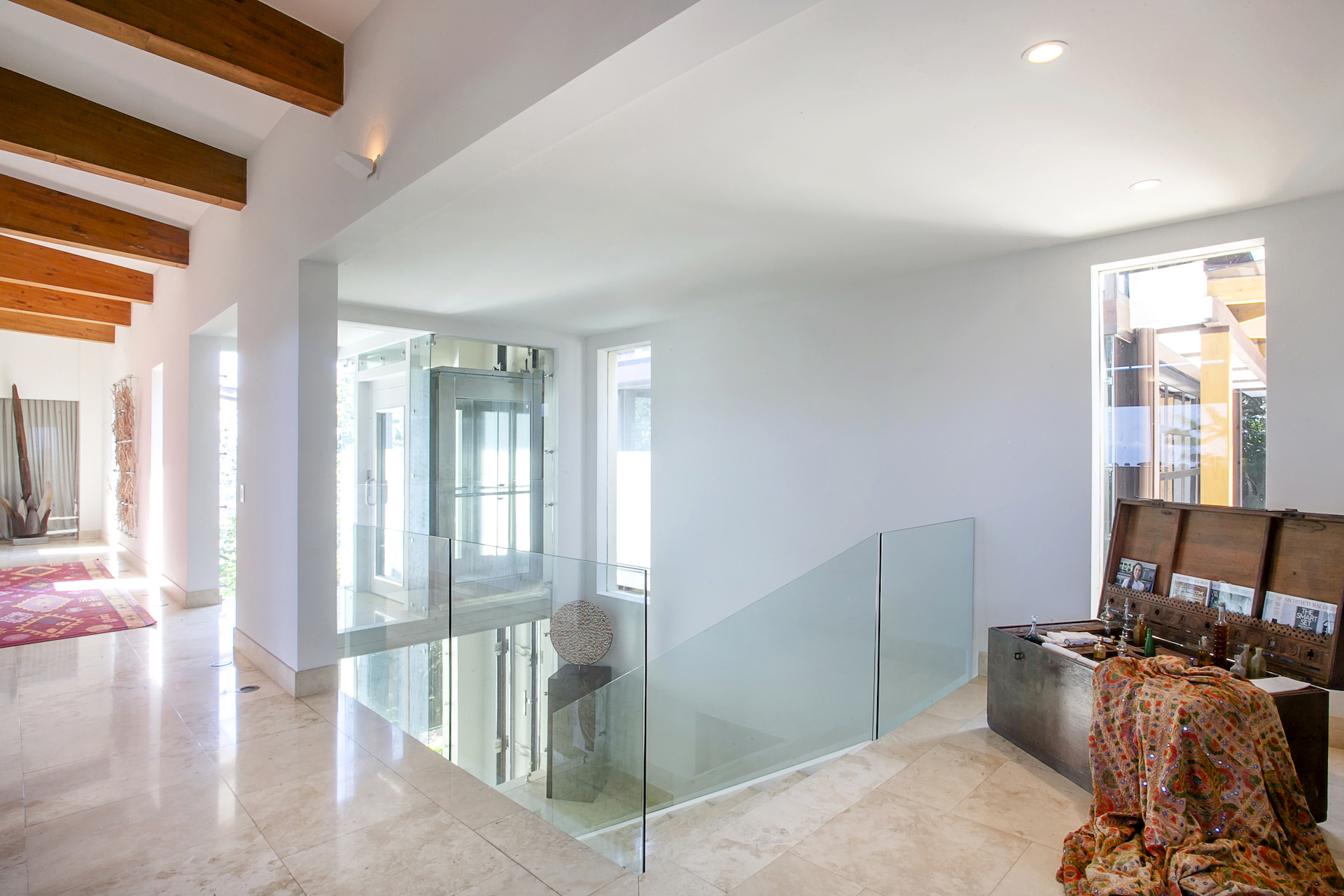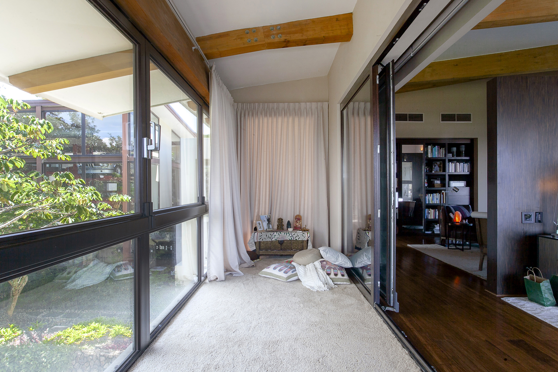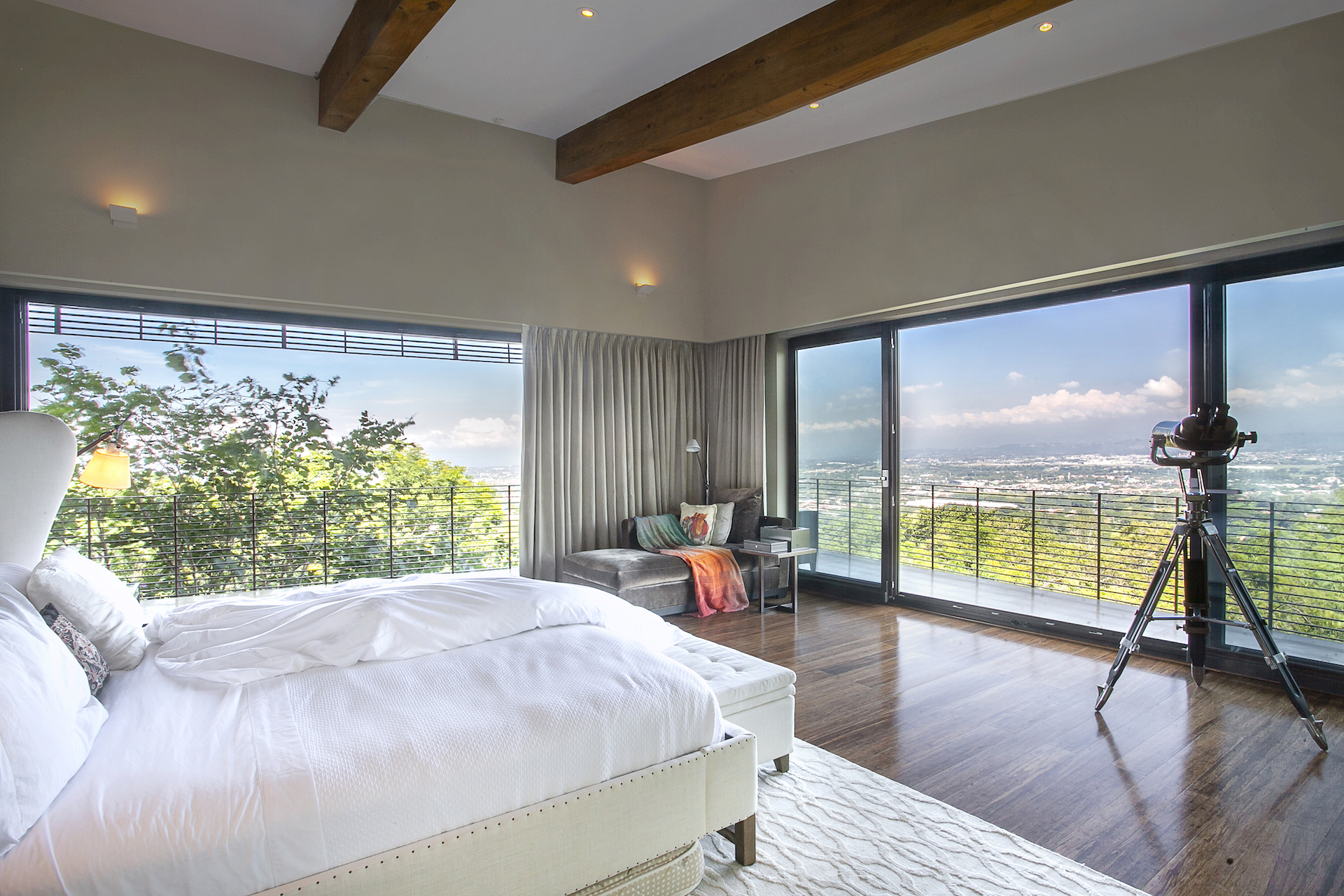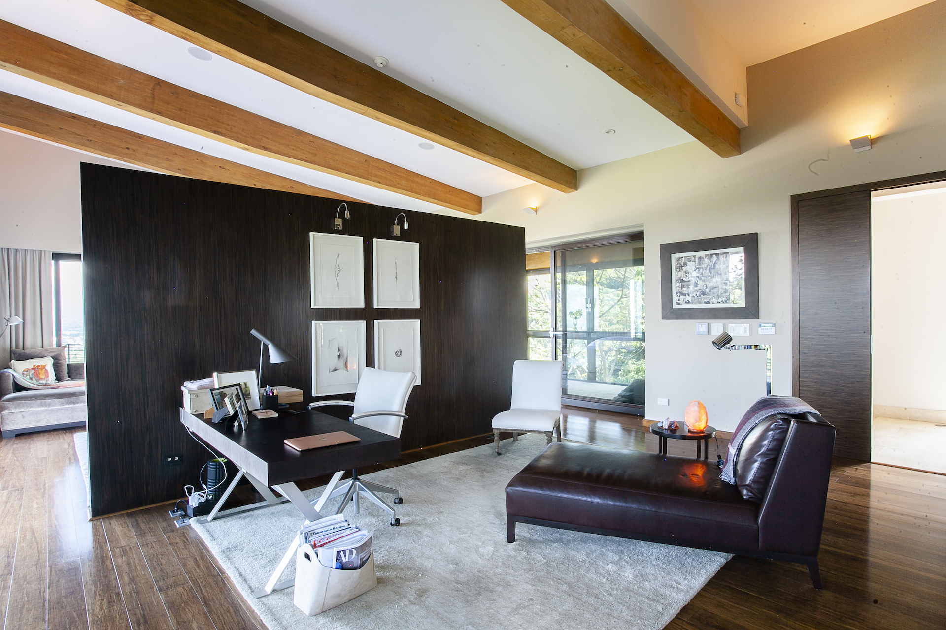 Back inside towards the entrance of the home, now to the opposite side of the home, you will find a quaint home office perched over the viewing, and as you walk down the hall, you will pass the staircase and elevator accessing the lower levels until you arrive at what can be properly named, the master suite. LIned with hardwood floors, opposite the wood beams on the ceiling, you will first come to a spacious living area and office, which is separated from the bedroom by a half wall, hiding an immaculate bedroom which overlooks one of the most impressive, bedroom views we have been privileged to see. As this side of the home borders the reserve, as well as a severe drop in topography below, the impression that the home is levitating truly elevates the sensation to something so peaceful and indescribable.