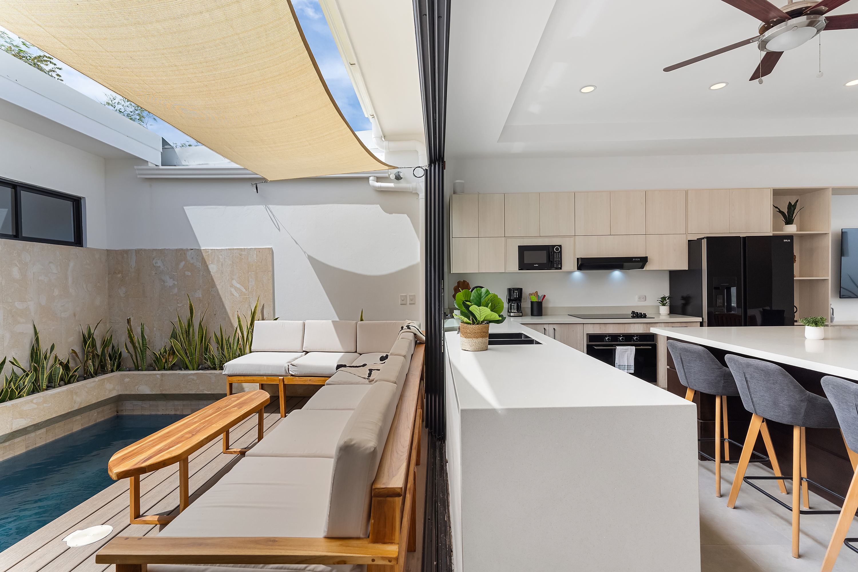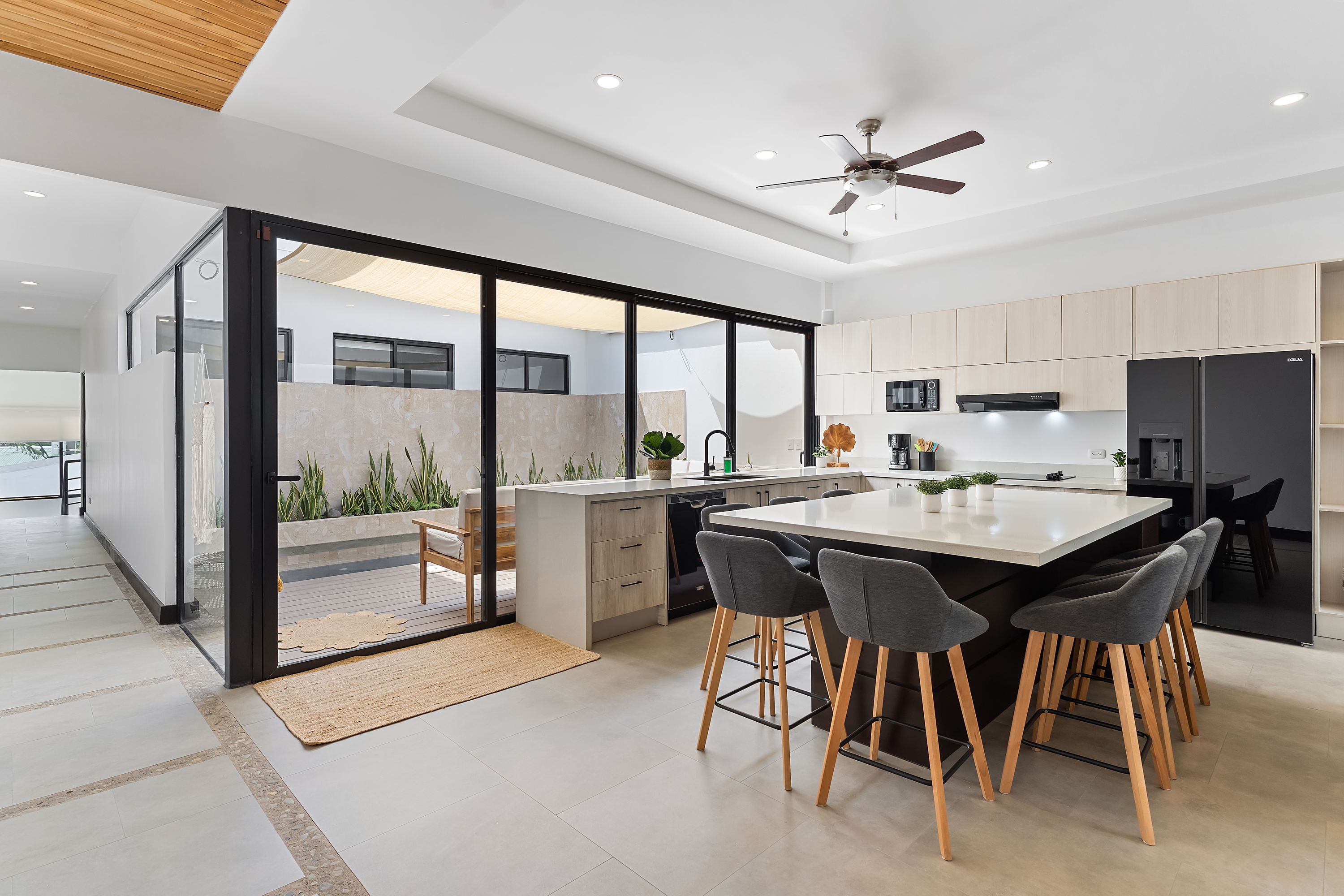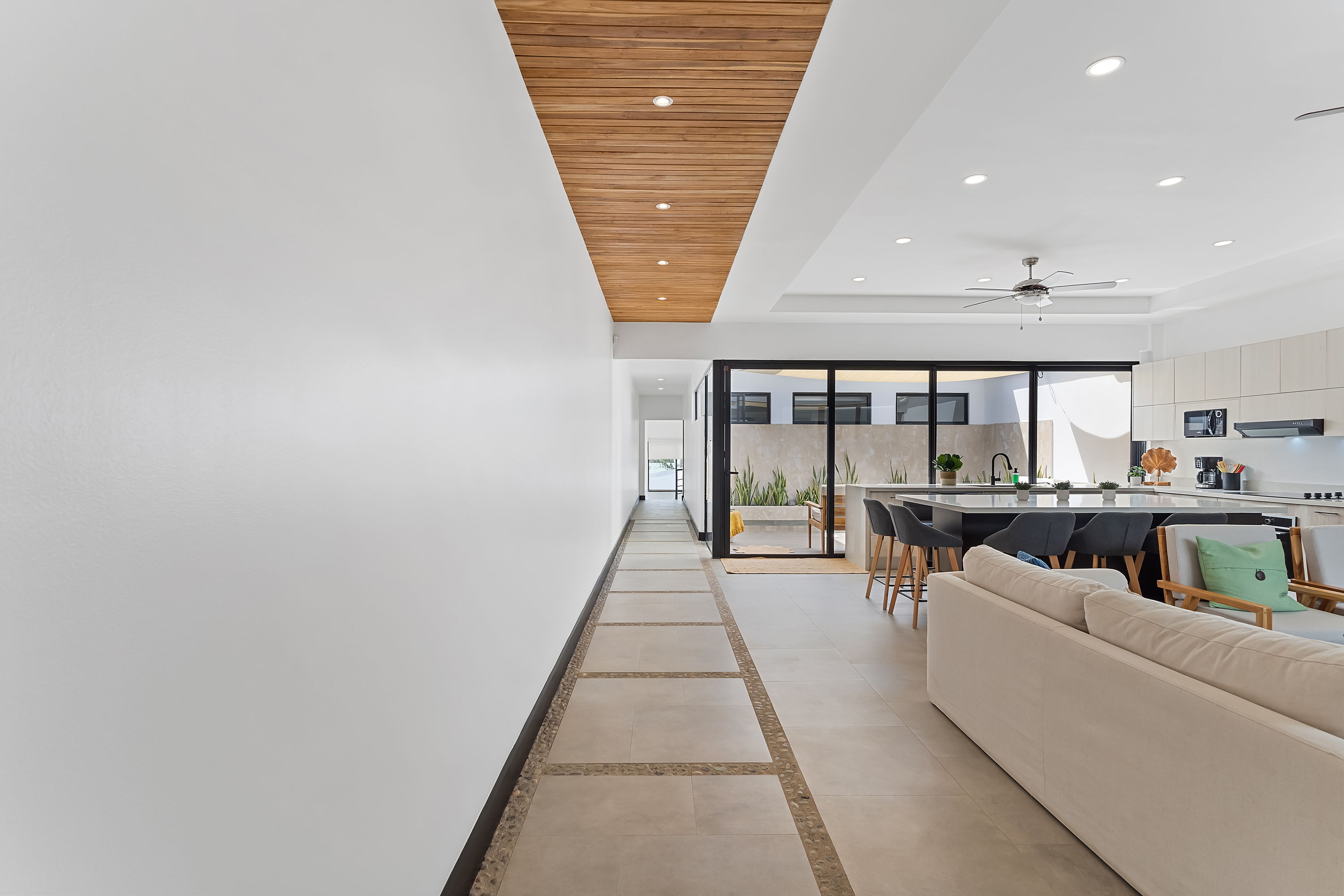 These brand-new, three-level homes are centered around private courtyards that feature your own lounge area with tropical flora. The open-concept floor plans highlight glass doors, warm tropical woods, and elegant finishes, allowing for abundant natural light and a harmonious connection between indoor and outdoor spaces. One of the master suites even includes a private courtyard for an added touch of exclusivity.