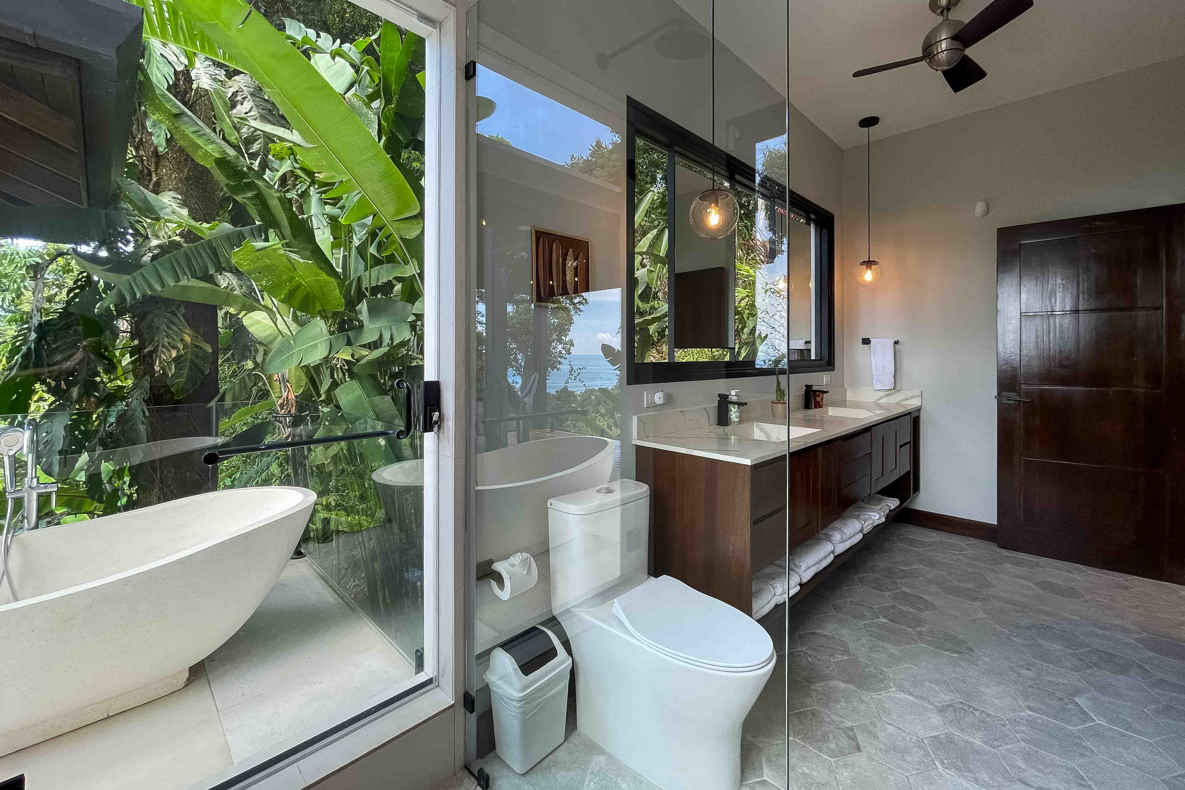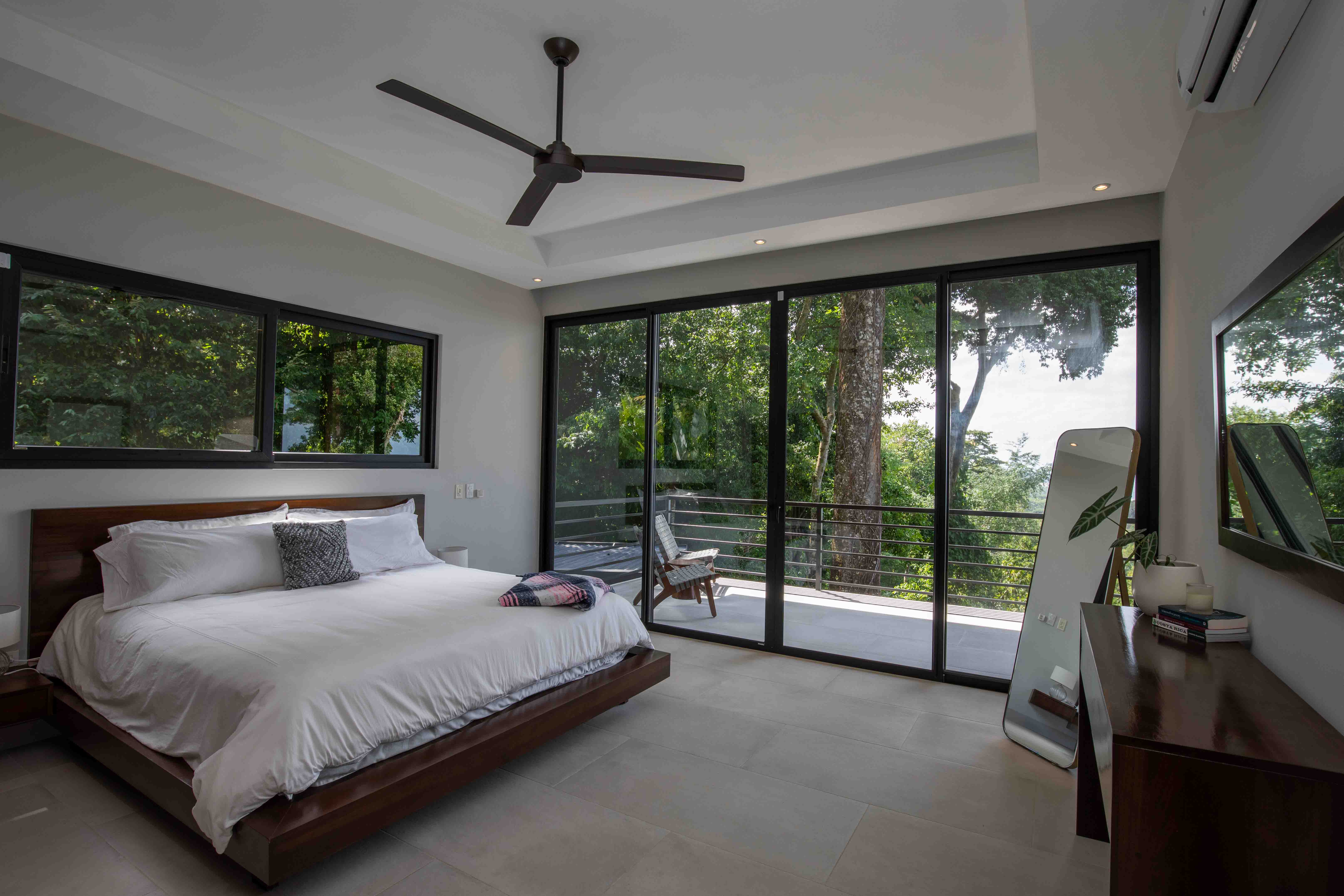 The second floor houses 3 of the 4 bedrooms with expansive ocean views. Currently one of the rooms is being used as a large gym, with high mirrors and TV, ideal for family recreation. All bathrooms have luxurious and aesthetically relaxing finishes, with large windows oriented to take advantage of the wonderful view of the tropical jungle.