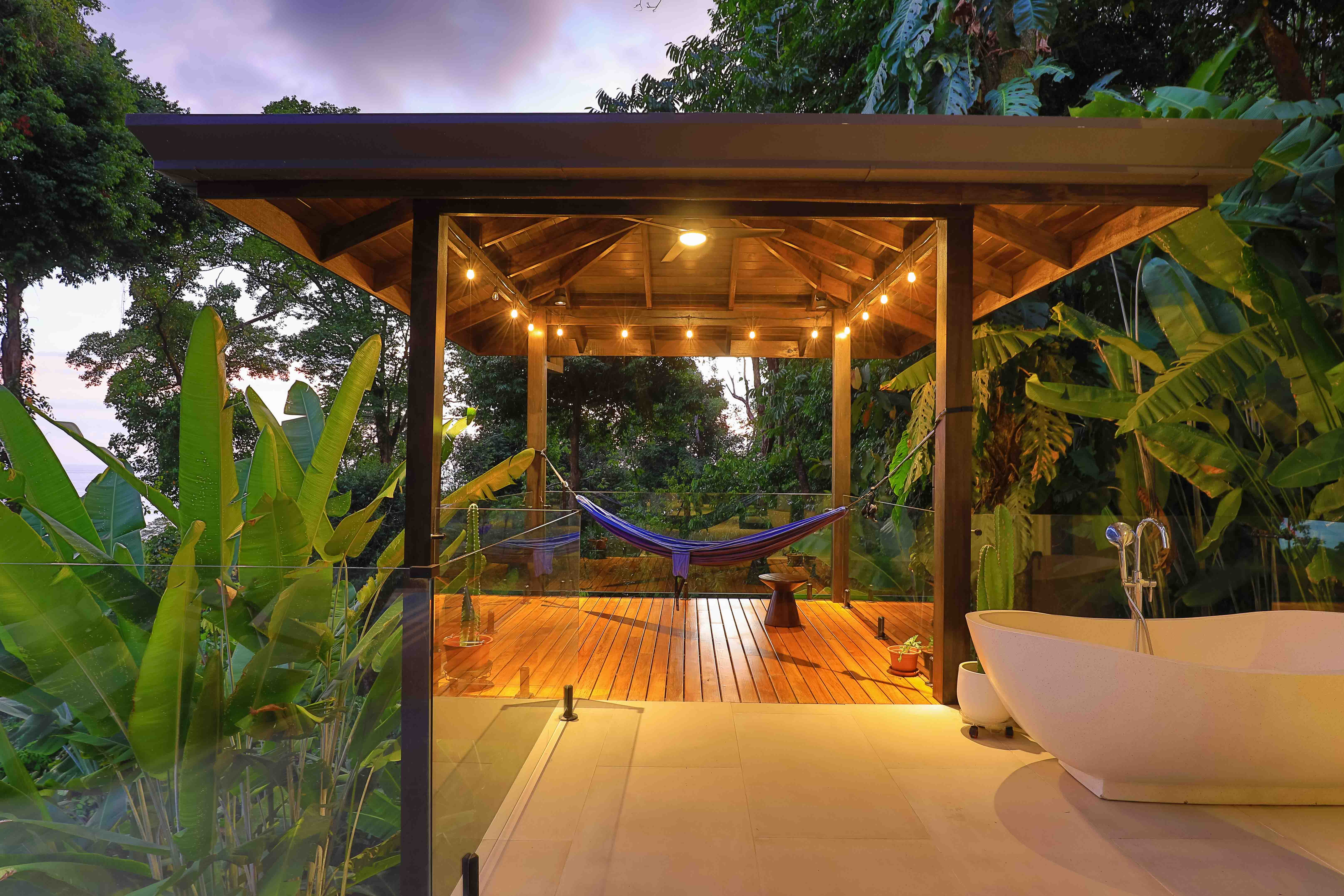 The master bedroom on the first floor, with walk-in closet, outdoor bathtub on the balcony, leads to the swimming pool and adds to the morning magic of waking up to the sounds of countless species of birds in the surrounding rainforest. Walk a few more steps out and you will find a beautiful ocean-view yoga Shala; an ideal wooden covered deck for your morning practice or for those special moments at sunset to contemplate the beauty of this property.