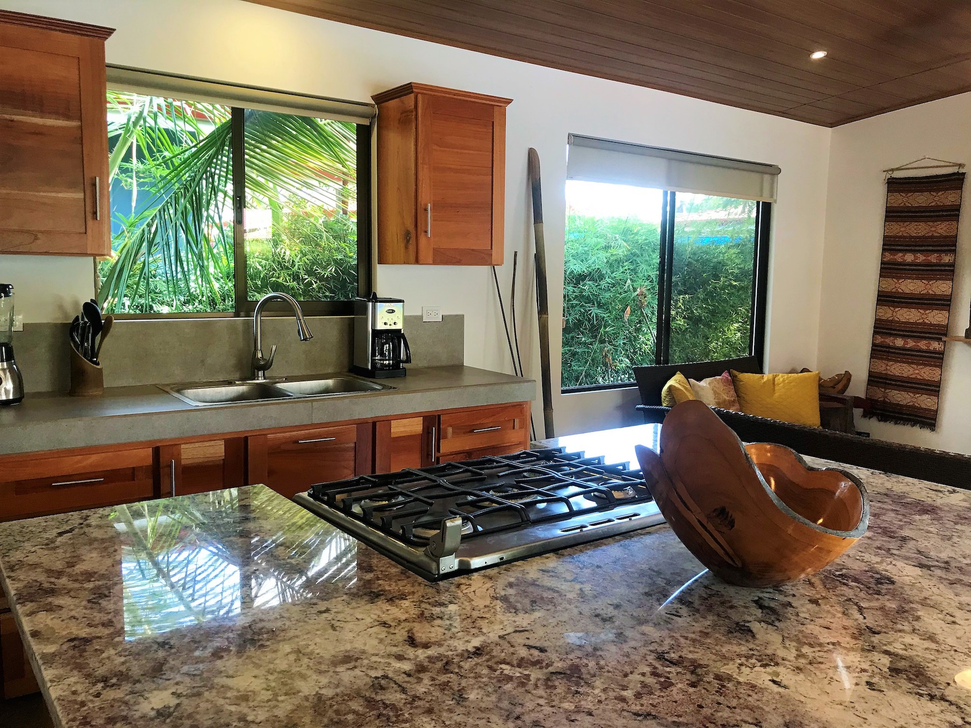The main home features a clean design with an open layout. The kitchen and living room unite together and open up to a large outdoor poolside terrace that is ideal for relaxing or entertaining. Finishes such as tropical wood posts, polished concrete floors, cedar doors and cabinetry, and granite contertops blend with the jungle decor to provide a tropical modern feel with a hint of luxury. The 3 bedrooms are spacious and enjoy ample natural lighting which highlights the modern design. Beautiful hardwood built ins complement each room. The master bedroom enjoys access to a private terrace.