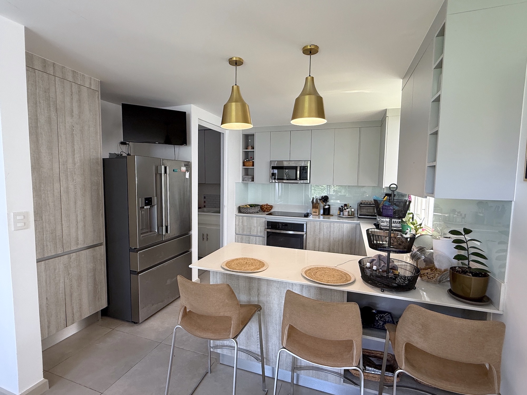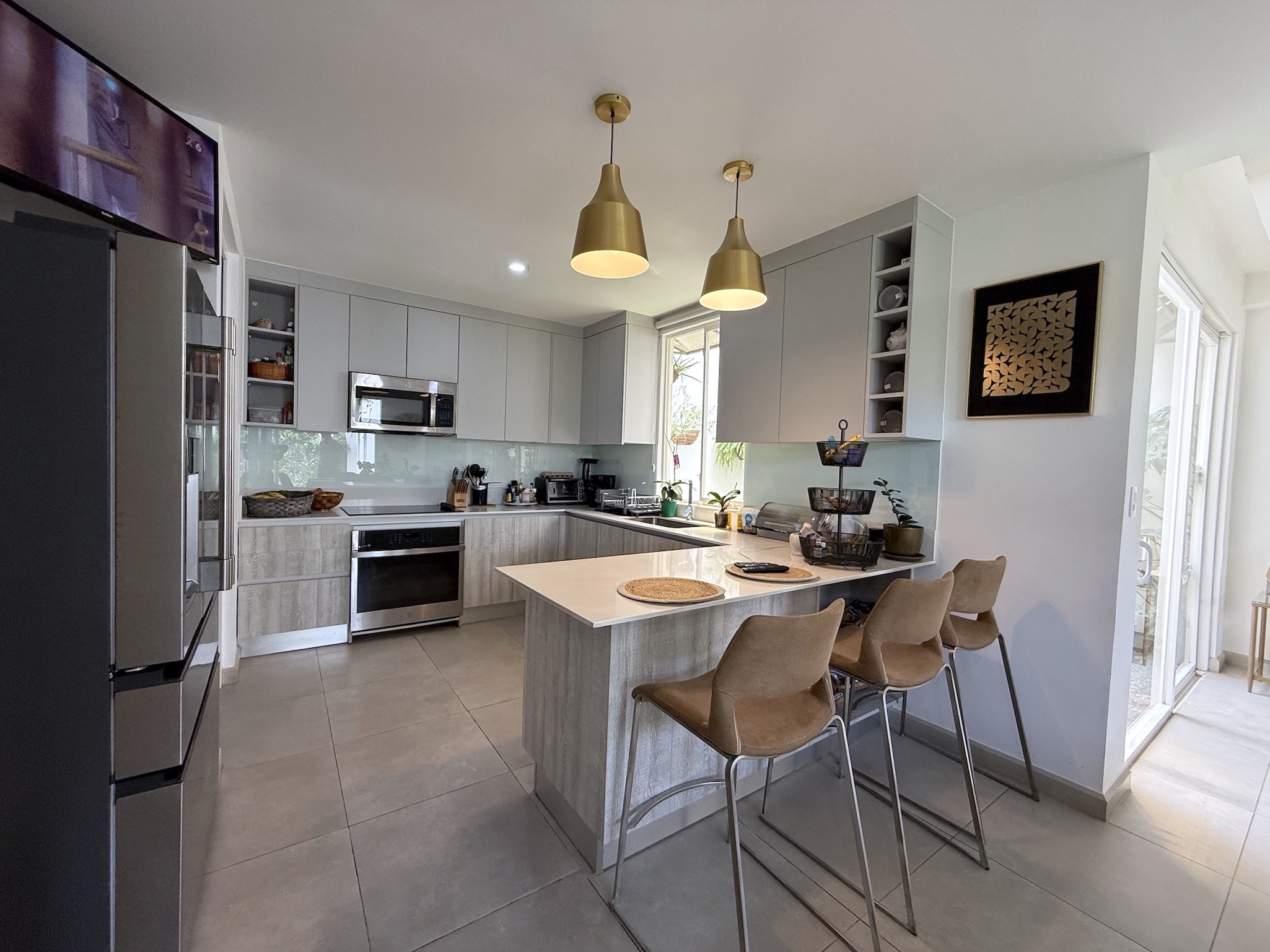- Cocina abierta con sobres de cuarzo, desayunador y electrodomésticos