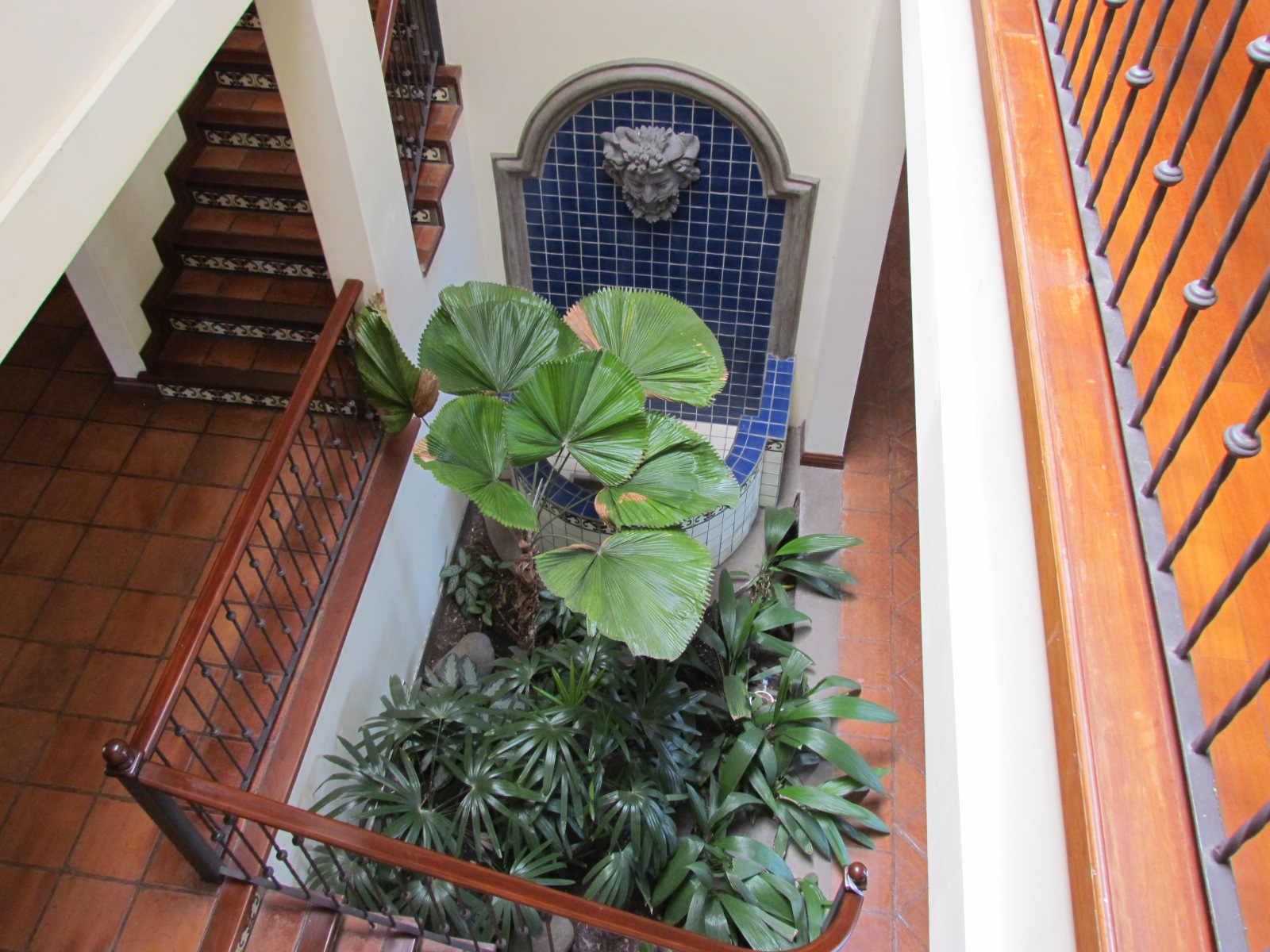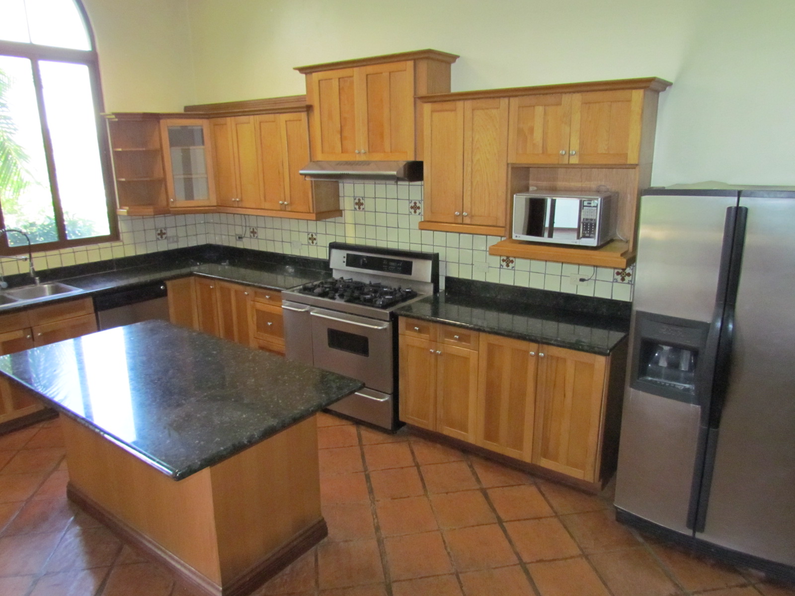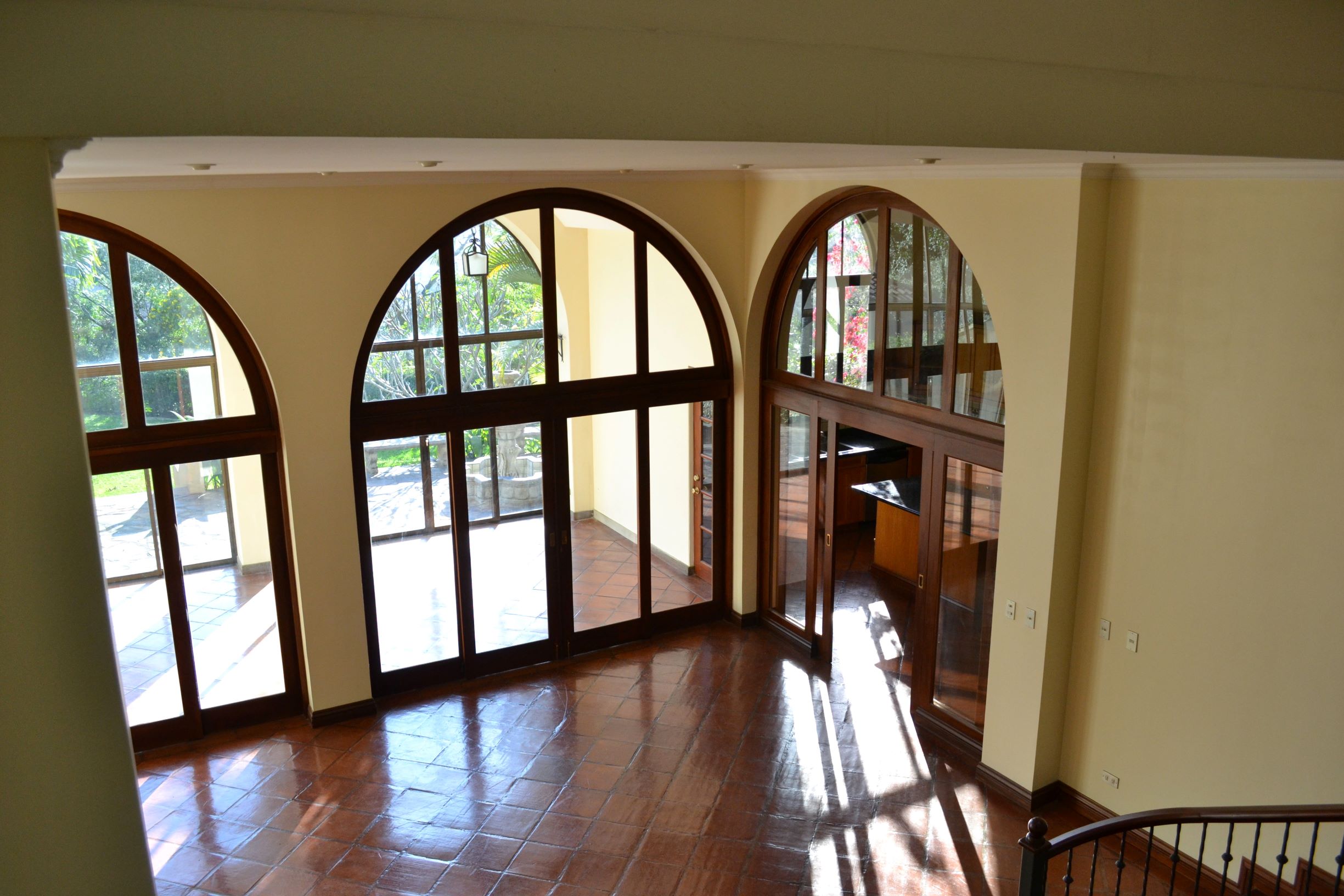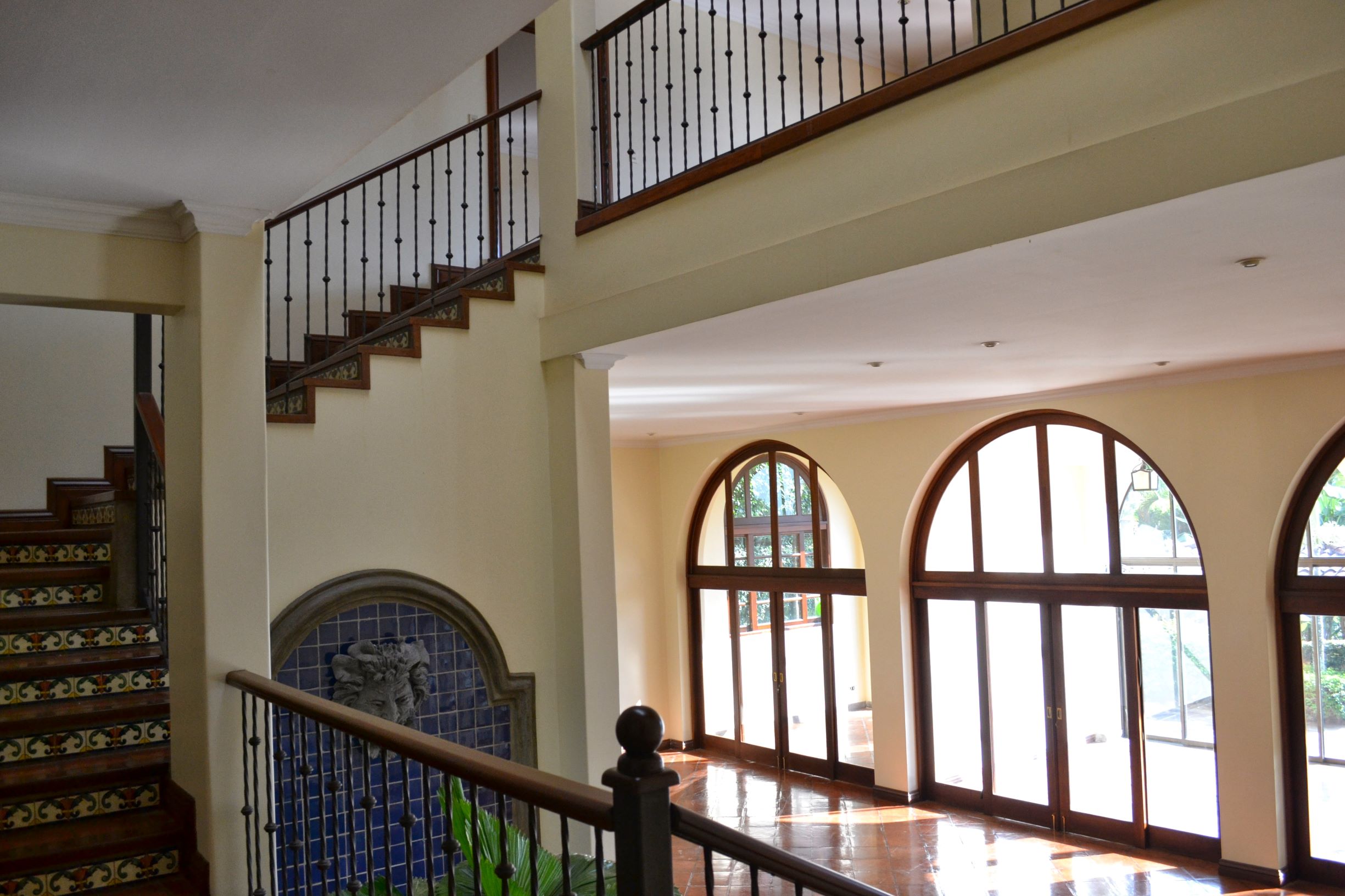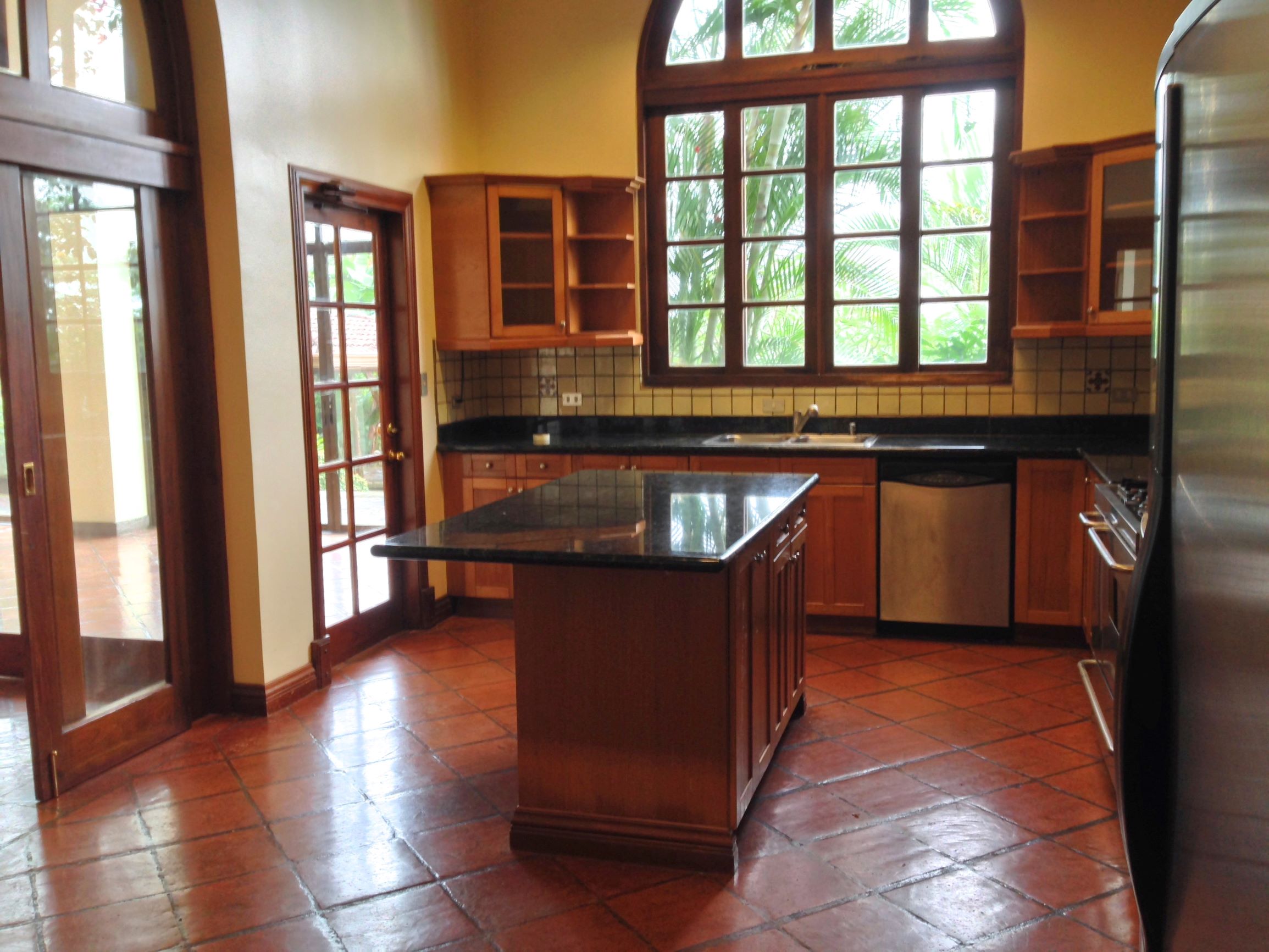 The social area of the home features an open living room and dining room with high ceilings, an enclosed sun room and a large yard beyond with a Rancho and jacuzzi. The atrium above the fountain provides light throughout the center of the home. The kitchen is perfectly located for entertainment purposes and includes stainless steel appliances, lots of cabinetry, granite countertops and a center island. There is also a bedroom with a full bathroom on the first floor of the house.