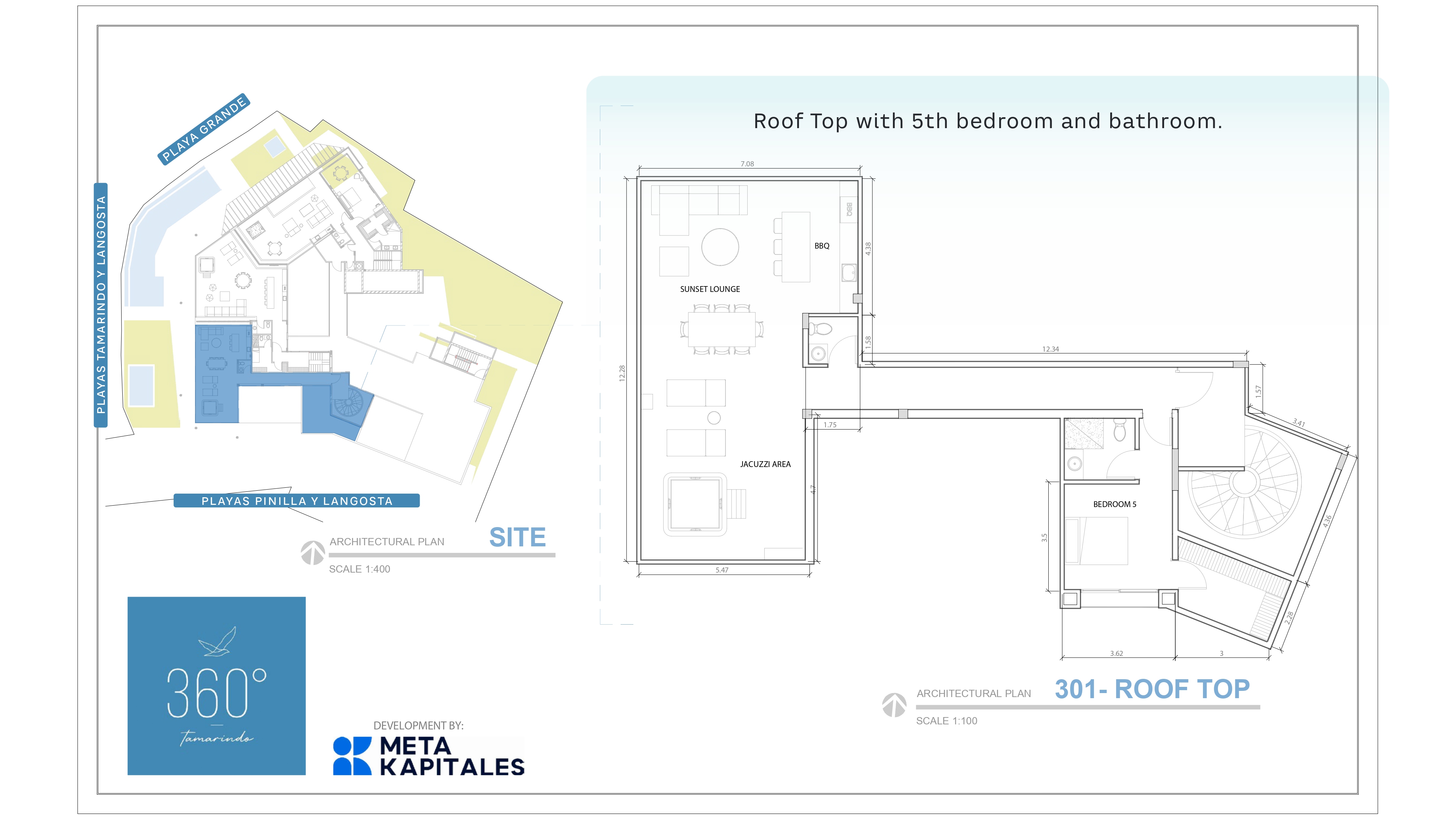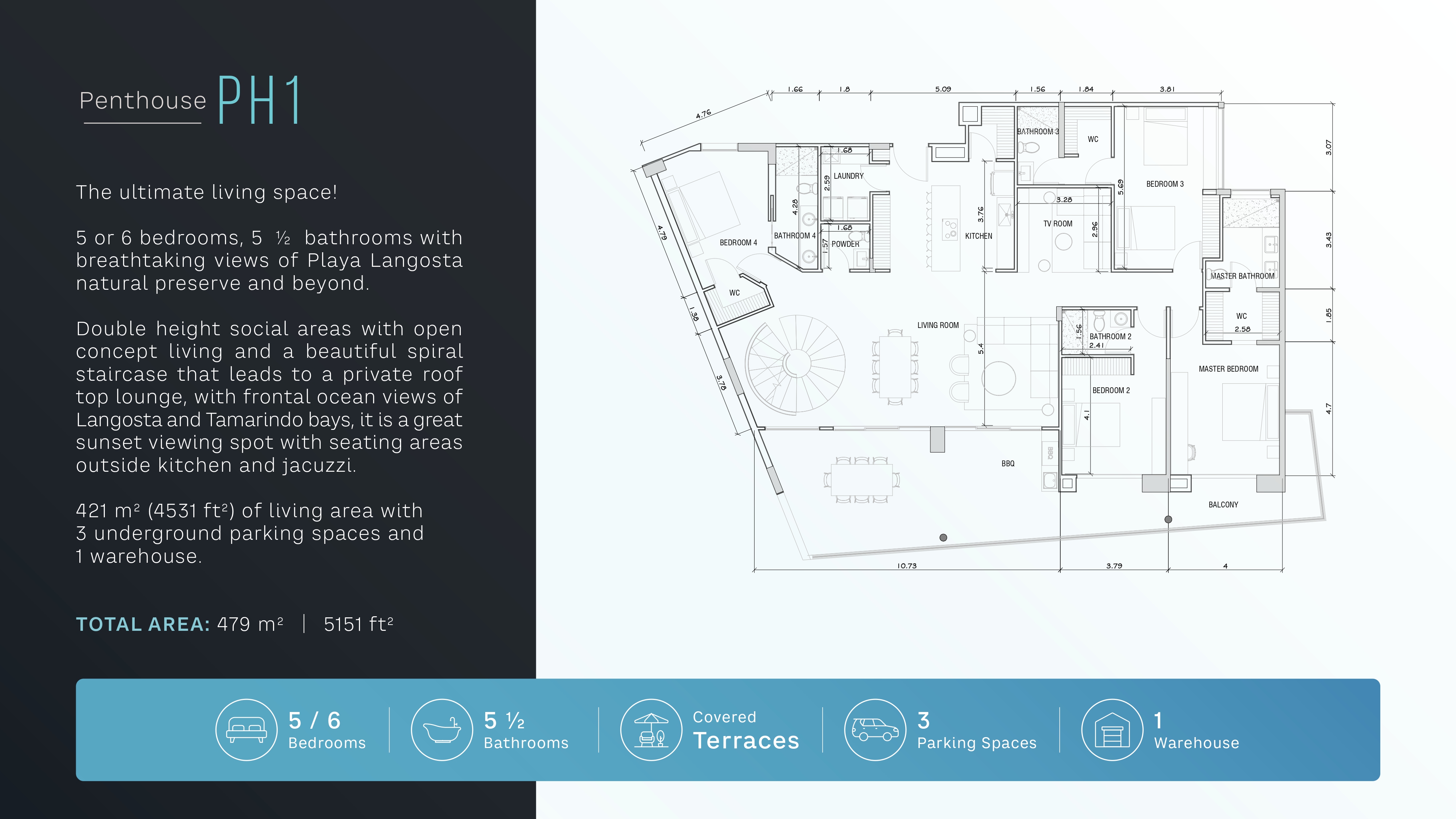Elevate your lifestyle at Tamarindo 360, an exclusive sanctuary offering a stunning penthouse with panoramic ocean views of Playa Langosta and Tamarindo Bay. This expansive residence features 5 or 6 bedrooms, 5.5 bathrooms, and an open concept design with double height ceilings in the main living area. A striking spiral staircase leads to a private rooftop lounge, complete with a jacuzzi and seating for unforgettable sunset views. With 3,056 sq ft of living space and a total of 5,151 sq ft including outdoor areas, this penthouse includes 3 underground parking spaces and a storage bodega for added convenience.