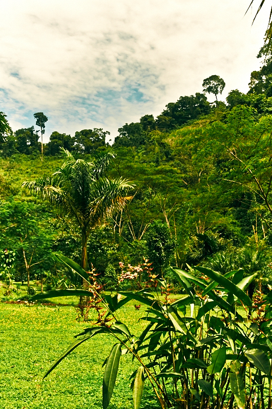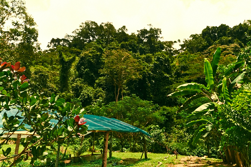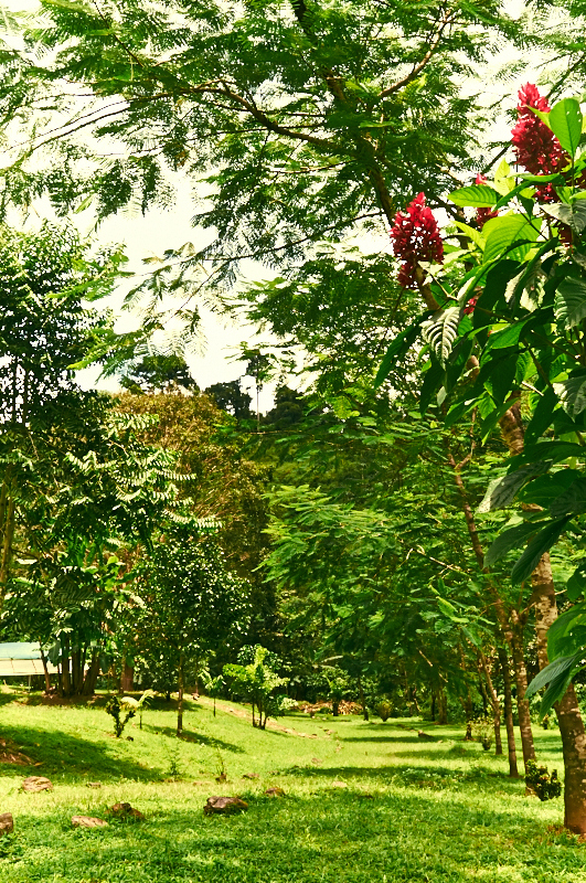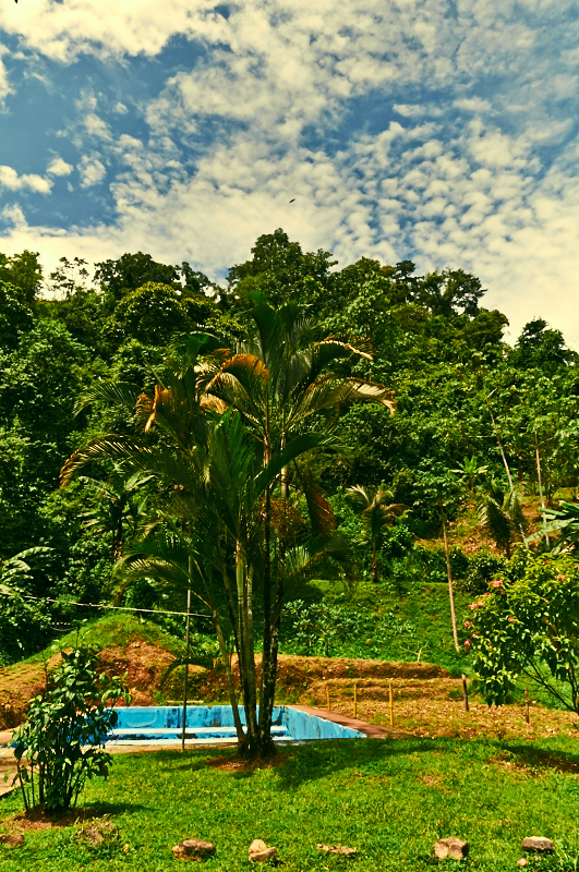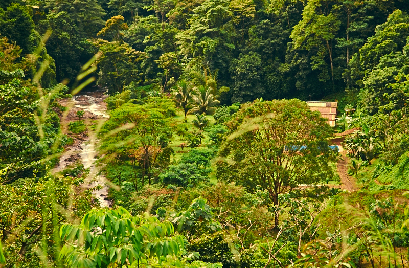 Driving up into the hills from Dominical you pass friendly neighbors, organic farms and arrive at a stone column iron gate. Passing the gate the scene opens up to a flat wide open space surrounded by a horseshoe shaped ridgeline and a river with a tall 50 foot waterfall emptying into the fresh spring waters.
