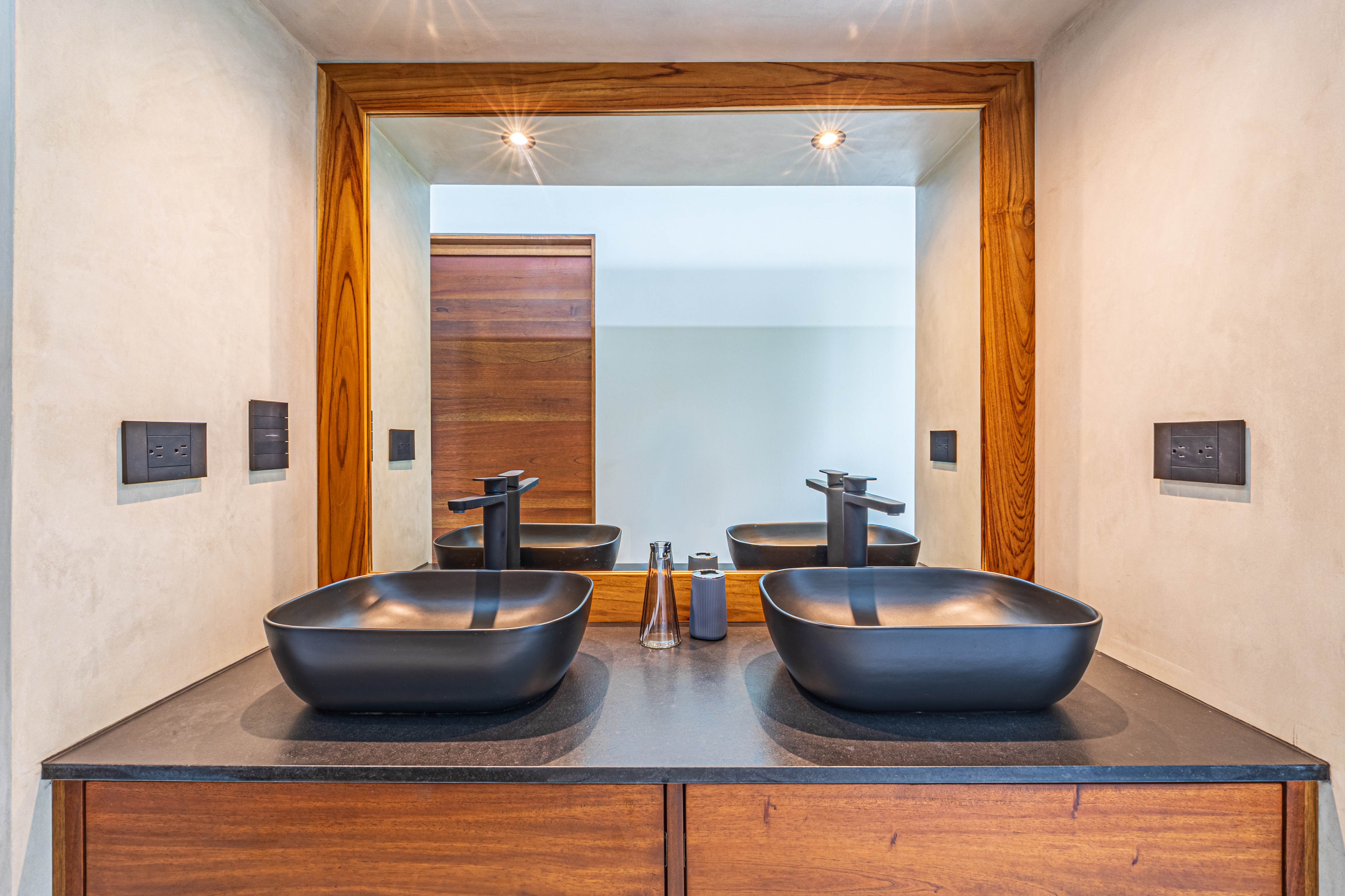 Below the main home lies an independent guest suite, featuring a large bedroom, ensuite bath, full kitchen, and living area. A cascading waterfall from the infinity pool above spills into a private dipping pool, creating an unforgettable setting of tranquility and seclusion. In total, the estate can comfortably sleep 14 people.
