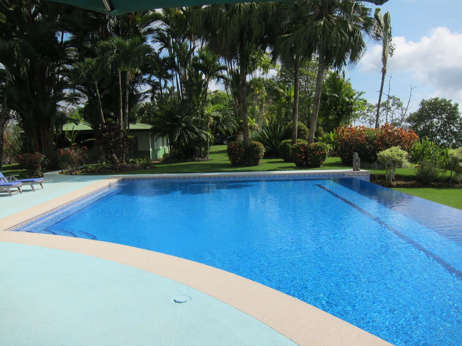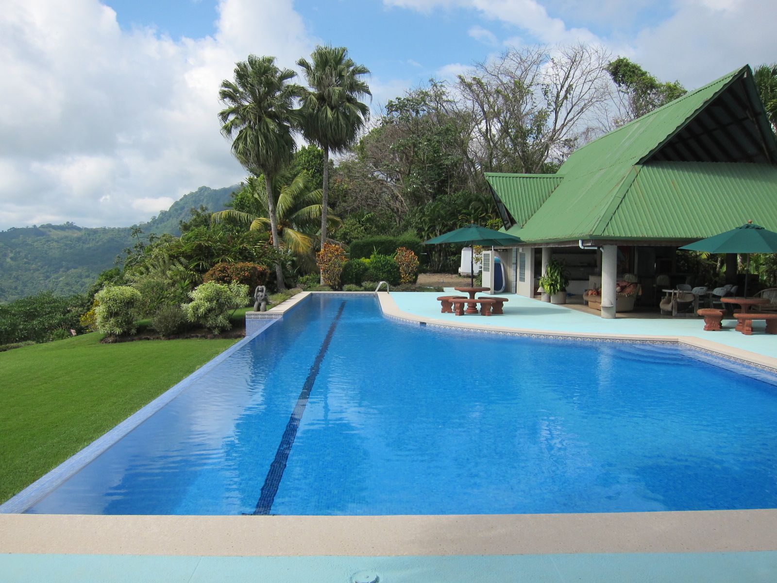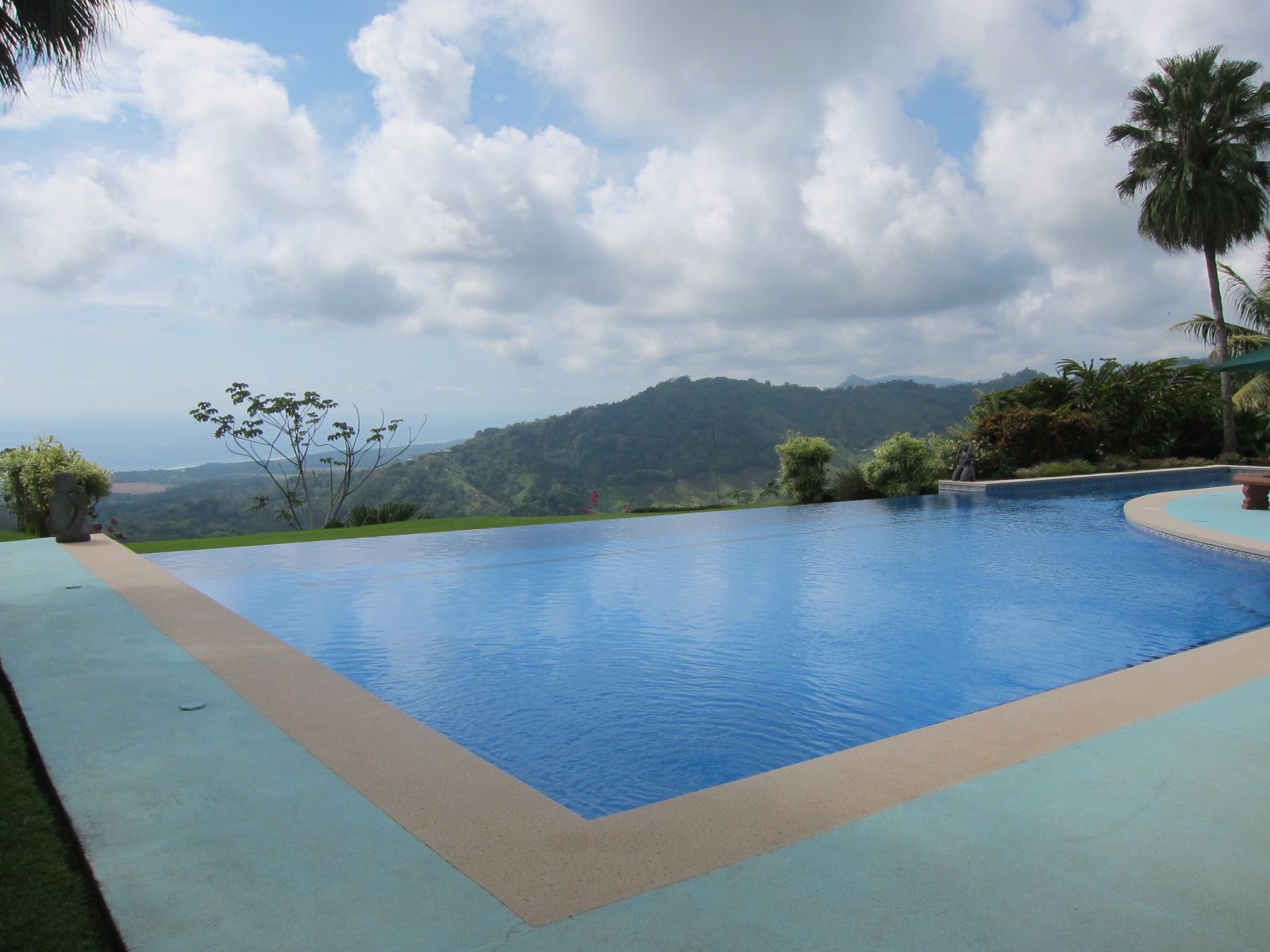 The pool is 80 feet long that drips over the edge of the hillside with ample room for larger entertainment events.