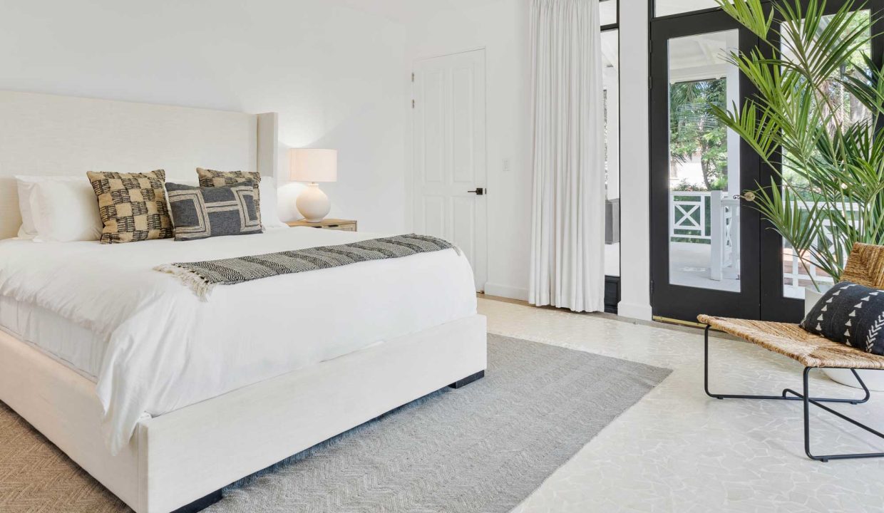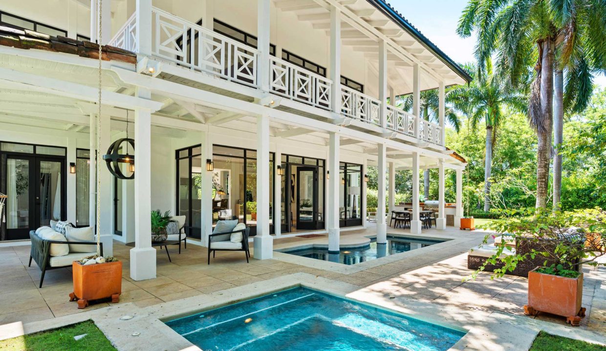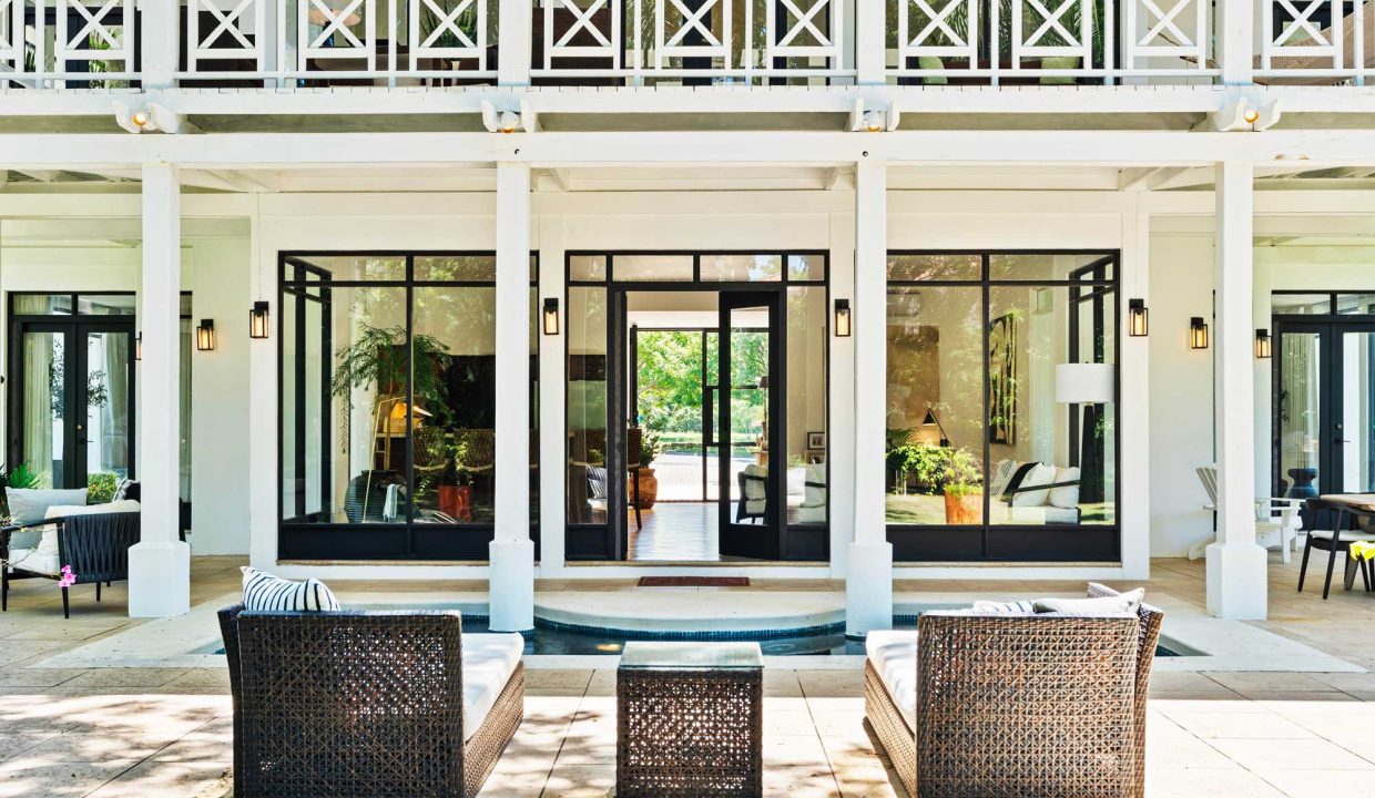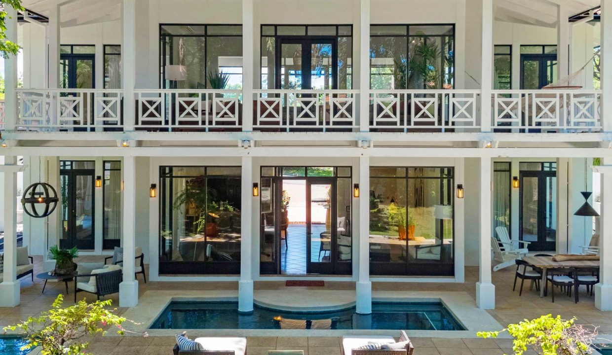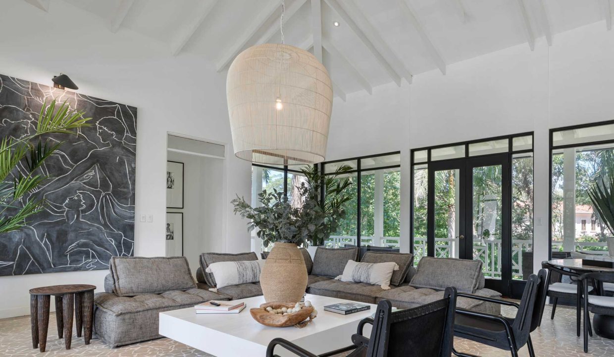 Crafted with premium materials, the home features high design, artisan ironwork, native hardwoods, and over 7,000 sq. ft. of covered living space. Designed with versatility in mind, the main property houses four master bedrooms and an Apartment. It features lovely tropical plantation-style architecture with hurricane shutters and a style that blends classic charm with contemporary elegance. Its symmetrical design creates a balanced and visually appealing facade, with central doors and windows framed by wide, uniform columns. This symmetry not only enhances the aesthetic appeal but also contributes to the home’s timeless allure. This interior design embodies a contemporary tropical design characterized by its use of natural materials, neutral tones, and a strong connection to the surrounding environment. The vaulted ceilings with exposed white-washed beams create an open and airy feel, enhancing the spaciousness of the spaces while maintaining a clean, minimalist vibe. Modern furniture pieces balance simplicity with comfort, ensuring a luxurious yet relaxed atmosphere.