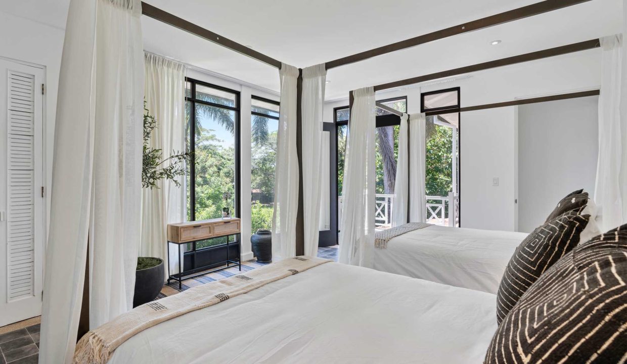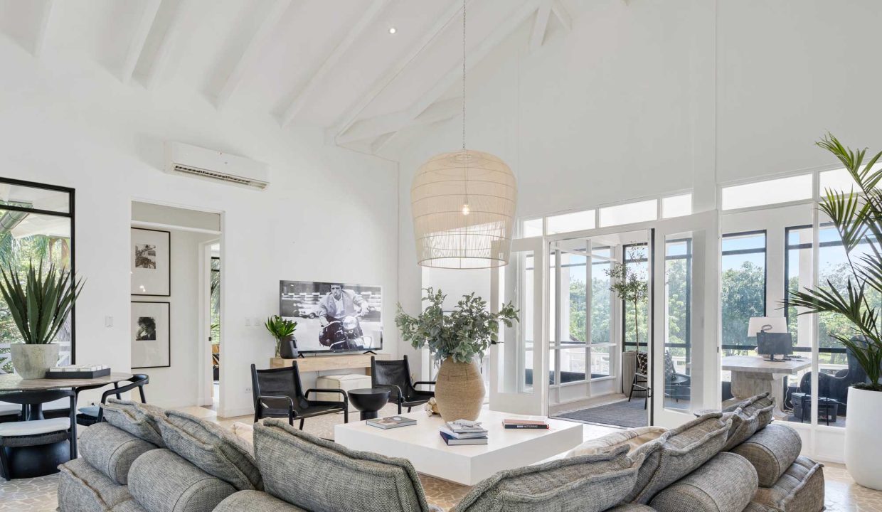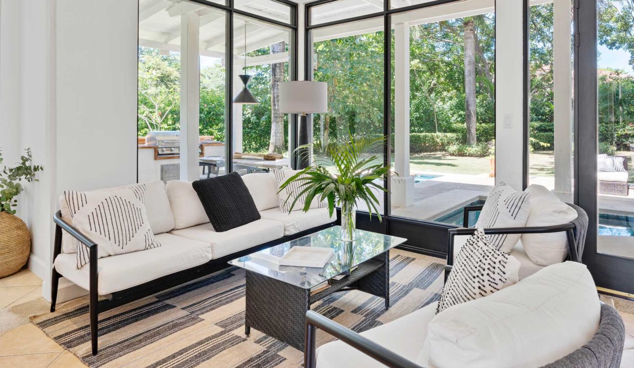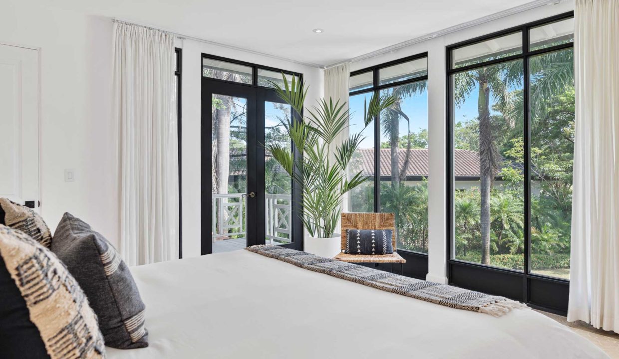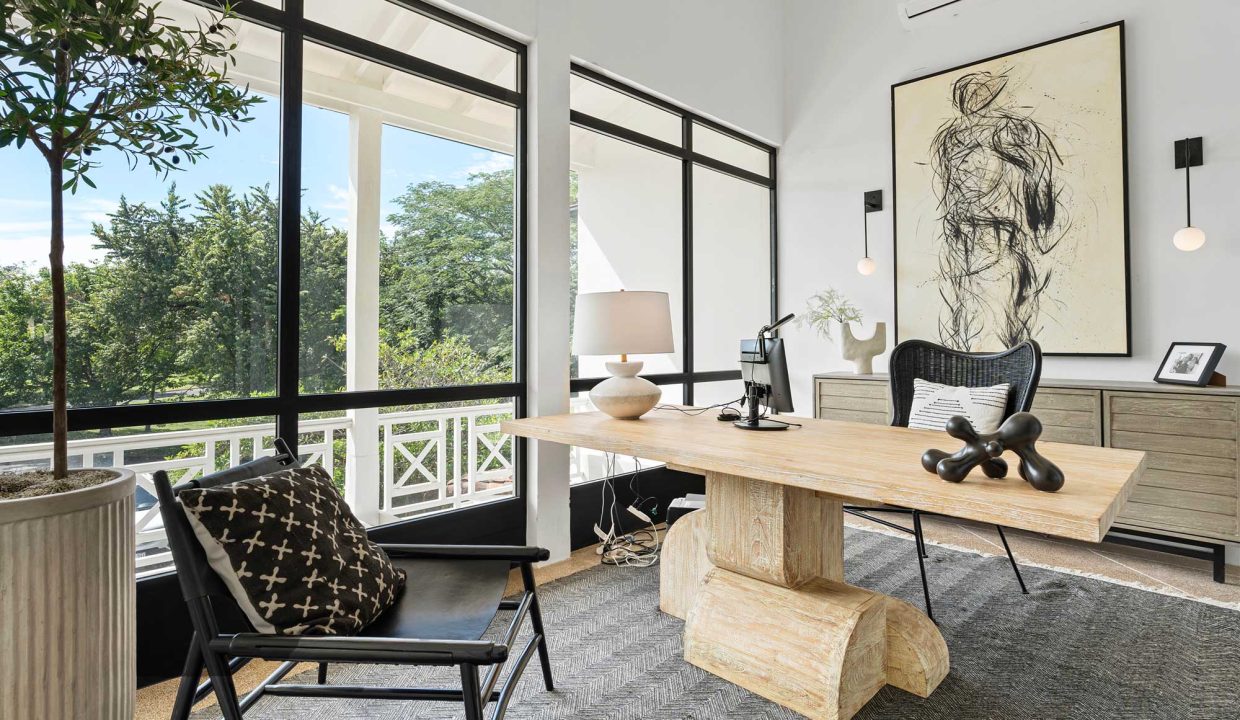 Crafted with premium materials, the home features high design, artisan ironwork, native hardwoods, and over 7,000 sq. ft. of covered living space. Designed with versatility in mind, the main property houses four master bedrooms and an Apartment. It features lovely tropical plantation-style architecture with hurricane shutters and a style that blends classic charm with contemporary elegance. Its symmetrical design creates a balanced and visually appealing facade, with central doors and windows framed by wide, uniform columns. This symmetry not only enhances the aesthetic appeal but also contributes to the home’s timeless allure. This interior design embodies a contemporary tropical design characterized by its use of natural materials, neutral tones, and a strong connection to the surrounding environment. The vaulted ceilings with exposed white-washed beams create an open and airy feel, enhancing the spaciousness of the spaces while maintaining a clean, minimalist vibe. Modern furniture pieces balance simplicity with comfort, ensuring a luxurious yet relaxed atmosphere.