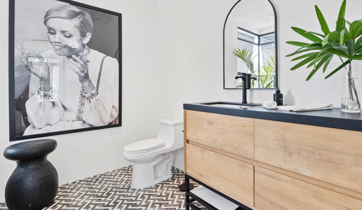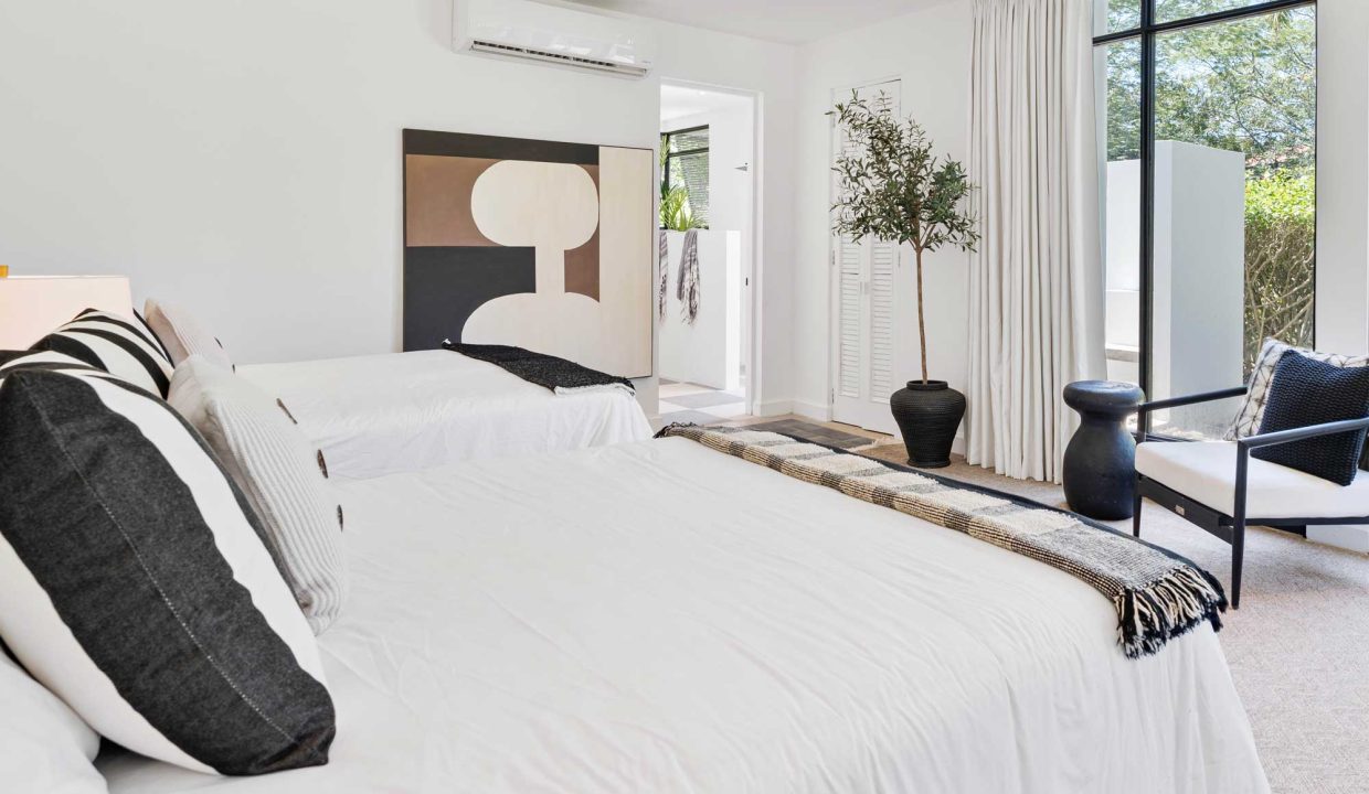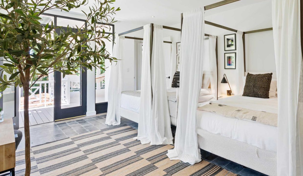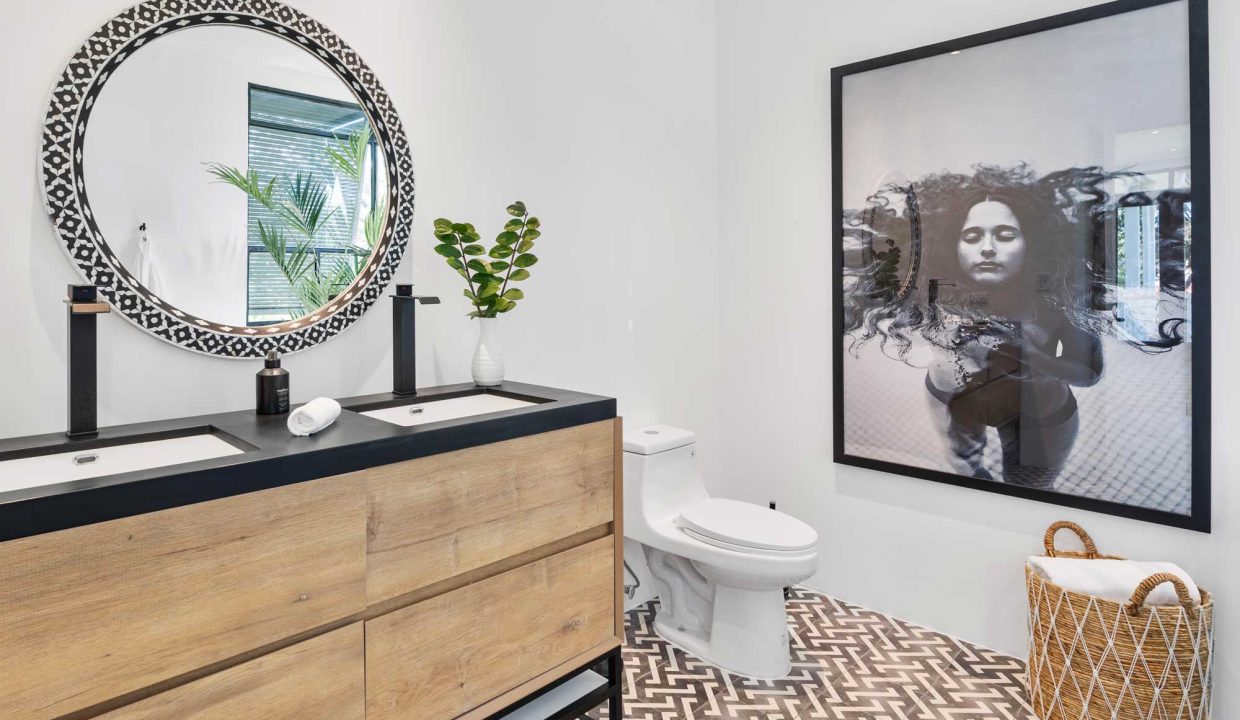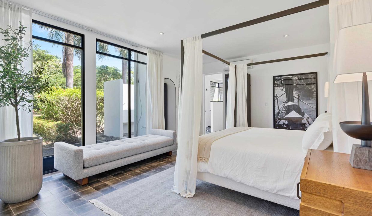 Crafted with premium materials, the home features high design, artisan ironwork, native hardwoods, and over 7,000 sq. ft. of covered living space. Designed with versatility in mind, the main property houses four master bedrooms and an Apartment. It features lovely tropical plantation-style architecture with hurricane shutters and a style that blends classic charm with contemporary elegance. Its symmetrical design creates a balanced and visually appealing facade, with central doors and windows framed by wide, uniform columns. This symmetry not only enhances the aesthetic appeal but also contributes to the home’s timeless allure. This interior design embodies a contemporary tropical design characterized by its use of natural materials, neutral tones, and a strong connection to the surrounding environment. The vaulted ceilings with exposed white-washed beams create an open and airy feel, enhancing the spaciousness of the spaces while maintaining a clean, minimalist vibe. Modern furniture pieces balance simplicity with comfort, ensuring a luxurious yet relaxed atmosphere.