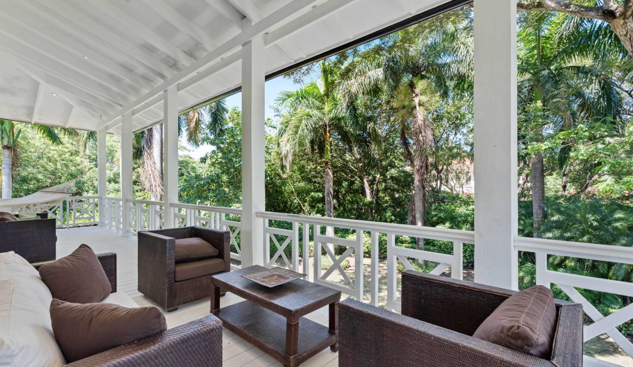 The upper level is defined by a spacious wraparound balcony with decorative railings, offering an inviting space to enjoy the outdoors. Large covered verandas provide open-air living and perfectly complement the tropical surroundings. Large, floor-to-ceiling windows dominate the design, allowing natural light to flood the interior Living Room and adjoining office while offering views of the lush, mature landscaping.