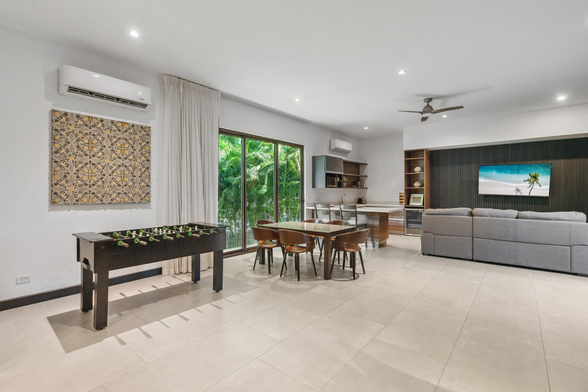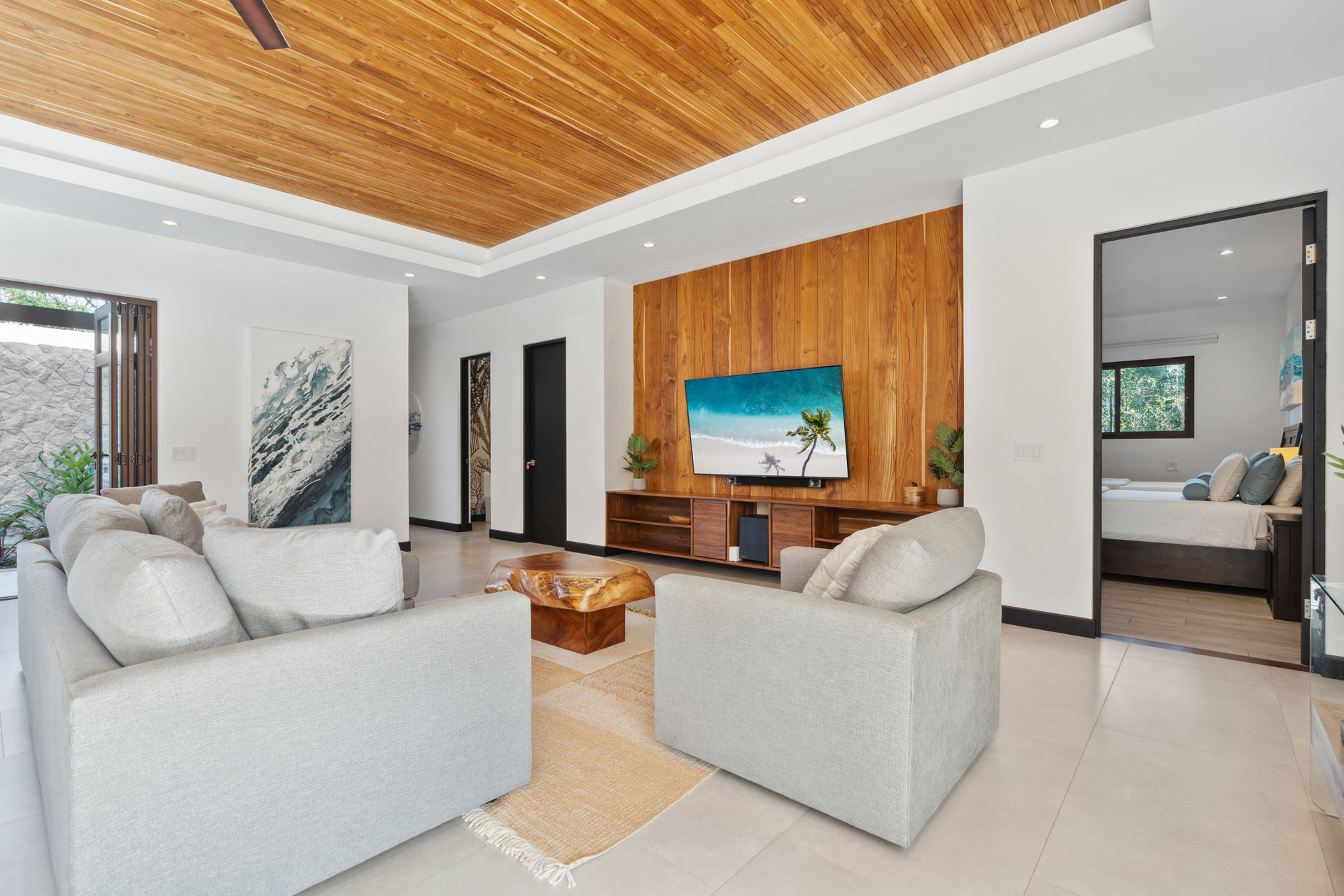 Behind a private white-stone entry wall, a beautifully landscaped courtyard welcomes you with the calming echo of water features. These tranquil sounds carry throughout the home as 30-foot bi-folding doors open on both sides of the grand living space, inviting in natural light and fresh ocean breezes. At the heart of the residence lies a stunning open-concept living and dining area, highlighted by teak-inlaid ceilings, warm ambient lighting, and panoramic views of the shimmering pool and tropical gardens. The design masterfully blends natural stone, rich wood textures, and water elements, achieving an effortless connection between indoor and outdoor living—a hallmark of refined tropical elegance.