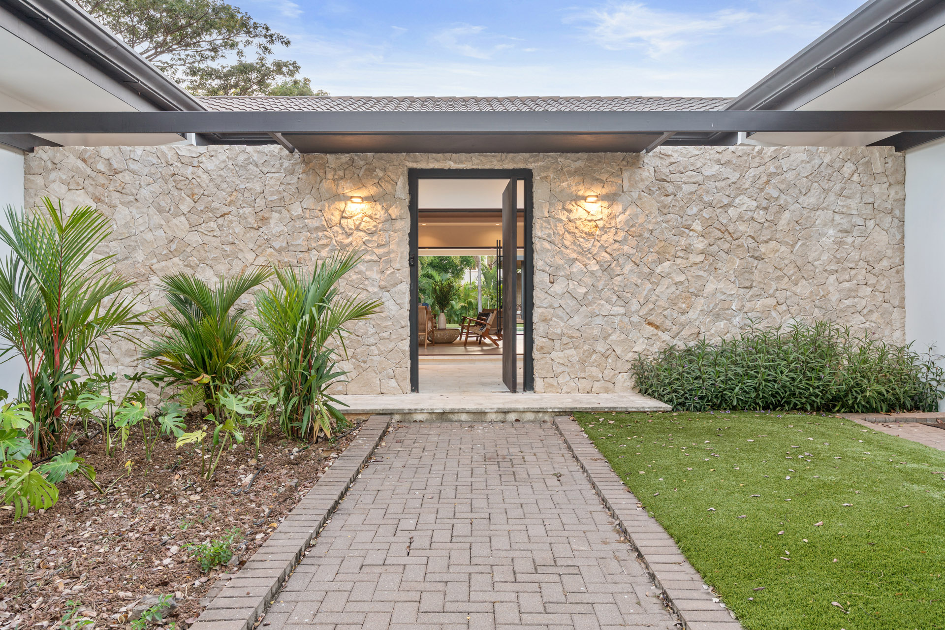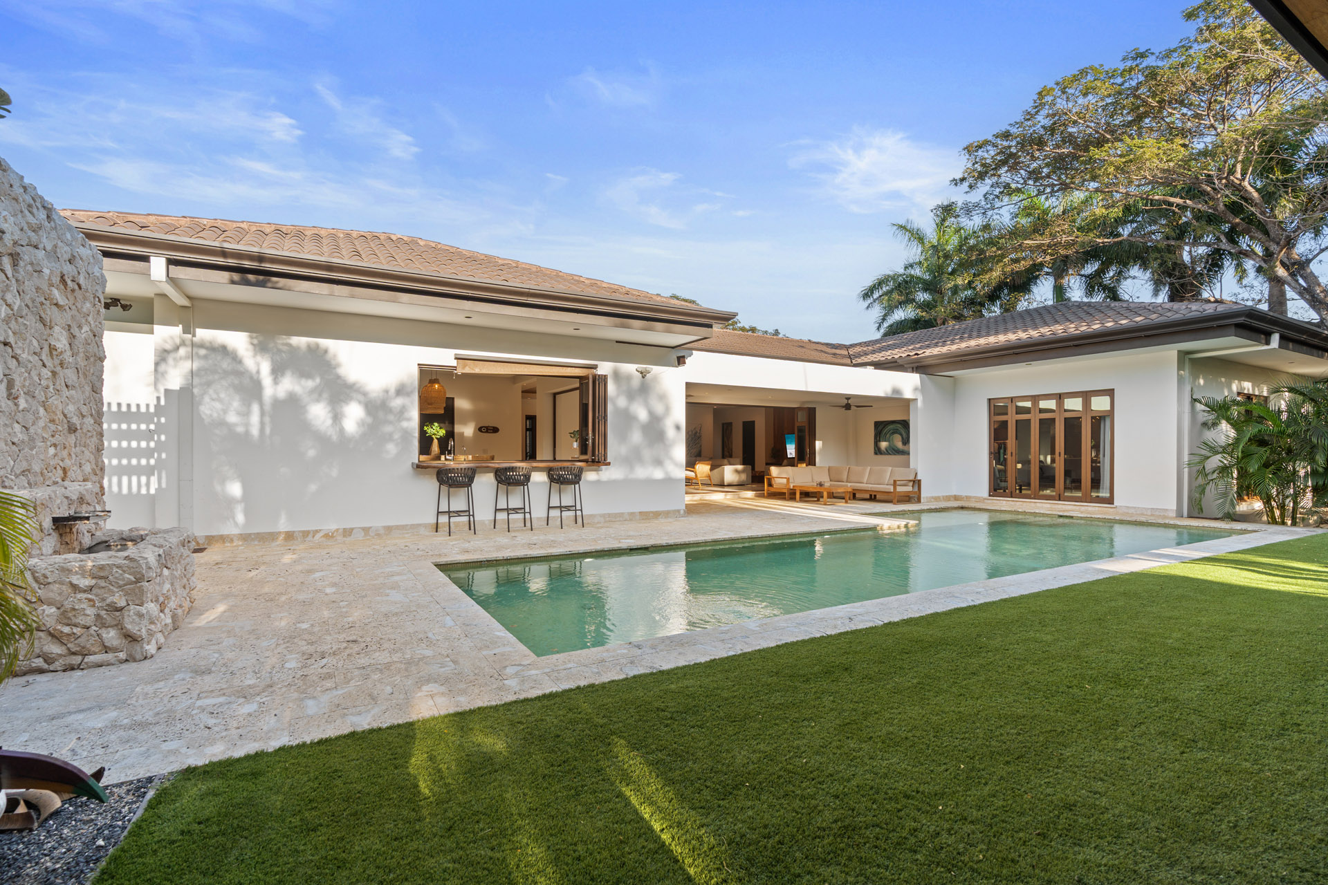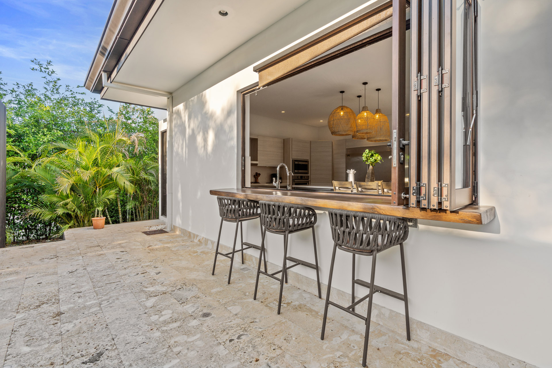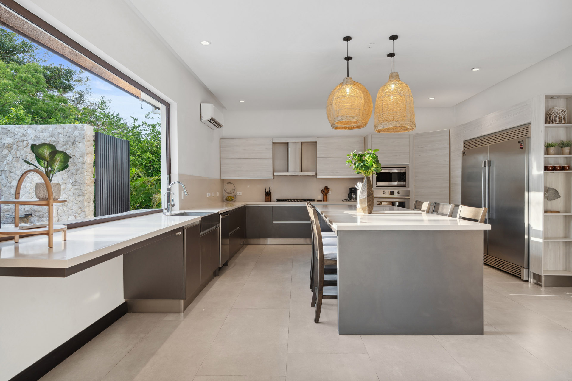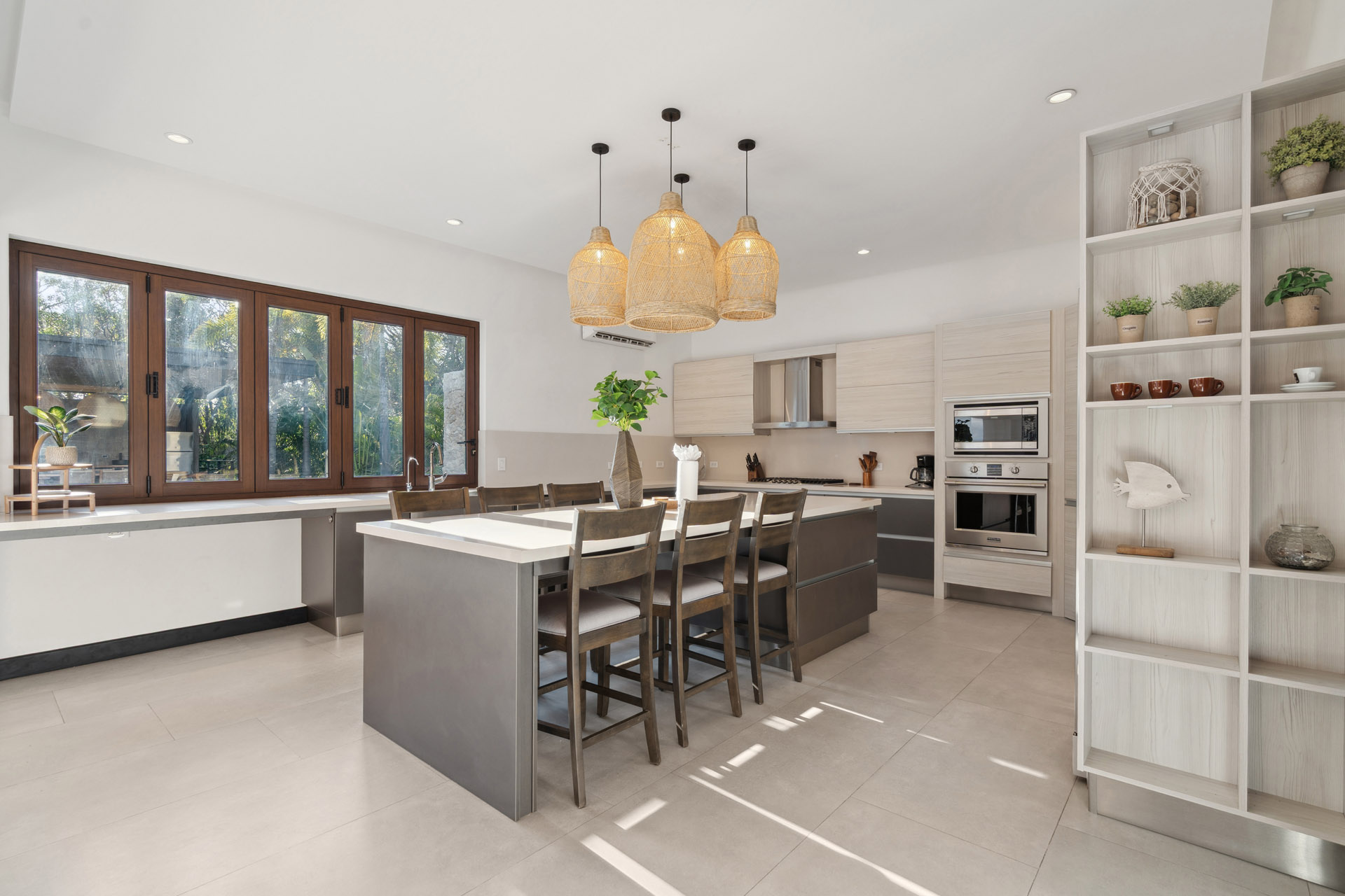 The gourmet kitchen is both functional and visually striking. Designed for effortless entertaining, it features bi-fold countertop windows that open to the poolside bar, a spacious central island, professional-grade appliances including a double-width refrigerator and gas cooktop, and extensive cabinetry that maintains a sleek, modern aesthetic.