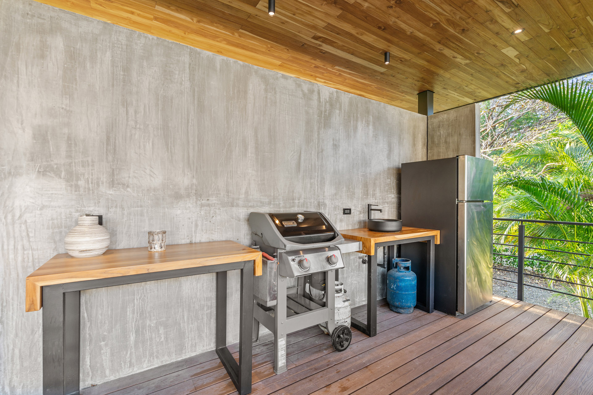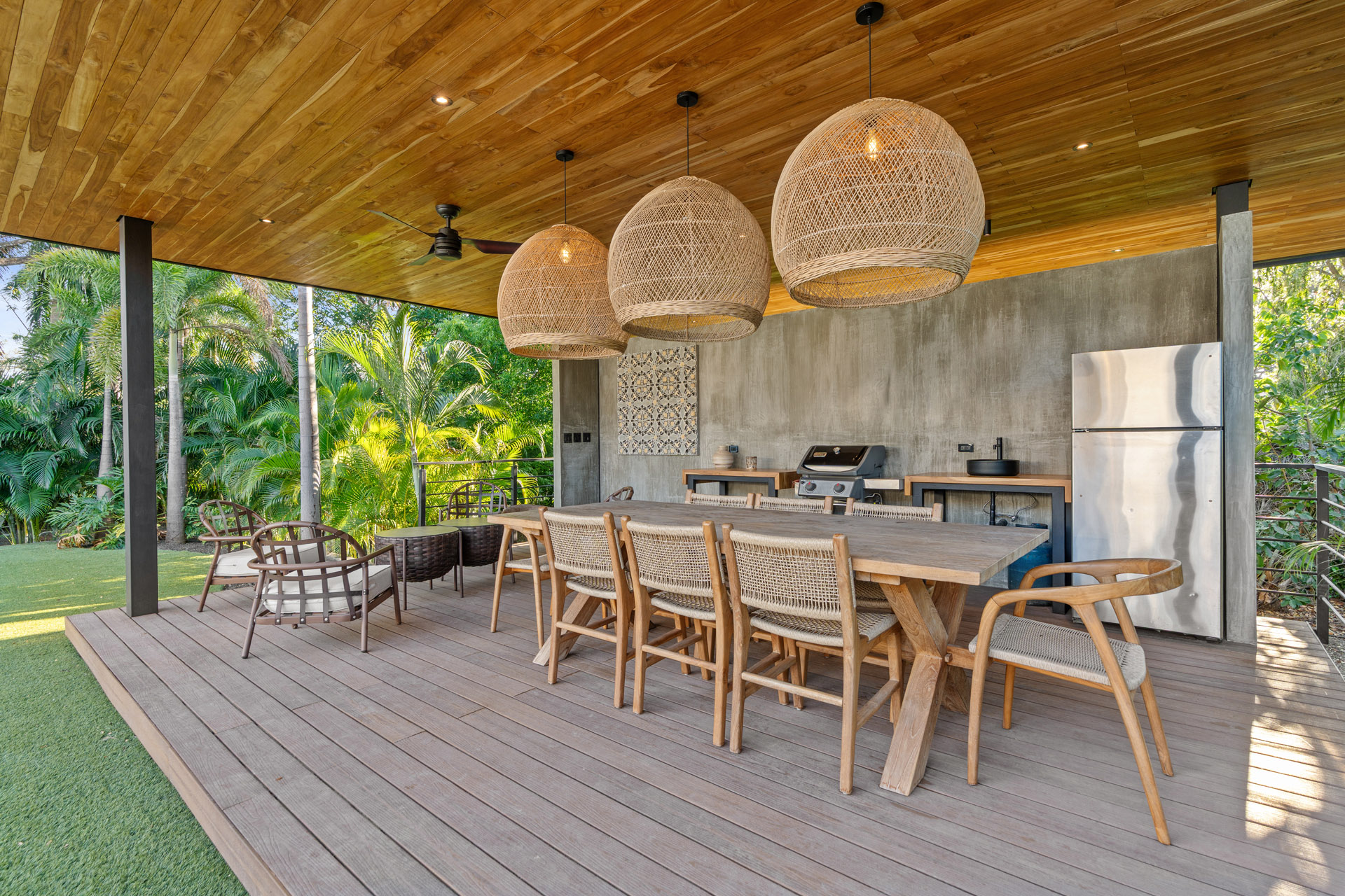 Outdoors, a tranquil oasis awaits. A shaded terrace opens to the natural green-toned pool surrounded by a Coralina stone deck that remains cool beneath the tropical sun. A striking water feature set into the white-stone wall enhances the relaxing atmosphere. The expansive BBQ rancho offers high teak ceilings, full barbecue setup, refrigerator, dining area, and abundant seating—perfect for gathering with family and friends. Completing the experience is a private wellness retreat with a sauna and ice bath, plus a charming orchard of citrus and fruit trees that celebrates Costa Rica’s natural bounty.