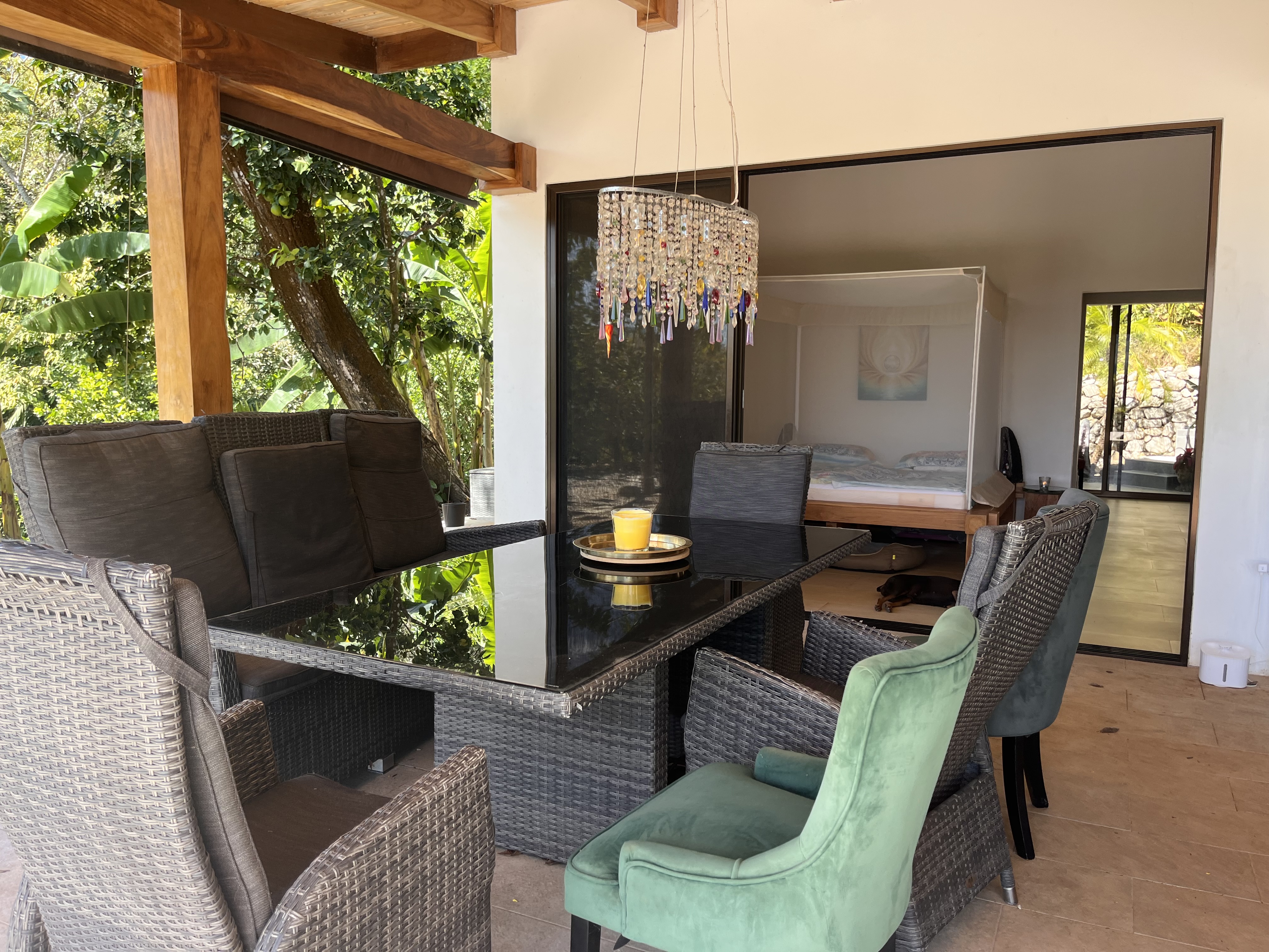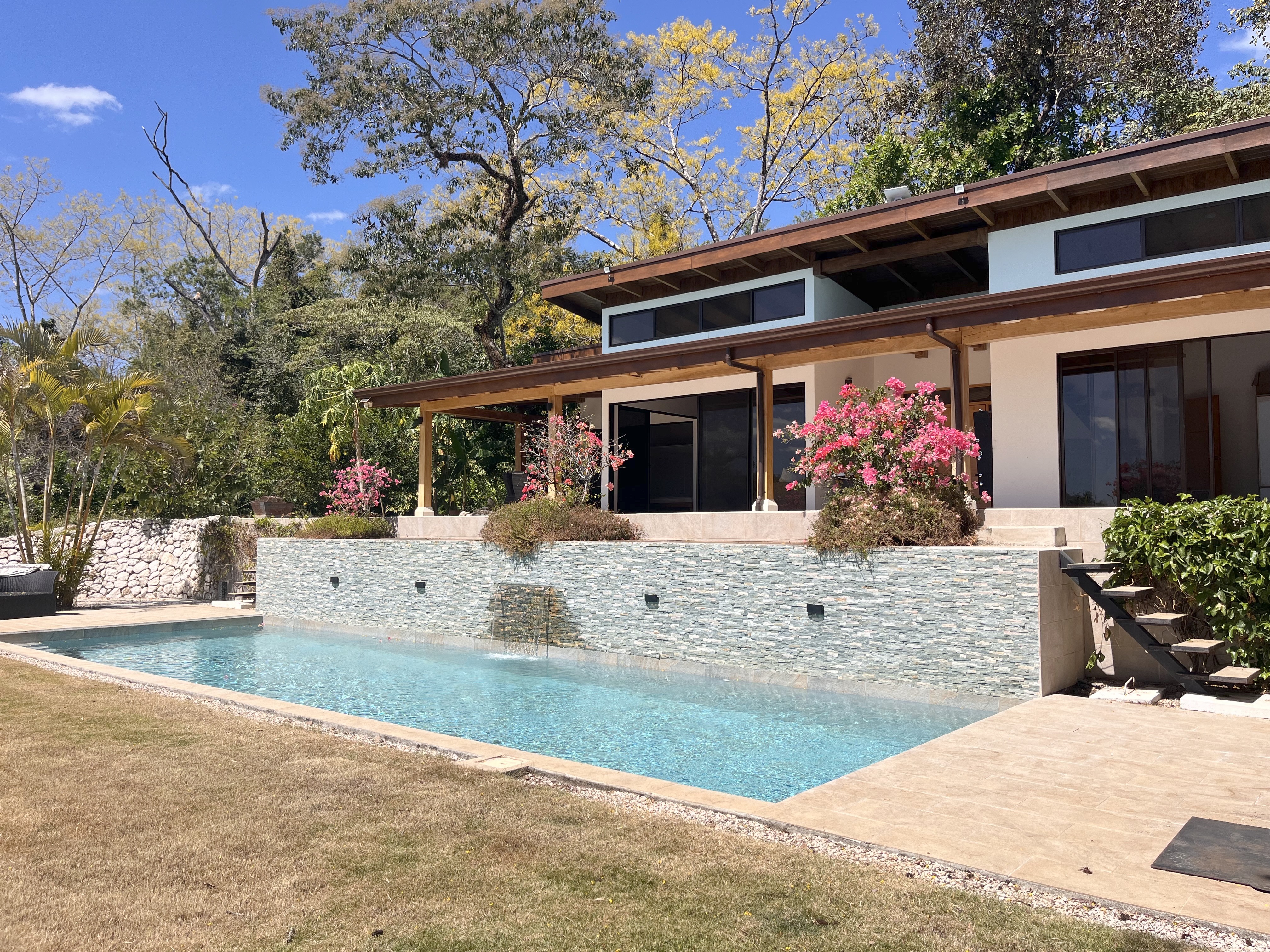 The house is surrounded by beautifully landscaped tropical gardens, creating a unique microclimate and a strong connection to nature. A large 180 m² tiled terrace and a covered outdoor dining area provide ideal spaces for relaxing and entertaining. At the heart of the garden is a stunning infinity-style swimming pool with a waterfall, blending naturally into its surroundings and framed by lush vegetation. The garden also features a wide variety of fruit trees, including mandarin, orange, lemon, starfruit, papaya, banana, passion fruit, Pitahaya, and more. A remarkable five-century-old tree at the entrance of the property welcomes you upon arrival and serves as a natural landmark, adding character and shade.
