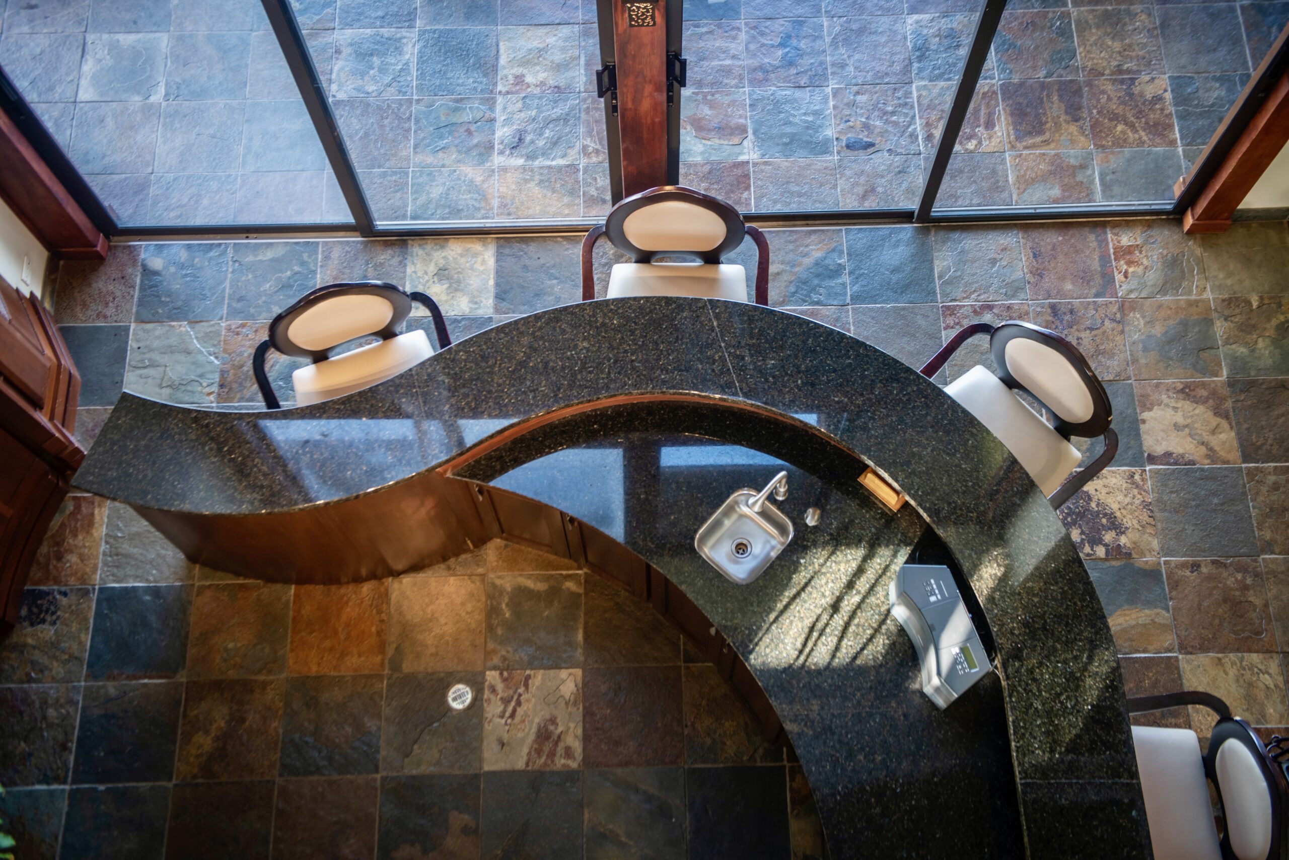 Upon entering the home, you're welcomed by a spacious open-concept living area featuring vaulted ceilings with beautiful wood detailing. The contemporary living room flows seamlessly into a gourmet kitchen complete with a natural stone island, custom wooden cabinetry, and top-of-the-line appliances — ideal for both intimate family meals and lavish entertaining.