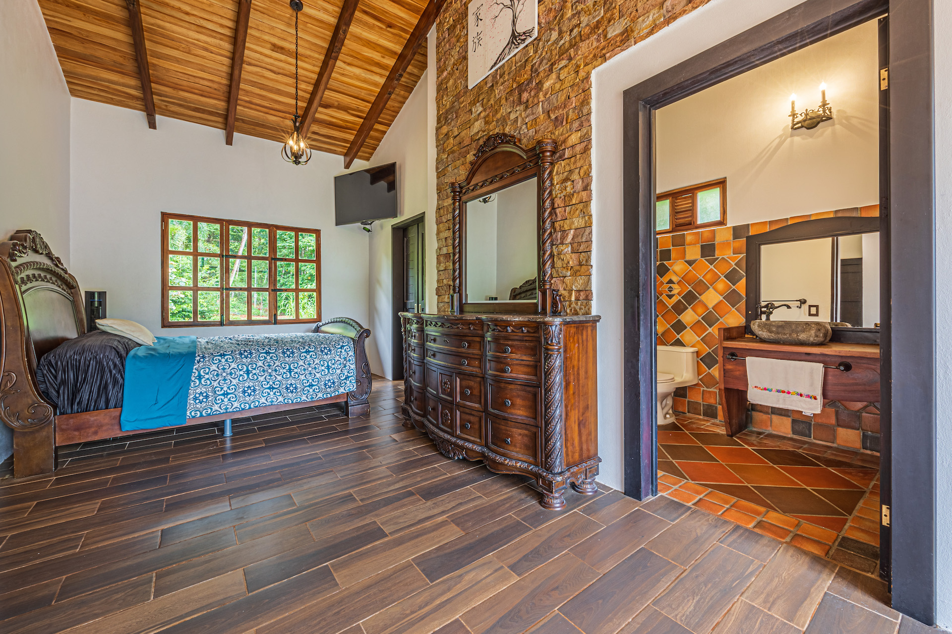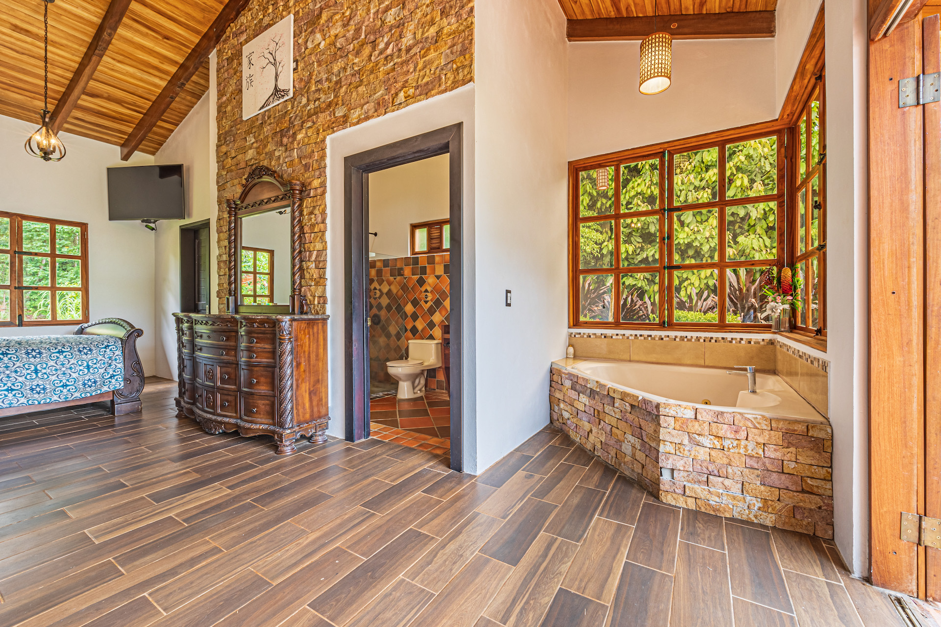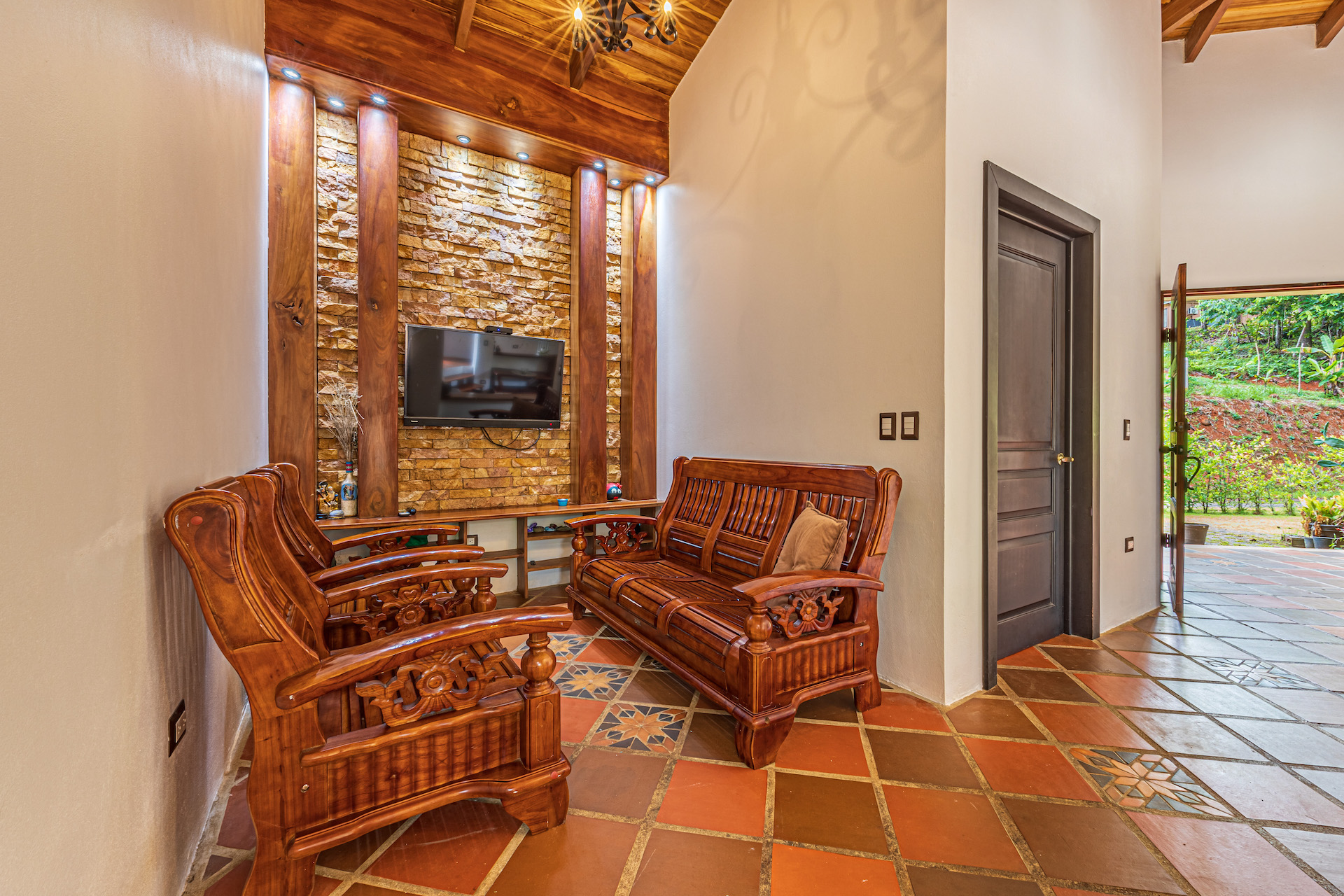 The TV area showcases the famous and beautiful wood found in Costa Rica, infusing the space with warmth and showcasing the country's rich natural resources. It provides a comfortable spot for entertainment and relaxation.