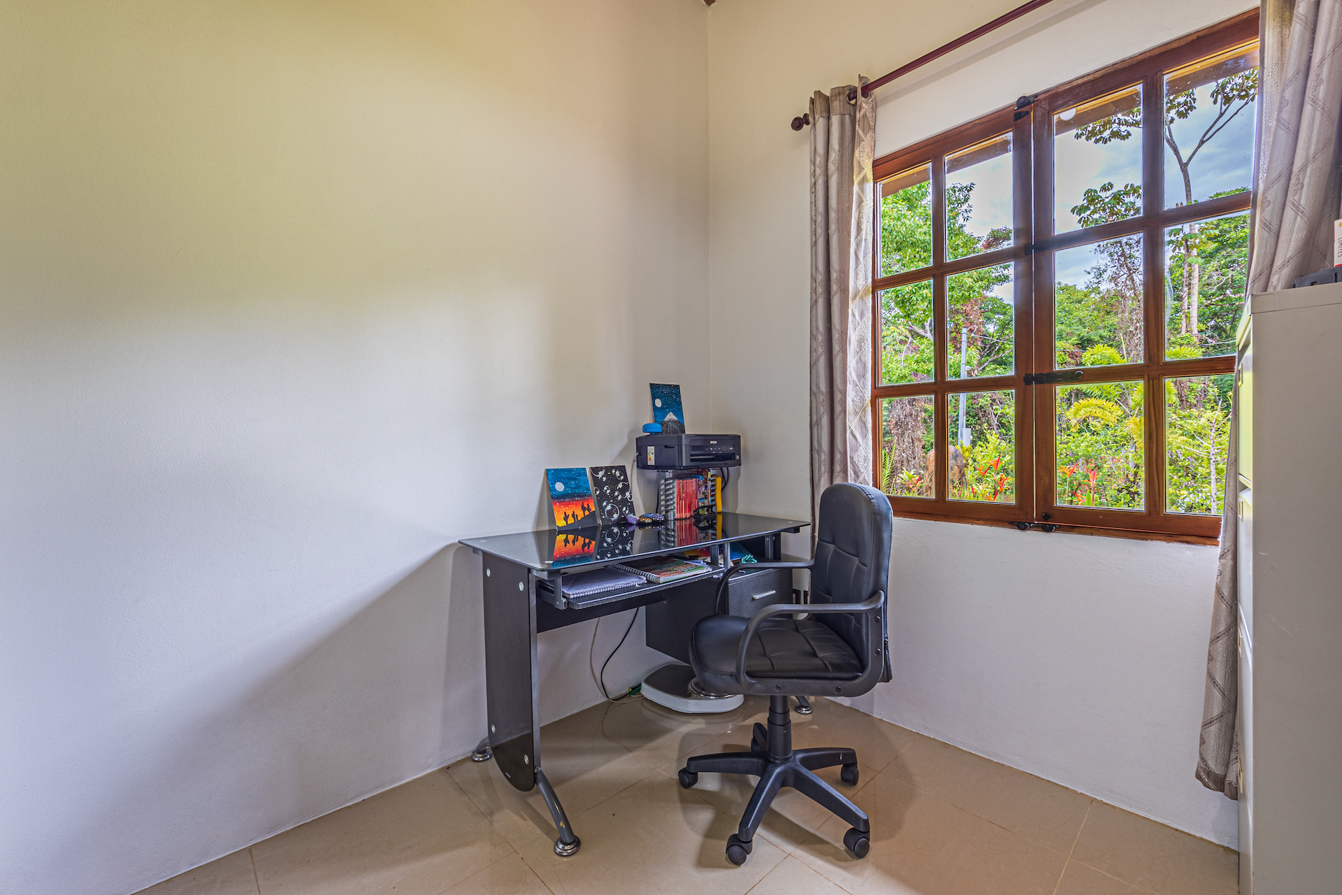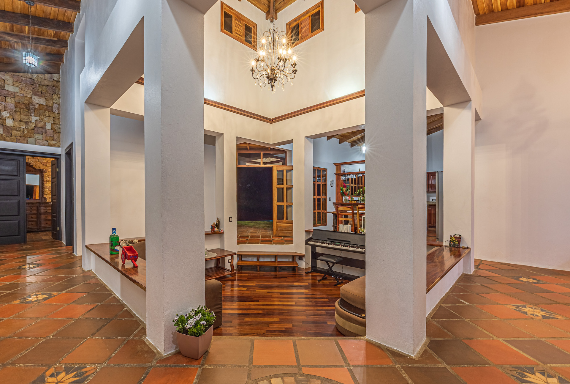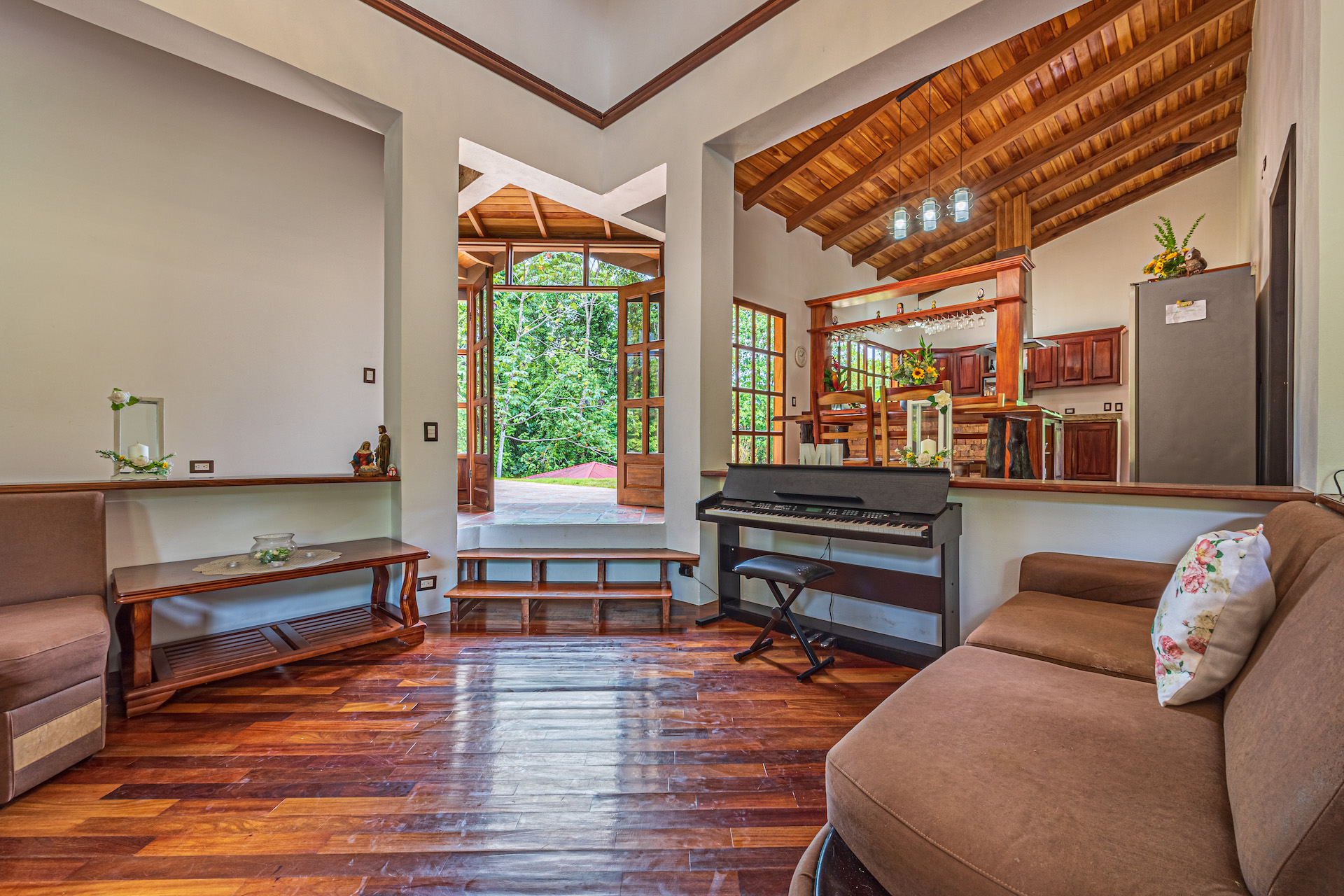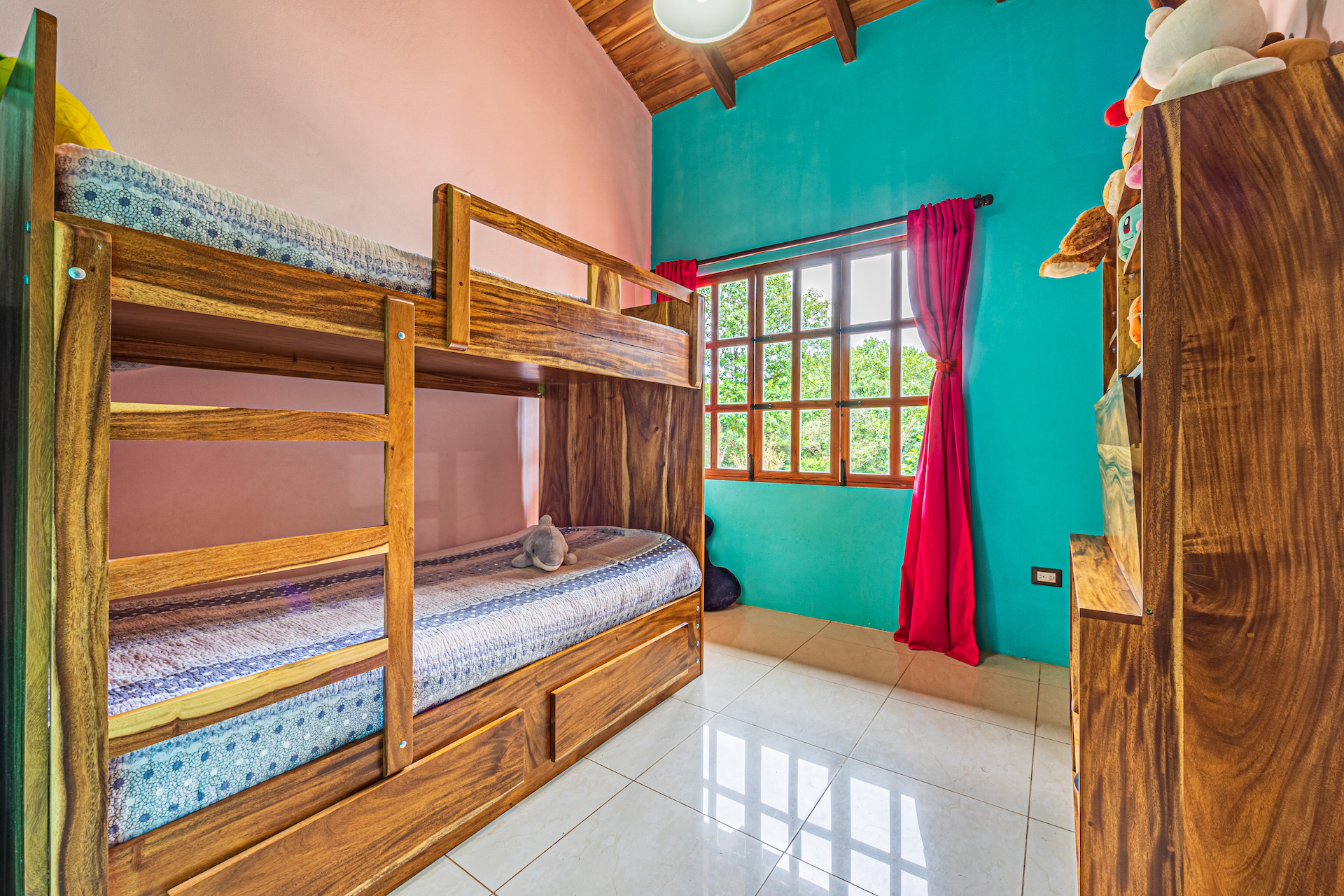The TV area showcases the famous and beautiful wood found in Costa Rica, infusing the space with warmth and showcasing the country's rich natural resources. It provides a comfortable spot for entertainment and relaxation.