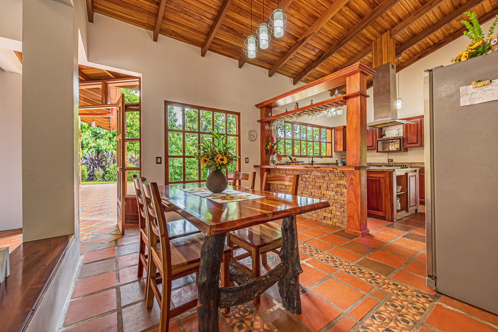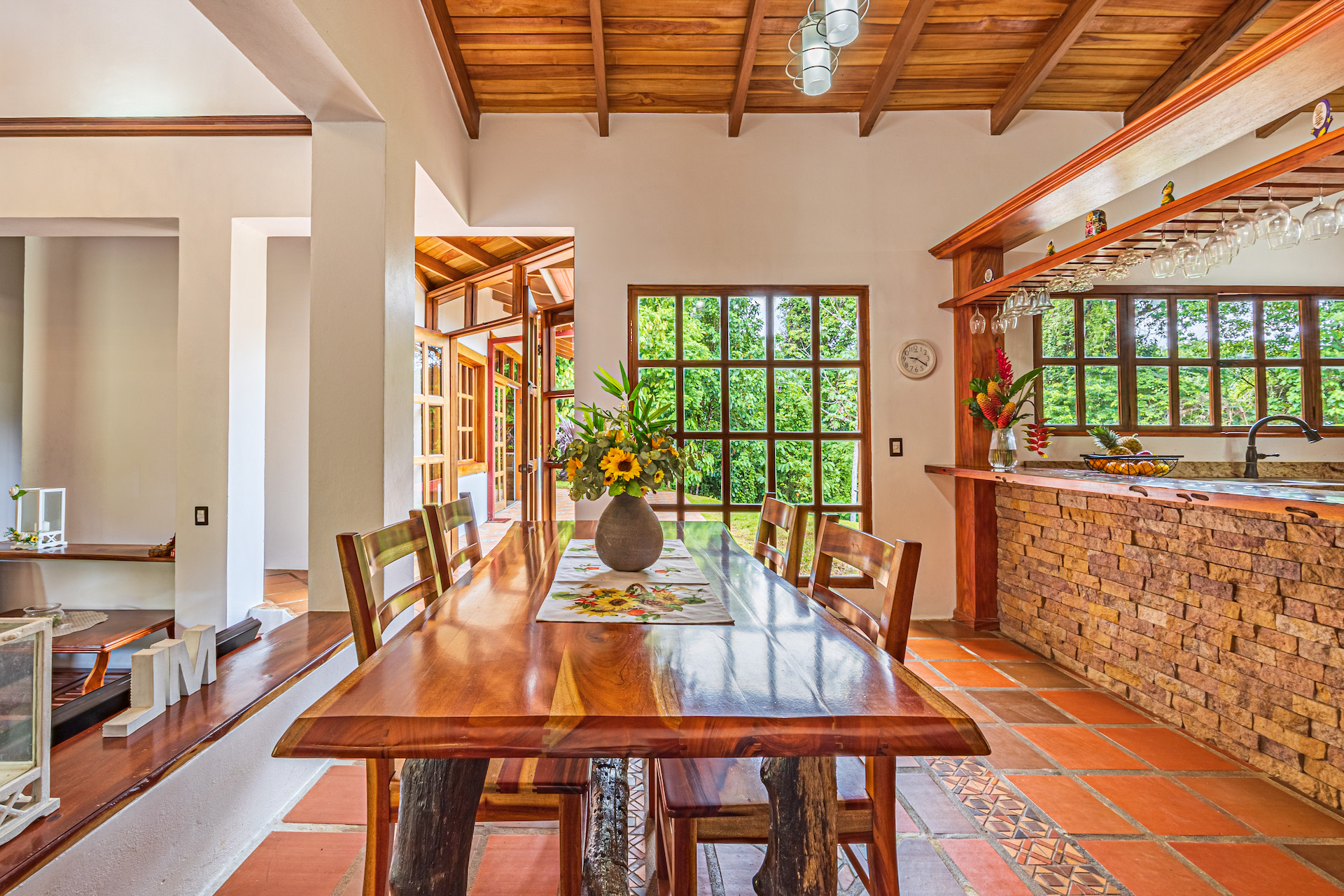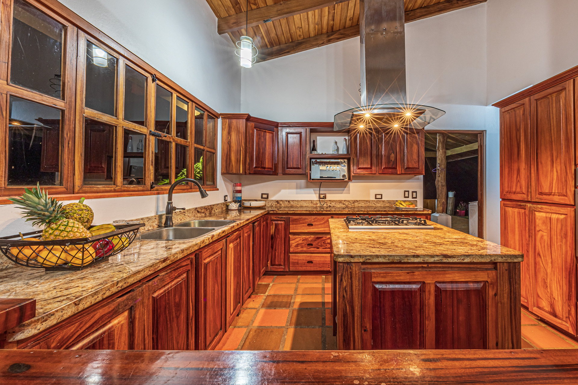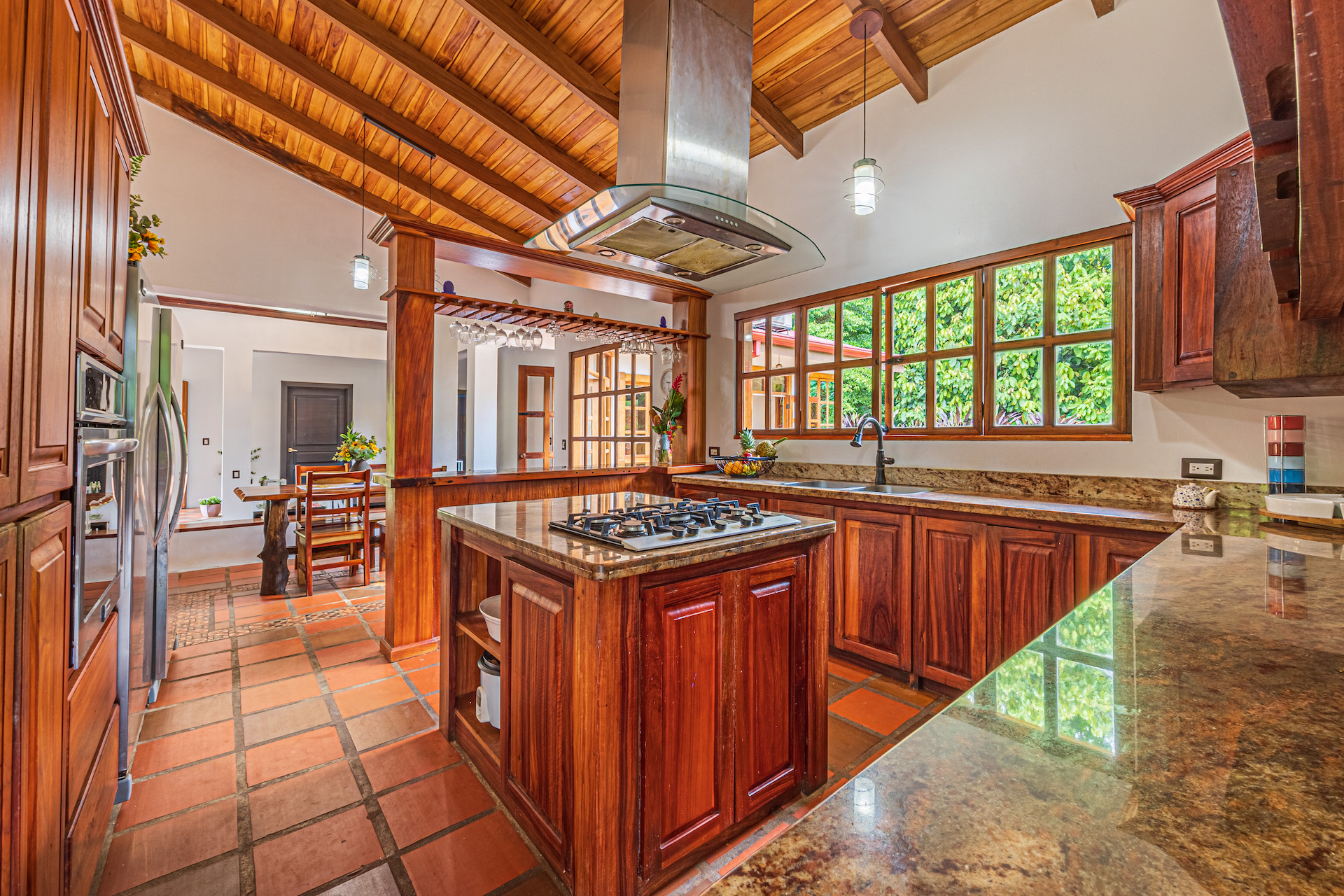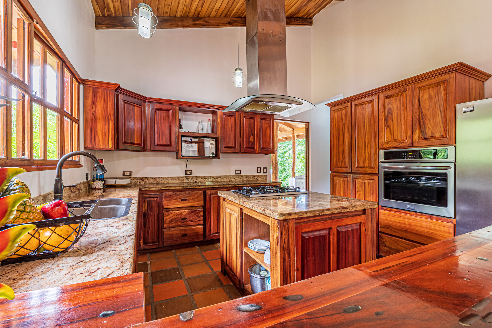 Throughout the house, you'll find exclusive wood sourced from Costa Rica, adding a touch of opulence and highlighting the natural beauty of the surroundings. The wood cabinetry and finishes further enhance the rustic charm, creating a harmonious and inviting atmosphere.