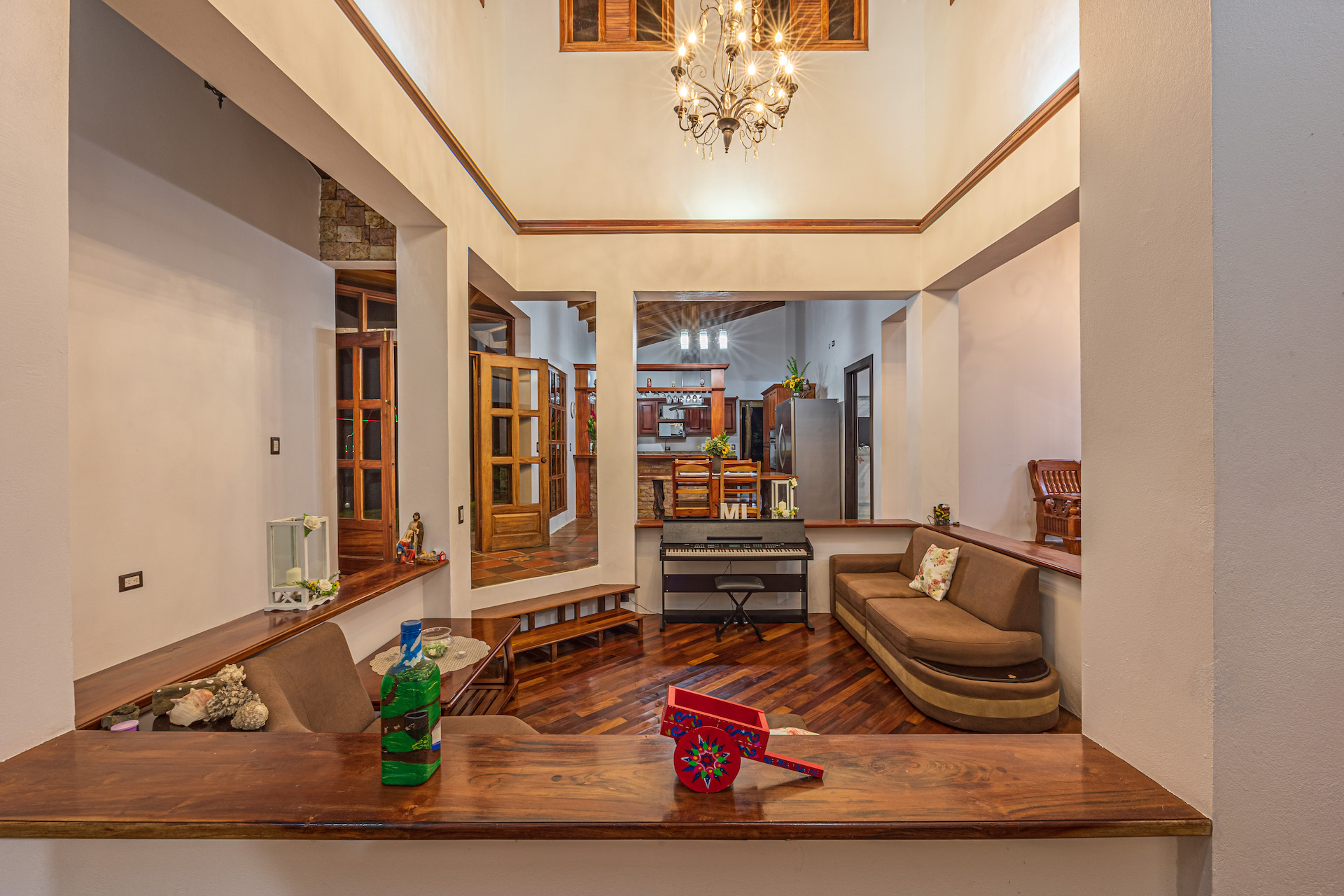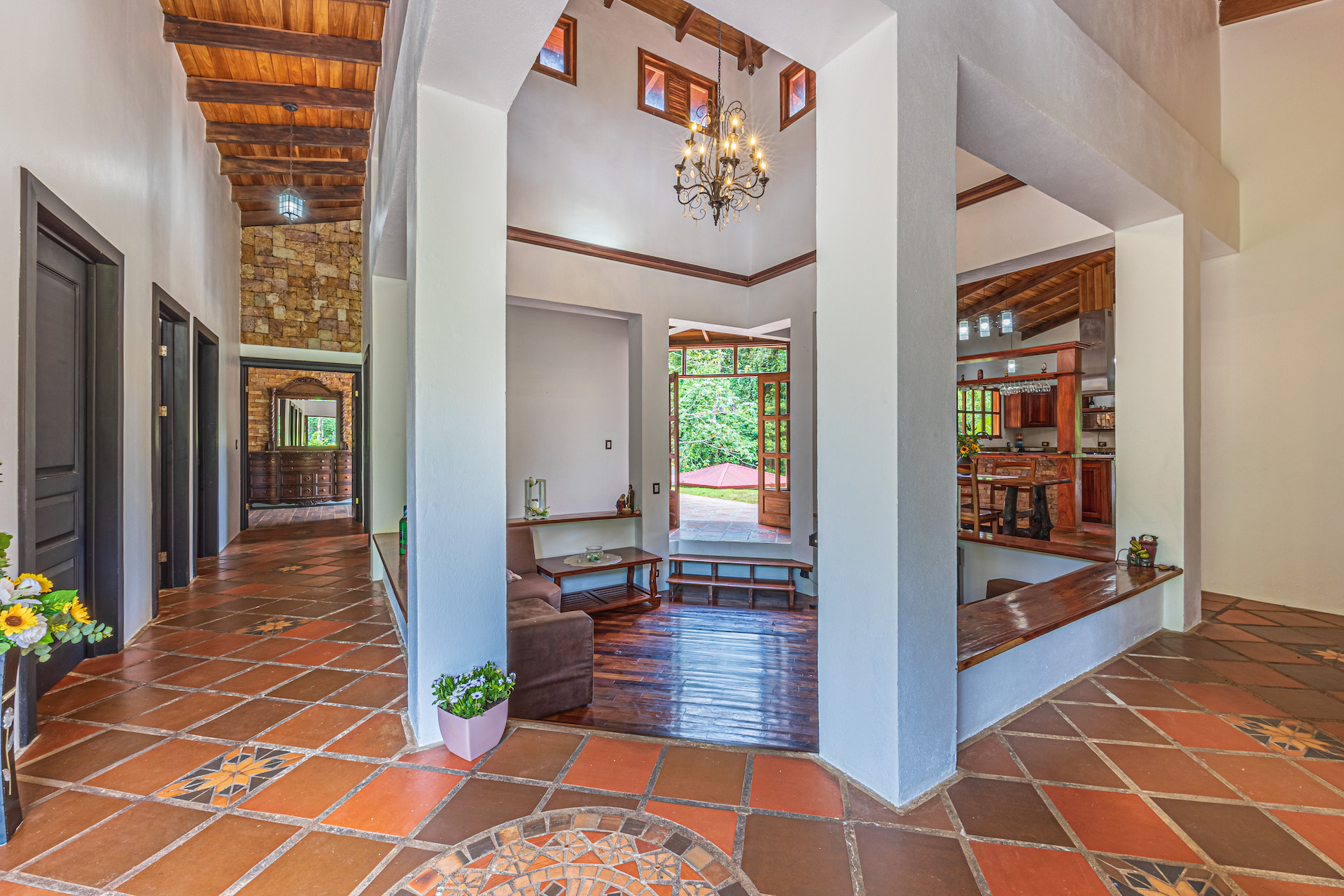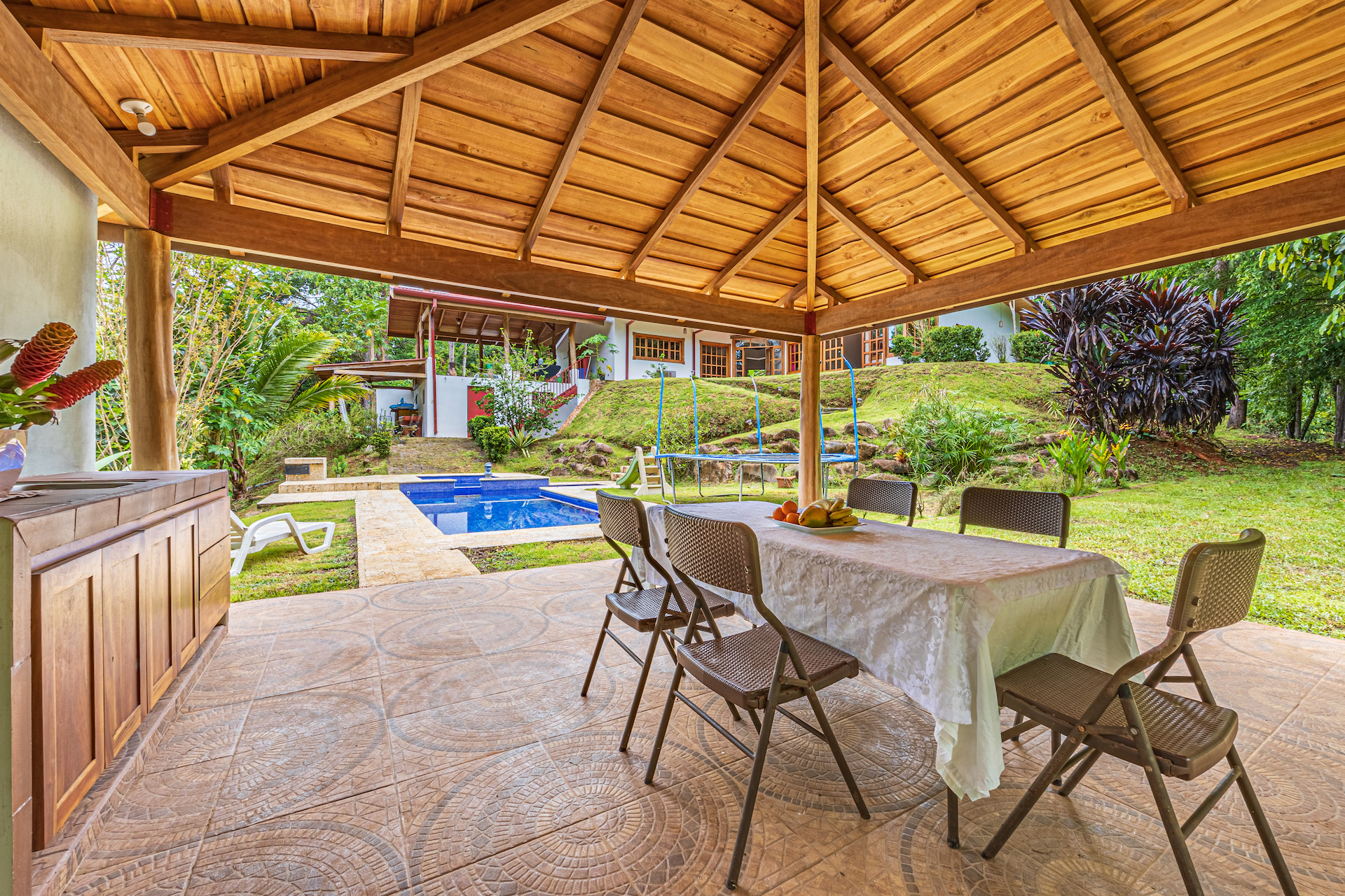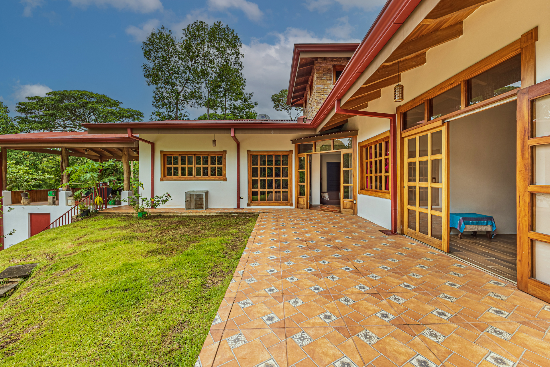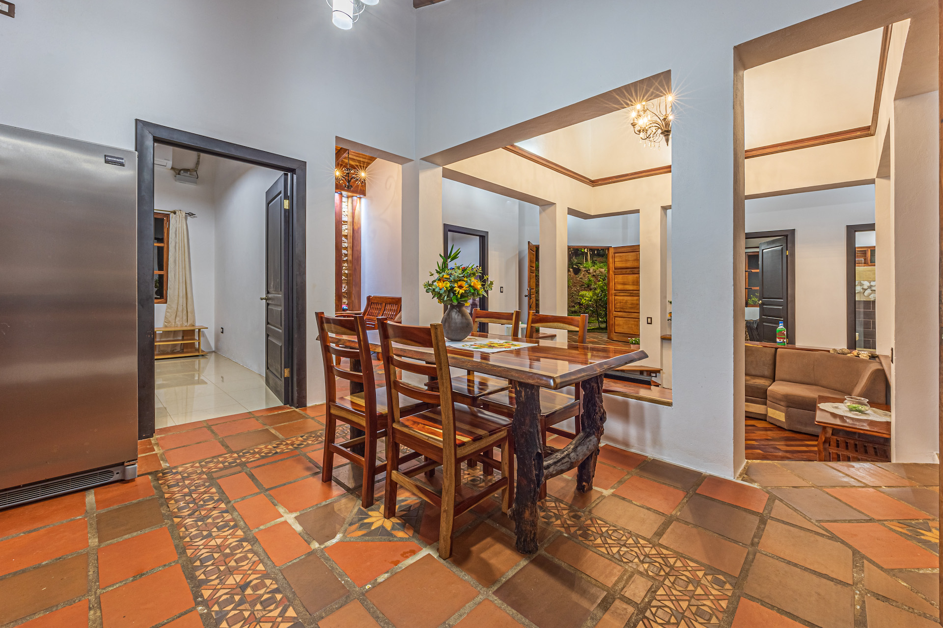 Throughout the house, you'll find exclusive wood sourced from Costa Rica, adding a touch of opulence and highlighting the natural beauty of the surroundings. The wood cabinetry and finishes further enhance the rustic charm, creating a harmonious and inviting atmosphere.