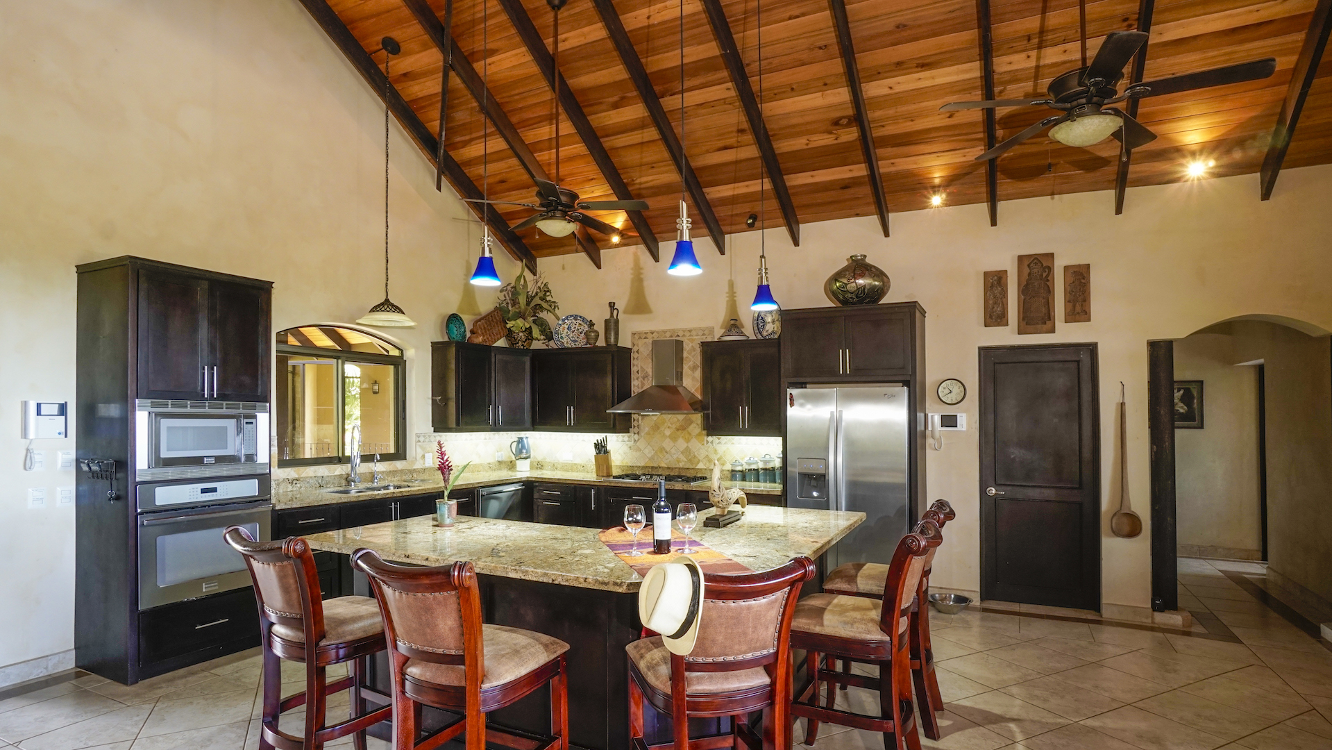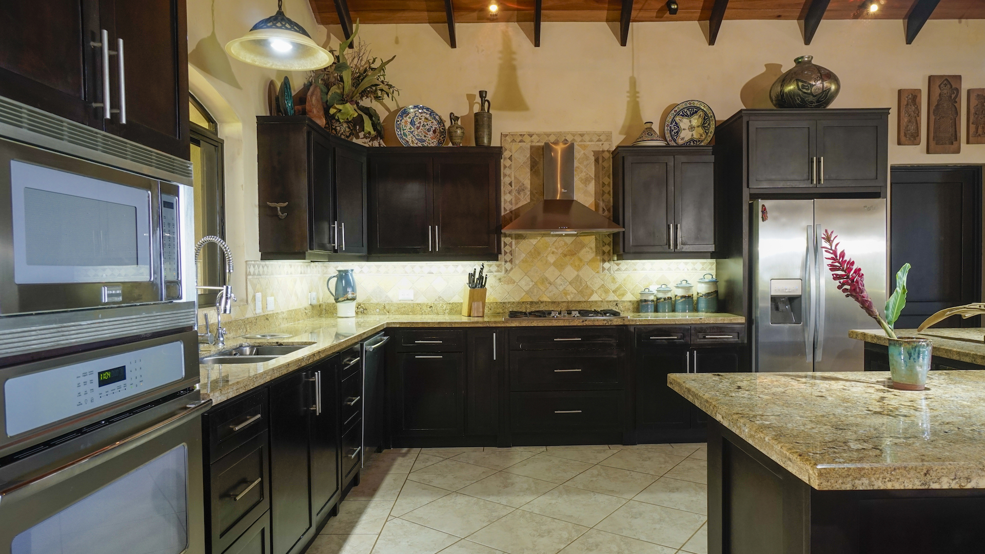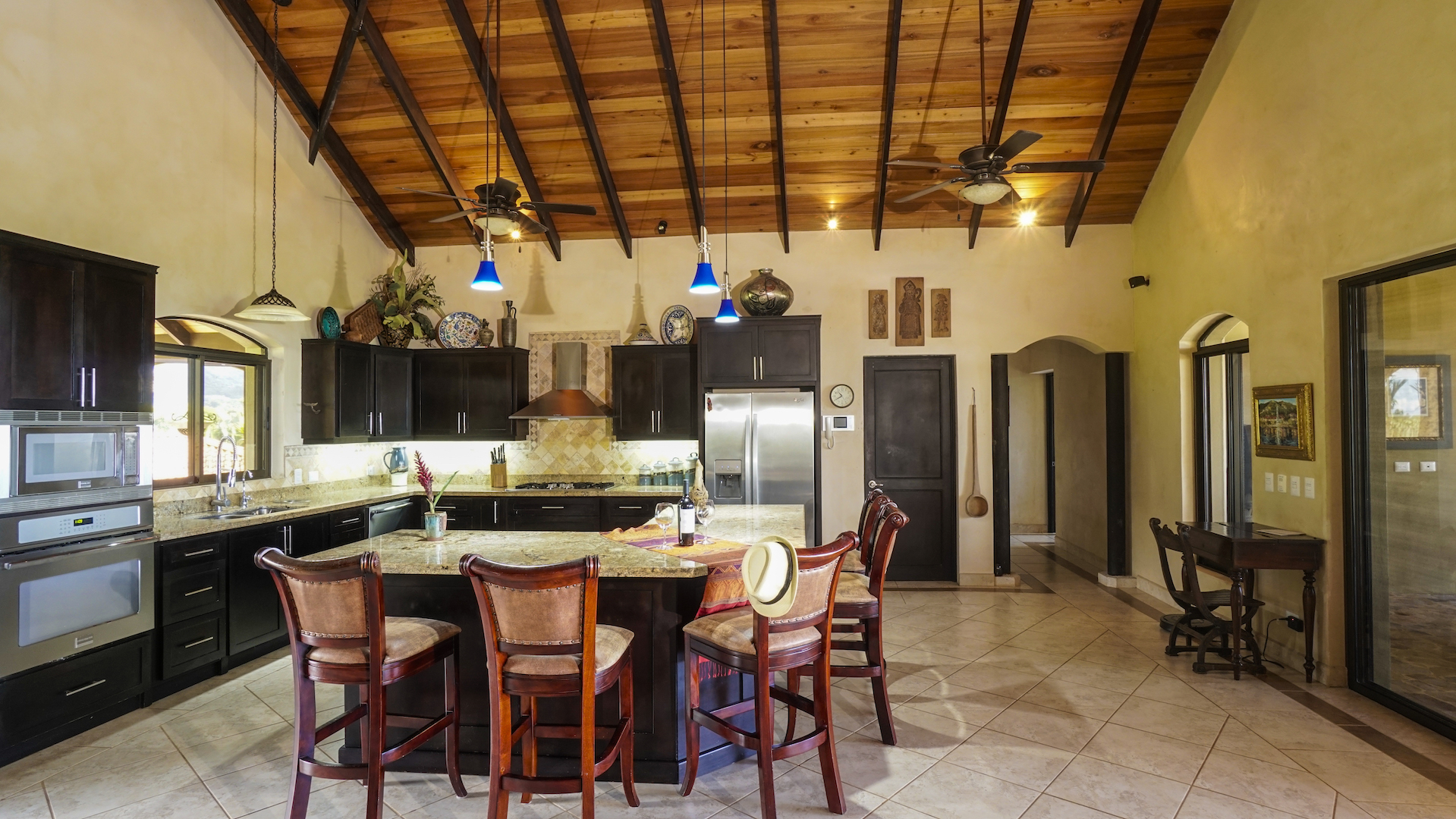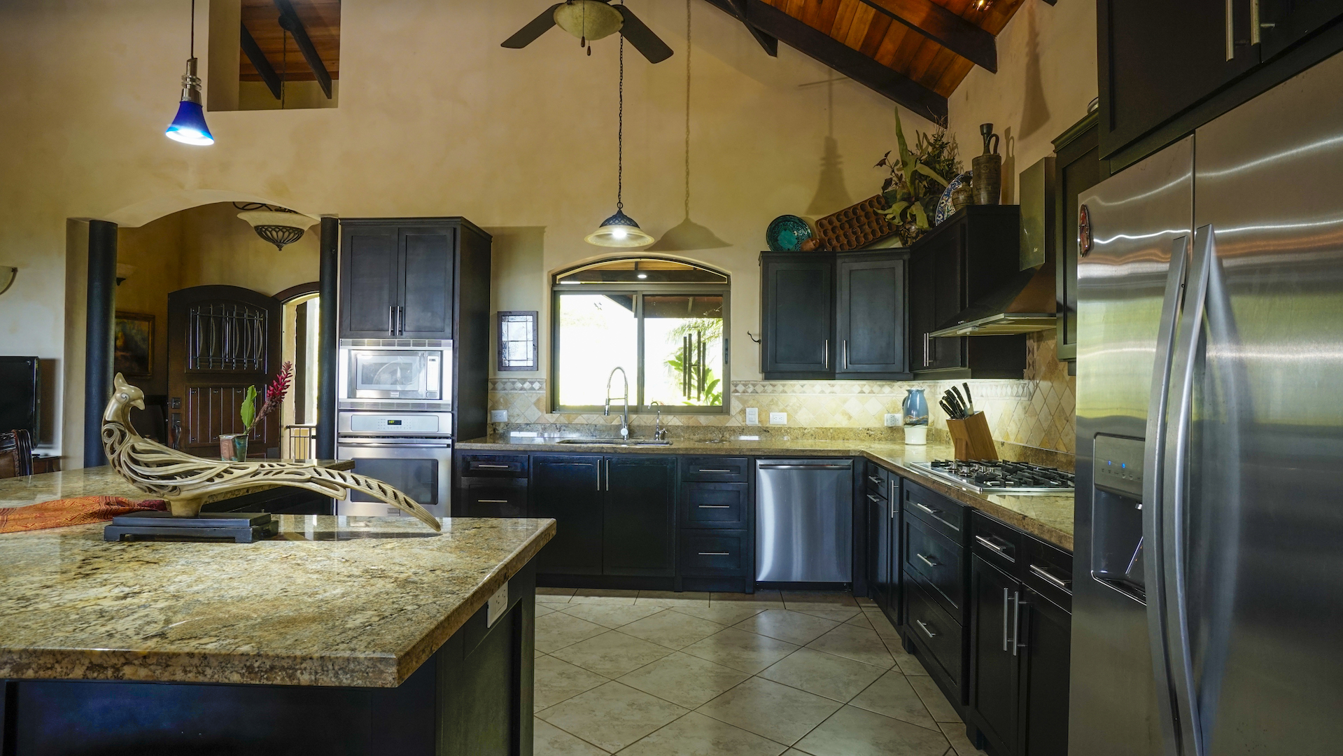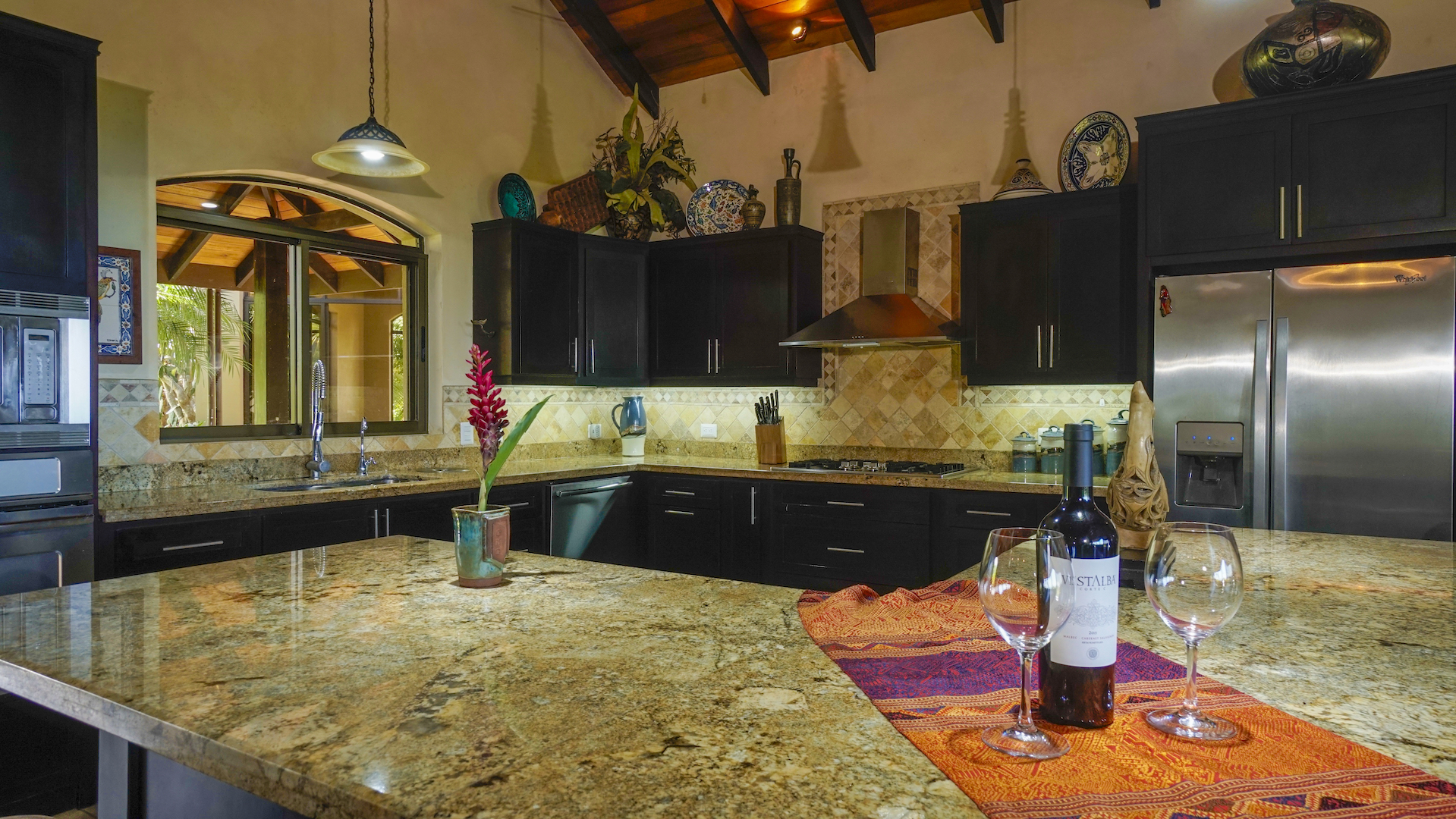 With a large modern gourmet kitchen the property has space and facilities for any and all kitchen activities. Next to the kitchen is an indoor formal dining and living area. Apart from this the home has framed windows, vaulted ceilings with exposed wooden rafters; tile flooring and granite countertops. Attached to the 900 sq foot garage is a bodega for tools and storage. Plenty of outside lighting and motion detecting lights surround the house for outside activities.