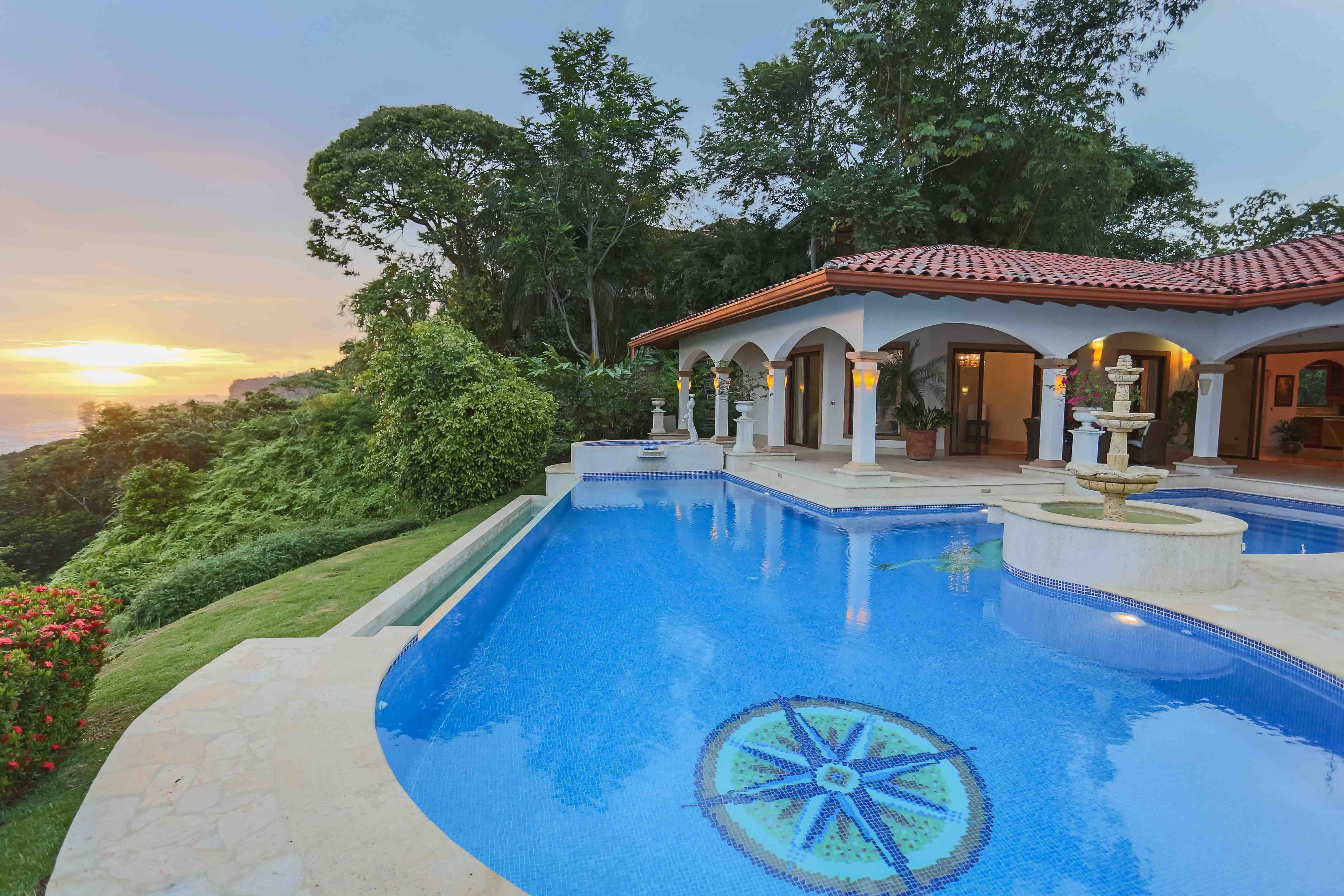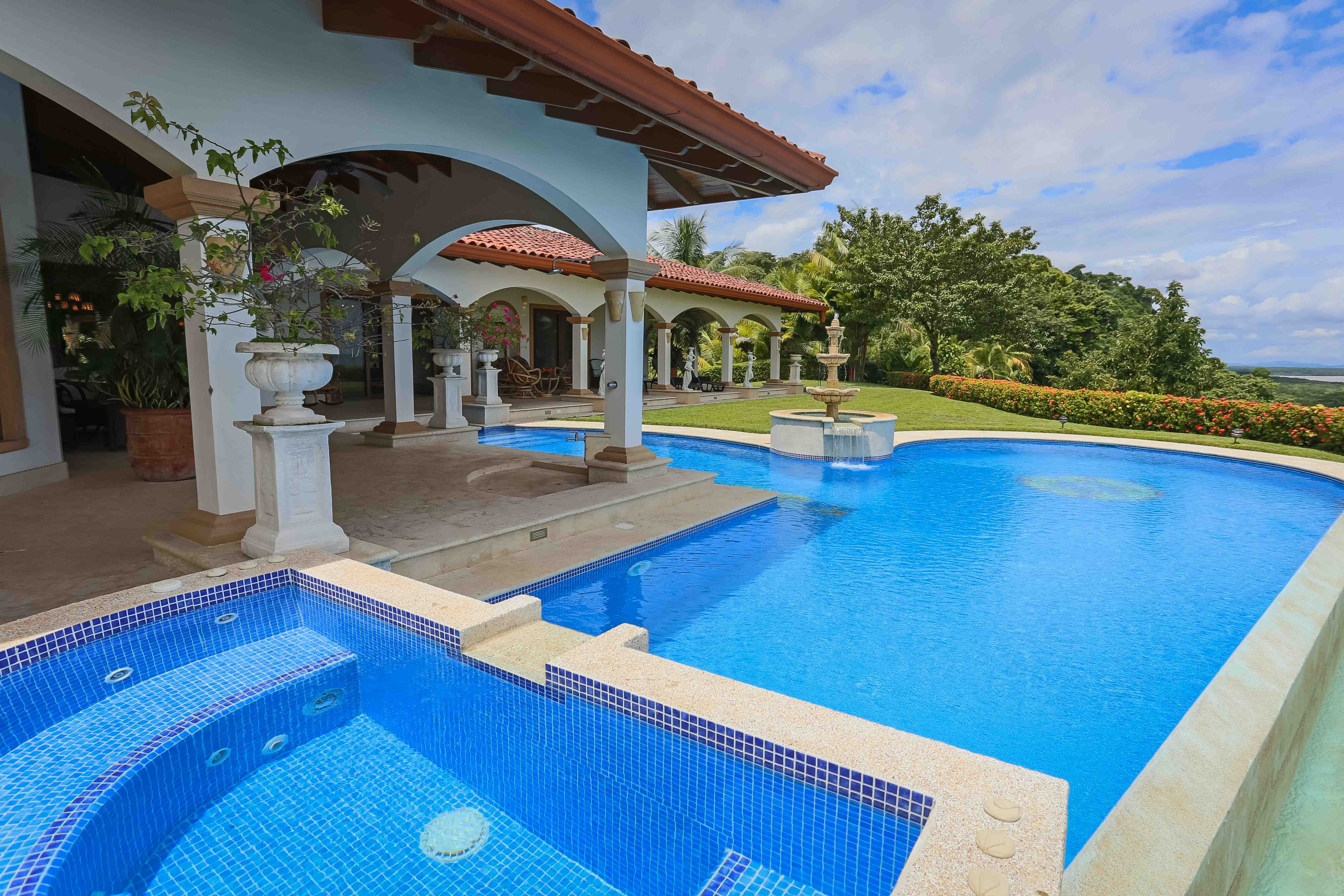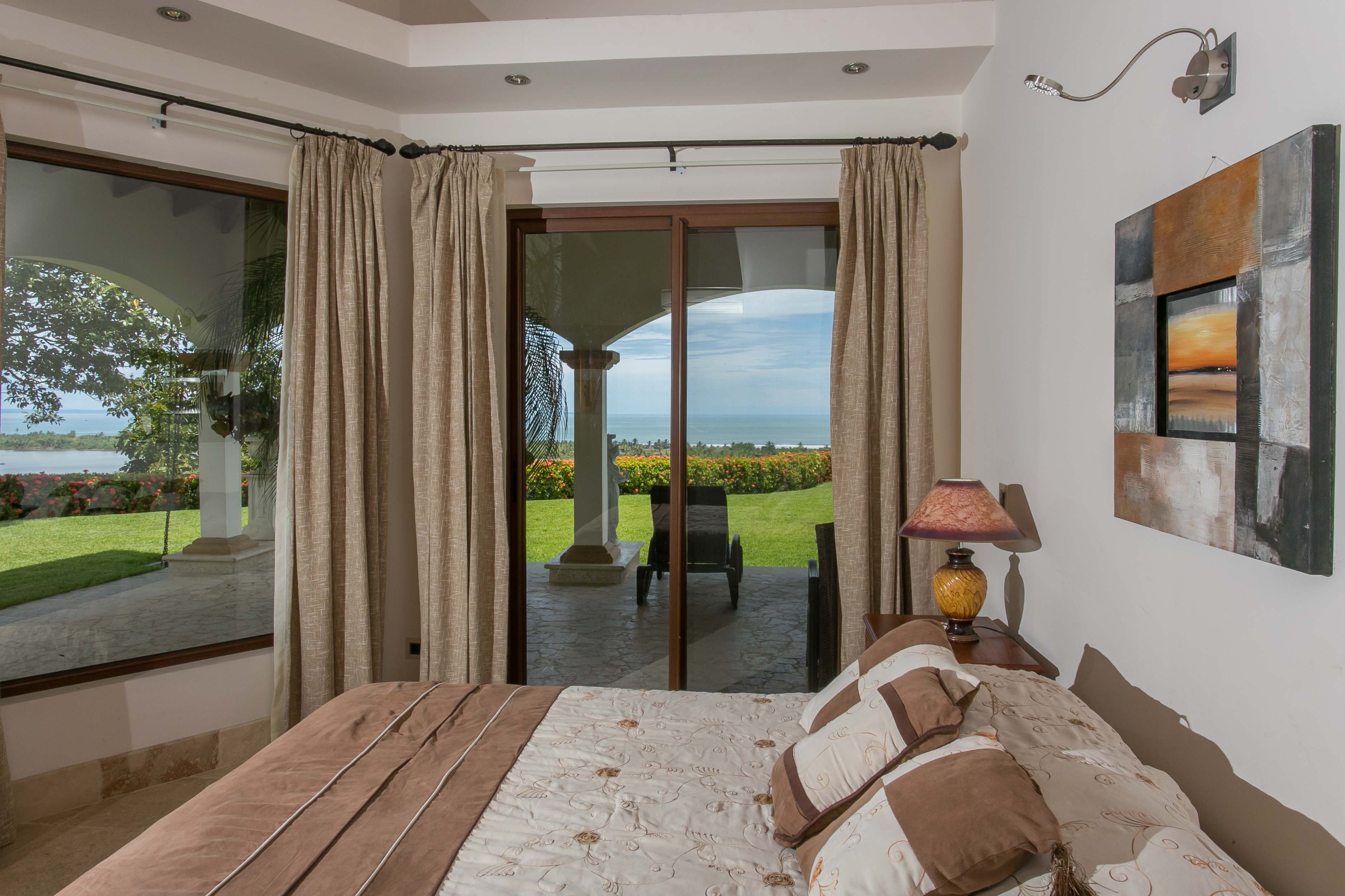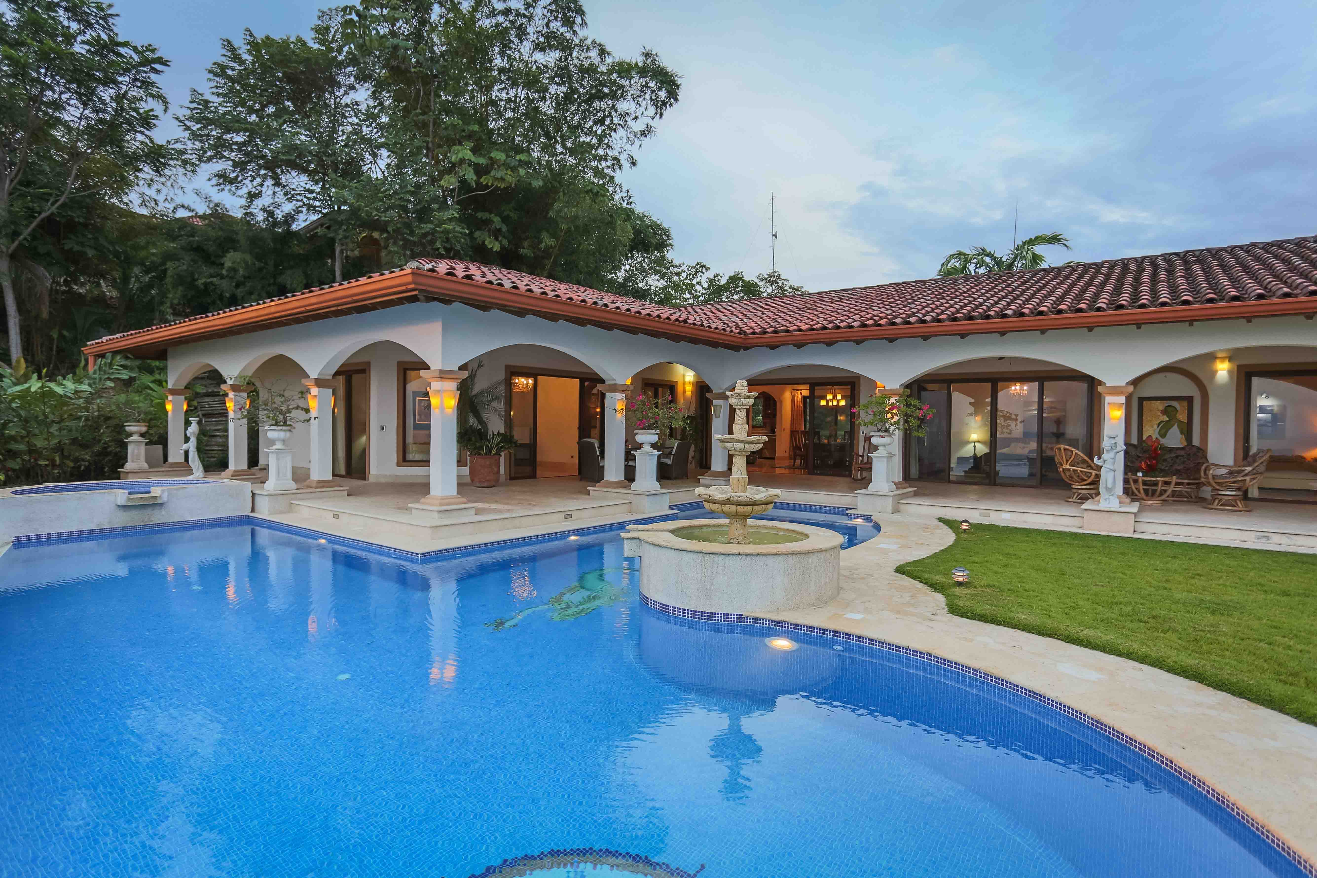 Luxury house located just above the beach. It offers the most breathtaking ocean view while benefiting from the refreshing breezes. This exquisite five bedroom villa was designed and built to offer luxury those who expect the best tropical paradise has to offer. Built facing the ocean you will enjoy the exceptional sunsets from either the interior living and dining room, the master bedroom and more so from the front terrace. The front terrace offers full dining and living facilities for your enjoyment and relaxation. The pool area and jacuzzi are second to none. You will find only high quality materials used for construction, eight inch concrete blocks and poured concrete all steel reinforced. All under roof, doors and cabinets made of teak, extensive use of luxury marble on floors and walls as well as cut stone in some rooms and on the extensive terrace. Two master suites face the pool and ocean. The few photos and the short description barely begin to describe the charm and luxury of this villa. The numerous bedrooms and bathrooms can accommodate family members and friends while providing a high level of privacy. The grounds are beautifully landscaped and the driveway was designed to easily incorporate wheel chair access to the home and terrace.