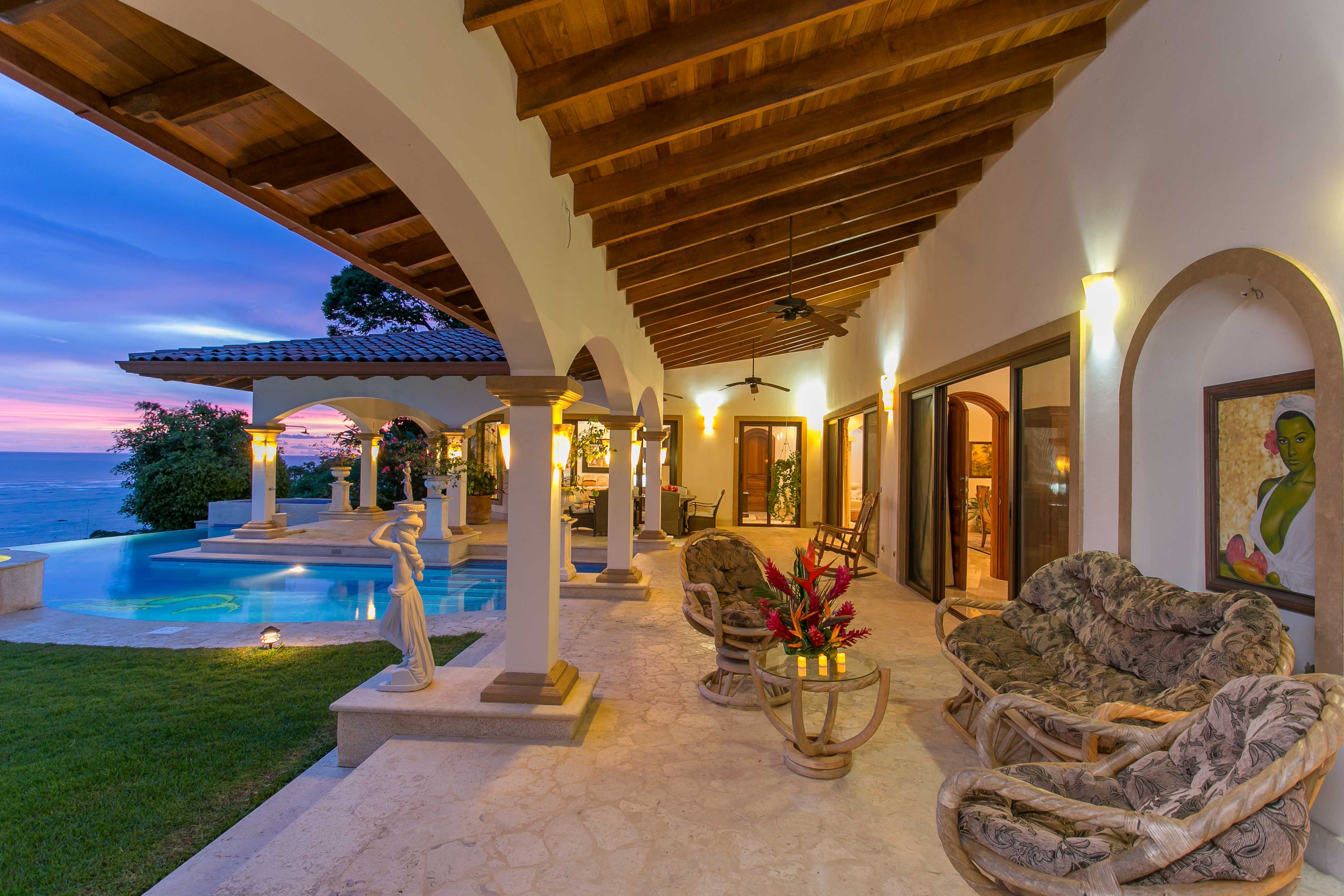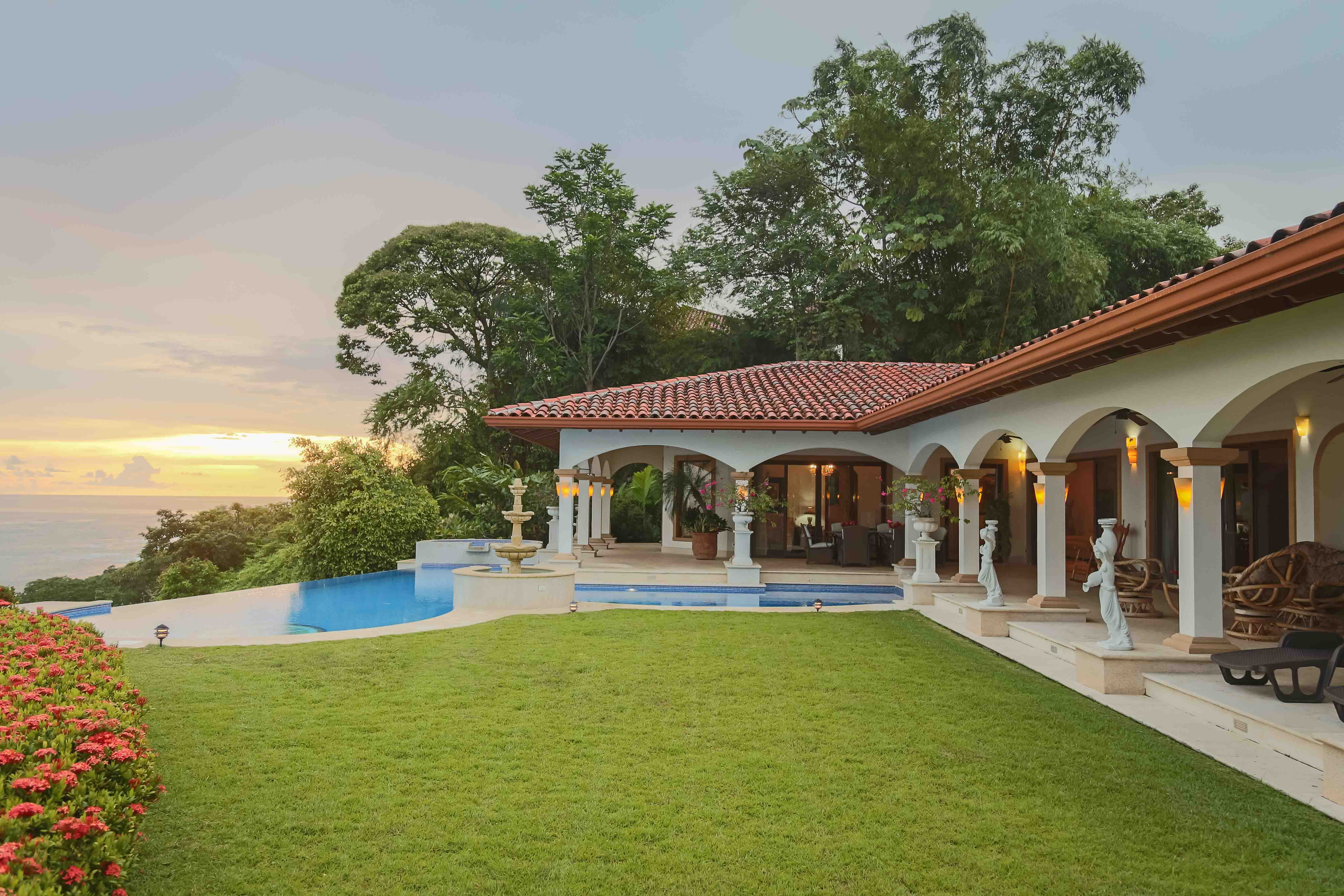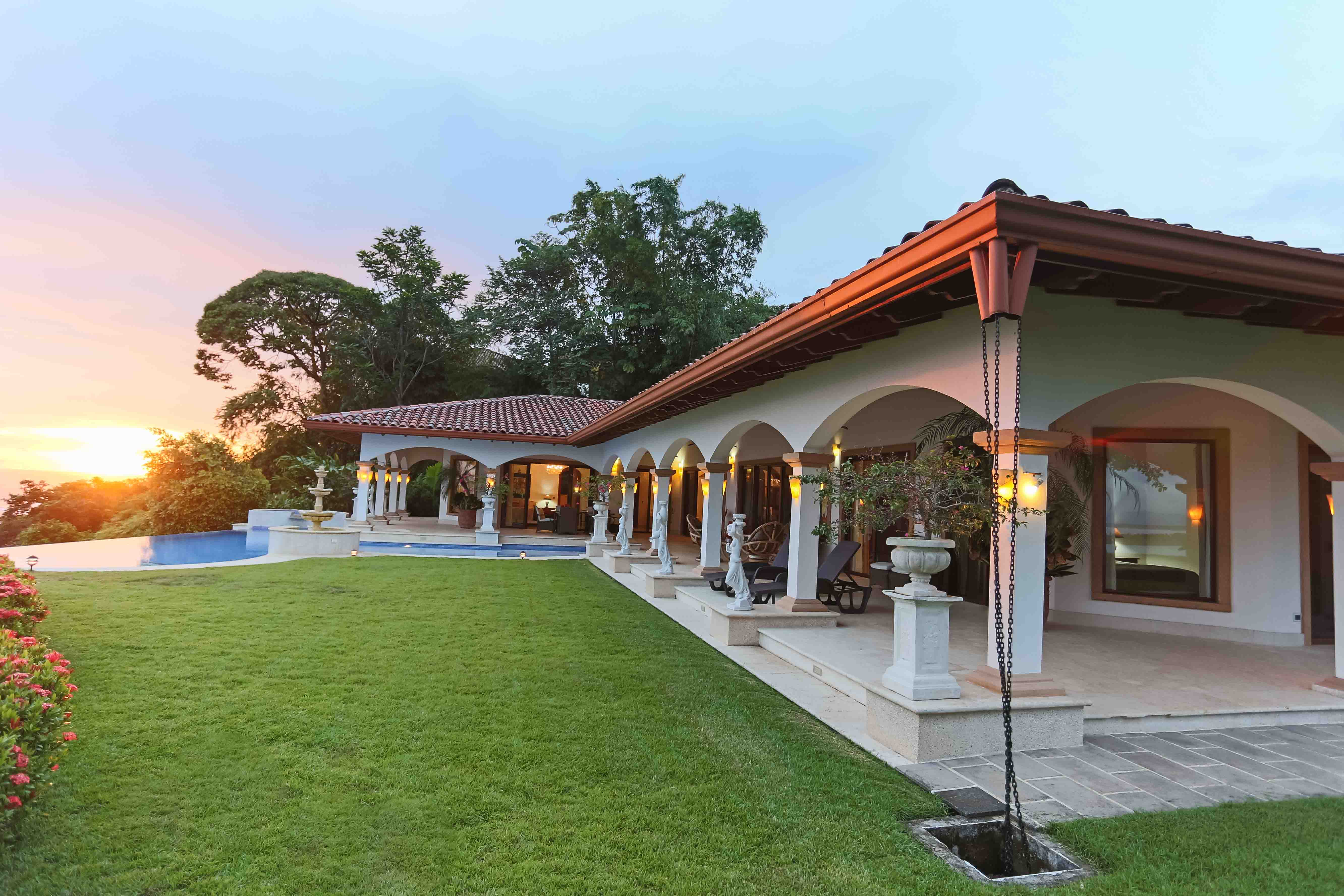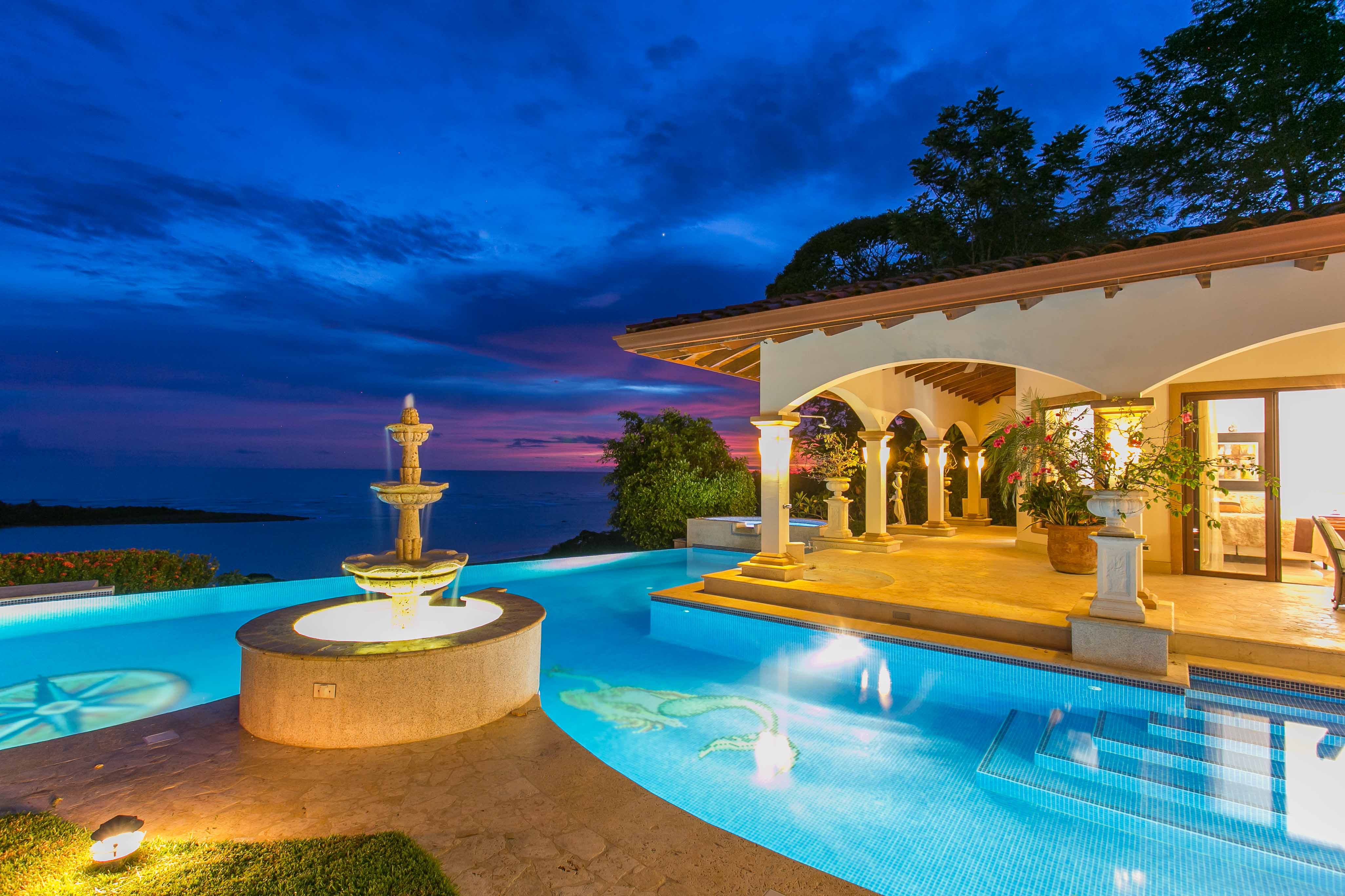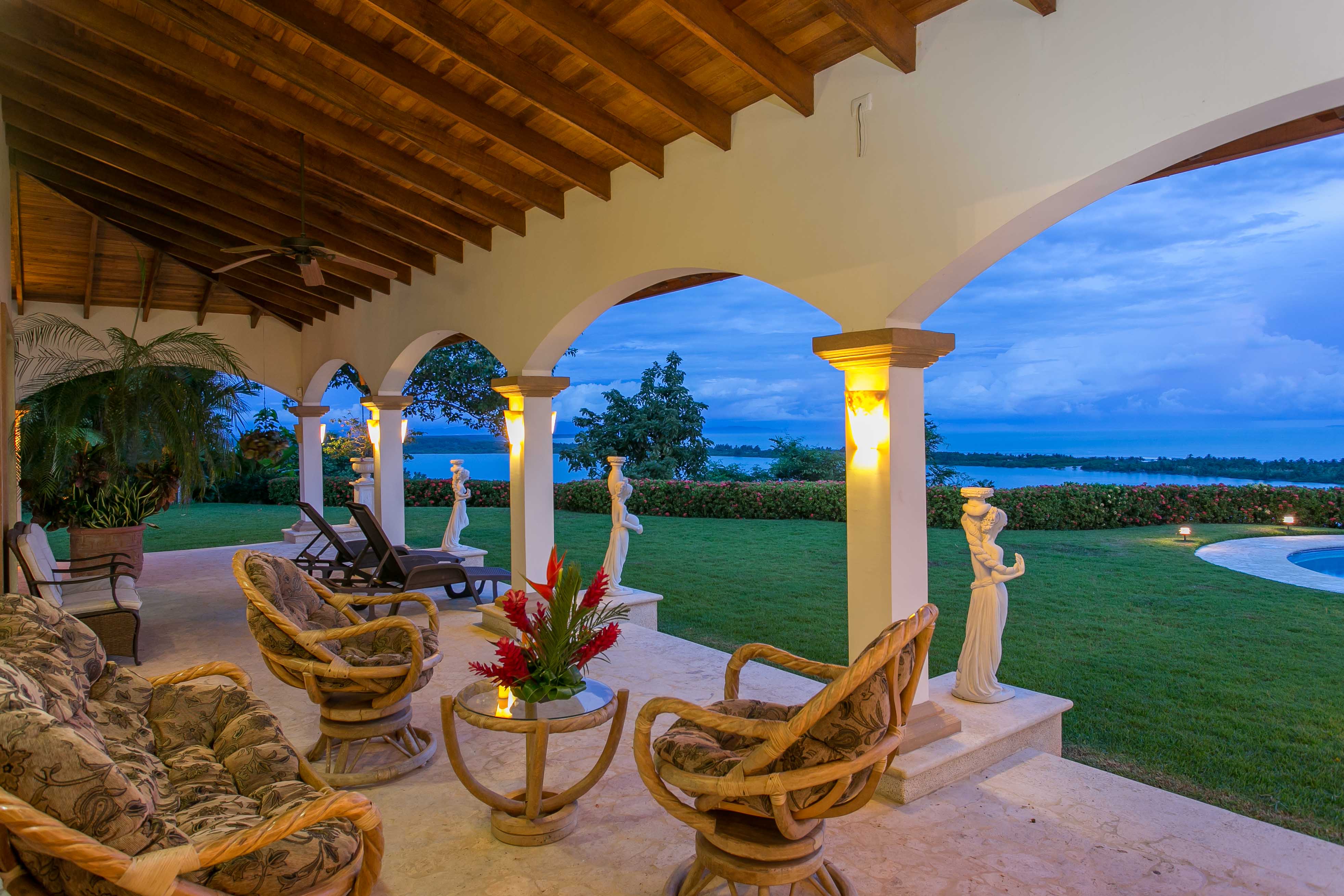 Luxury house located just above the beach. It offers the most breathtaking ocean view while benefiting from the refreshing breezes. This exquisite five bedroom villa was designed and built to offer luxury those who expect the best tropical paradise has to offer. Built facing the ocean you will enjoy the exceptional sunsets from either the interior living and dining room, the master bedroom and more so from the front terrace. The front terrace offers full dining and living facilities for your enjoyment and relaxation. The pool area and jacuzzi are second to none. You will find only high quality materials used for construction, eight inch concrete blocks and poured concrete all steel reinforced. All under roof, doors and cabinets made of teak, extensive use of luxury marble on floors and walls as well as cut stone in some rooms and on the extensive terrace. Two master suites face the pool and ocean. The few photos and the short description barely begin to describe the charm and luxury of this villa. The numerous bedrooms and bathrooms can accommodate family members and friends while providing a high level of privacy. The grounds are beautifully landscaped and the driveway was designed to easily incorporate wheel chair access to the home and terrace.
