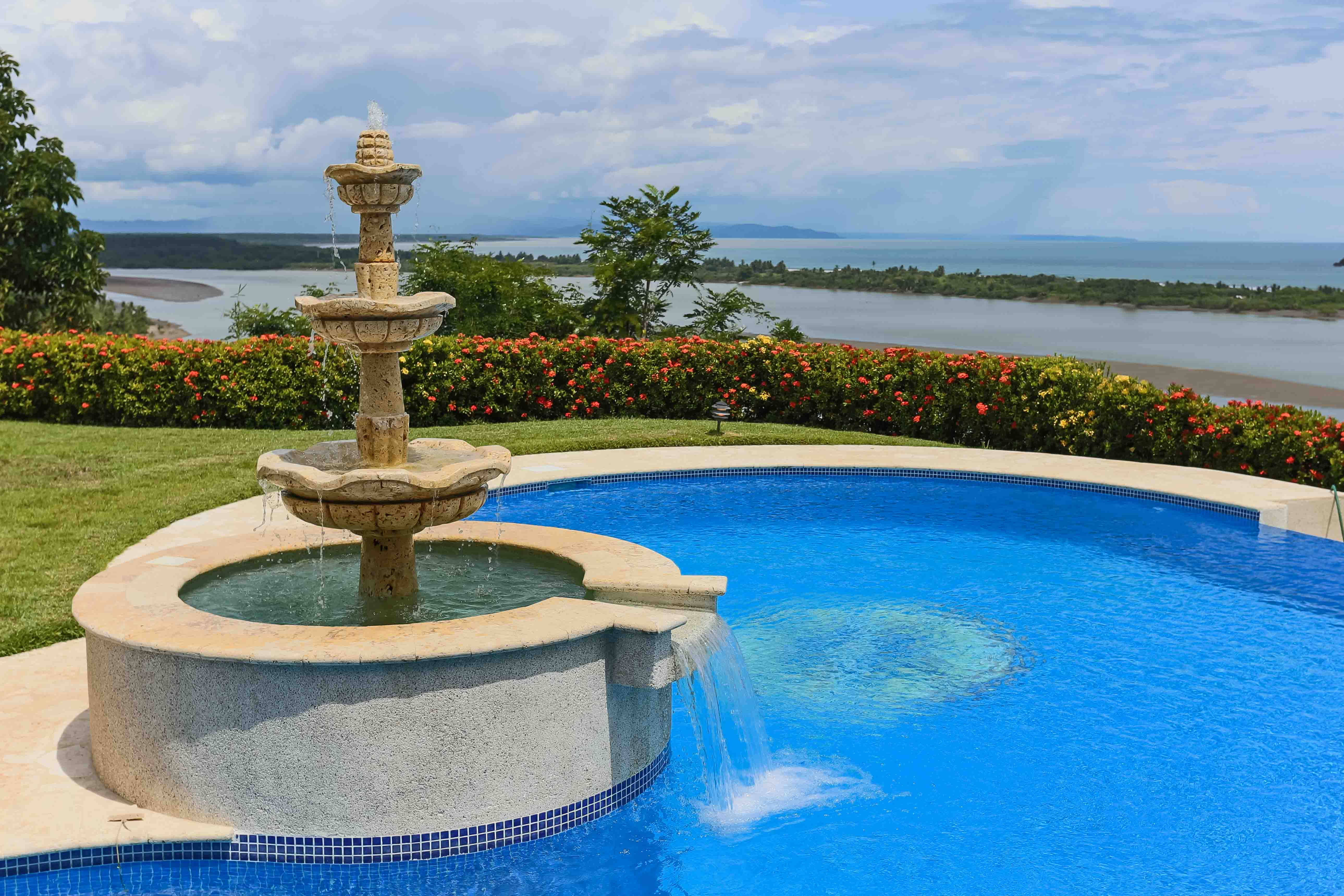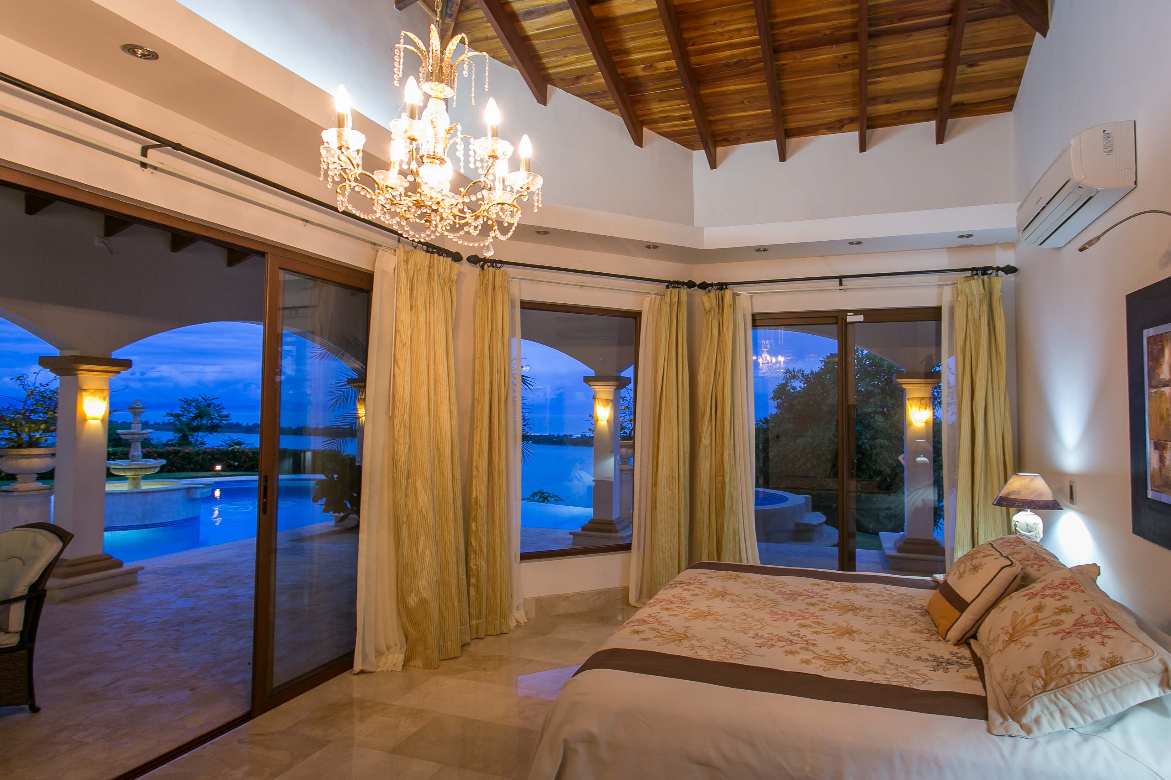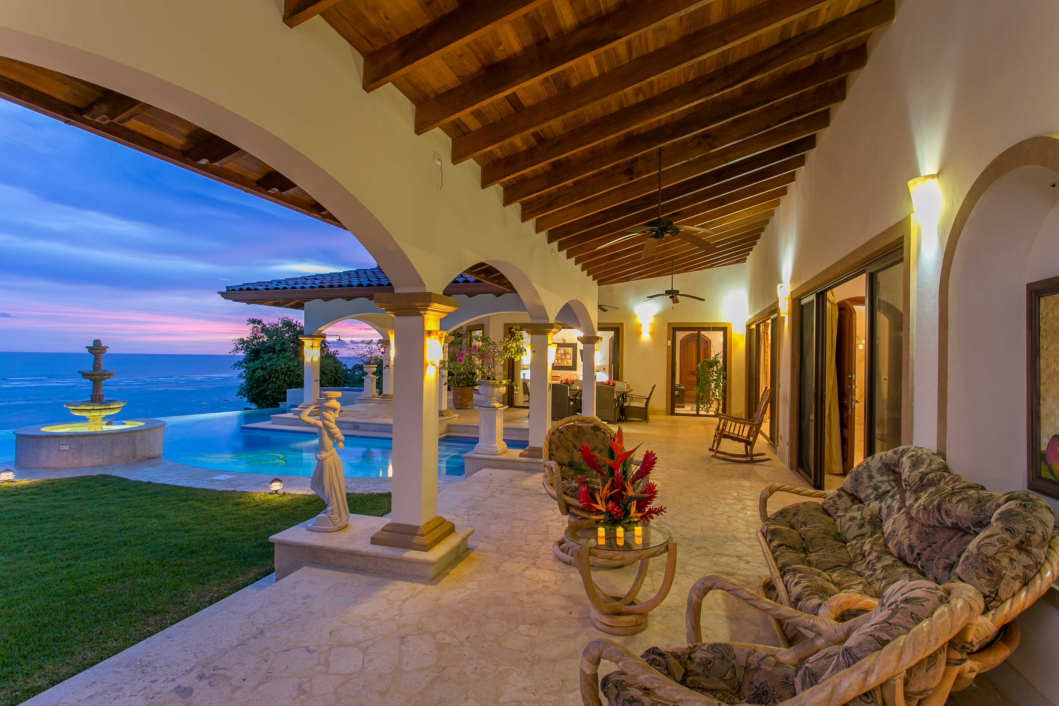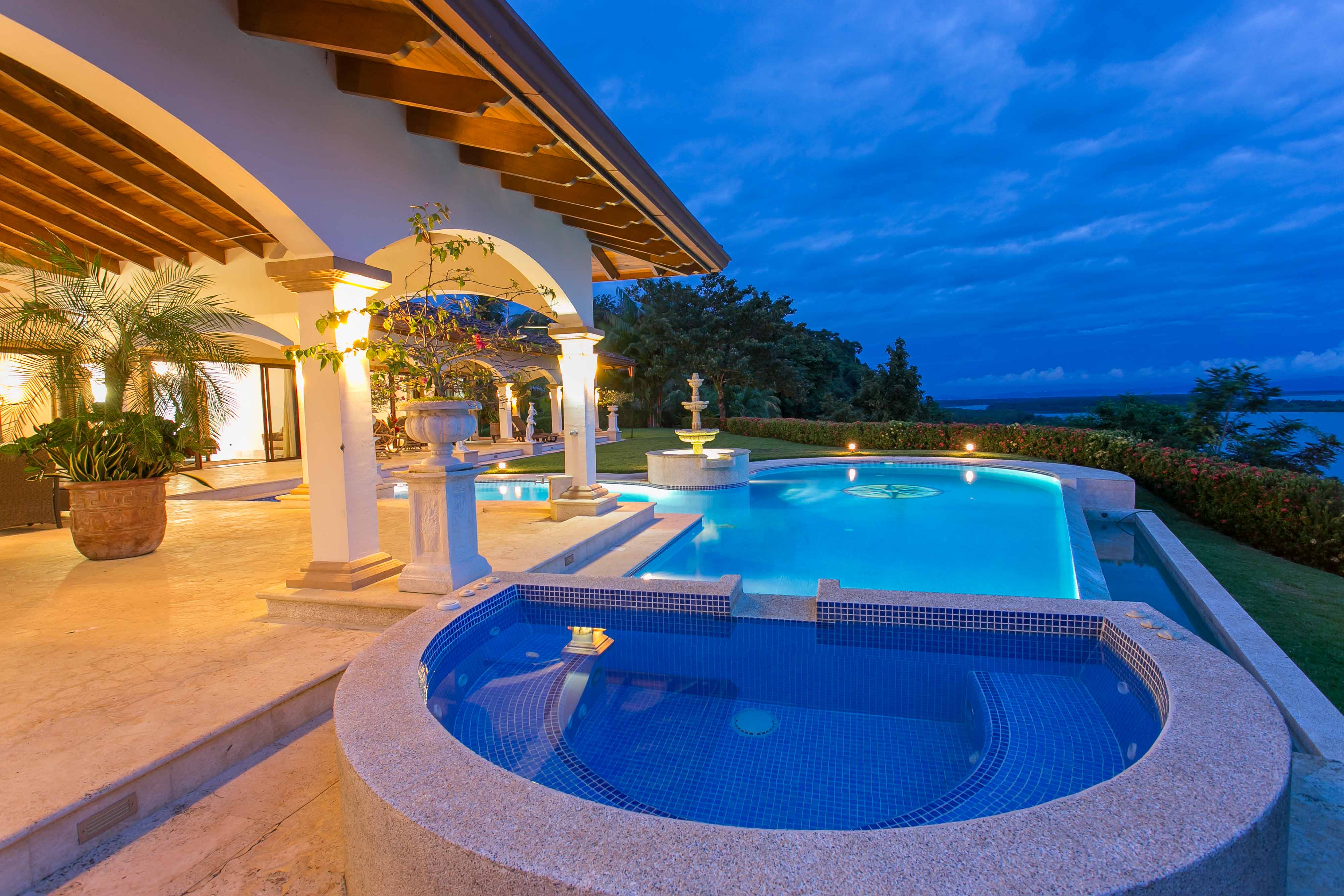 Luxury house located just above the beach. It offers the most breathtaking ocean view while benefiting from the refreshing breezes. This exquisite five bedroom villa was designed and built to offer luxury those who expect the best tropical paradise has to offer. Built facing the ocean you will enjoy the exceptional sunsets from either the interior living and dining room, the master bedroom and more so from the front terrace. The front terrace offers full dining and living facilities for your enjoyment and relaxation. The pool area and jacuzzi are second to none. You will find only high quality materials used for construction, eight inch concrete blocks and poured concrete all steel reinforced. All under roof, doors and cabinets made of teak, extensive use of luxury marble on floors and walls as well as cut stone in some rooms and on the extensive terrace. Two master suites face the pool and ocean. The few photos and the short description barely begin to describe the charm and luxury of this villa. The numerous bedrooms and bathrooms can accommodate family members and friends while providing a high level of privacy. The grounds are beautifully landscaped and the driveway was designed to easily incorporate wheel chair access to the home and terrace.