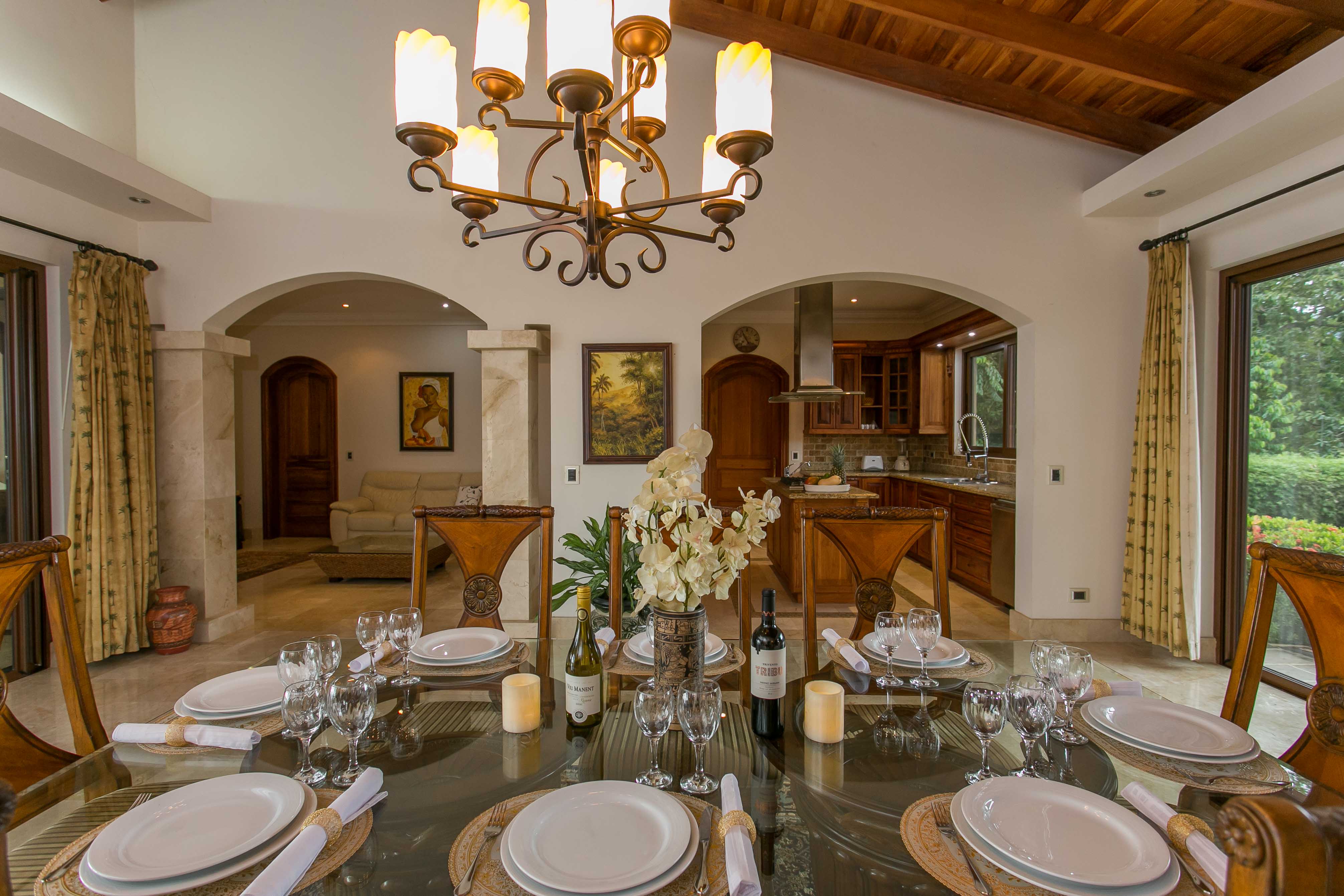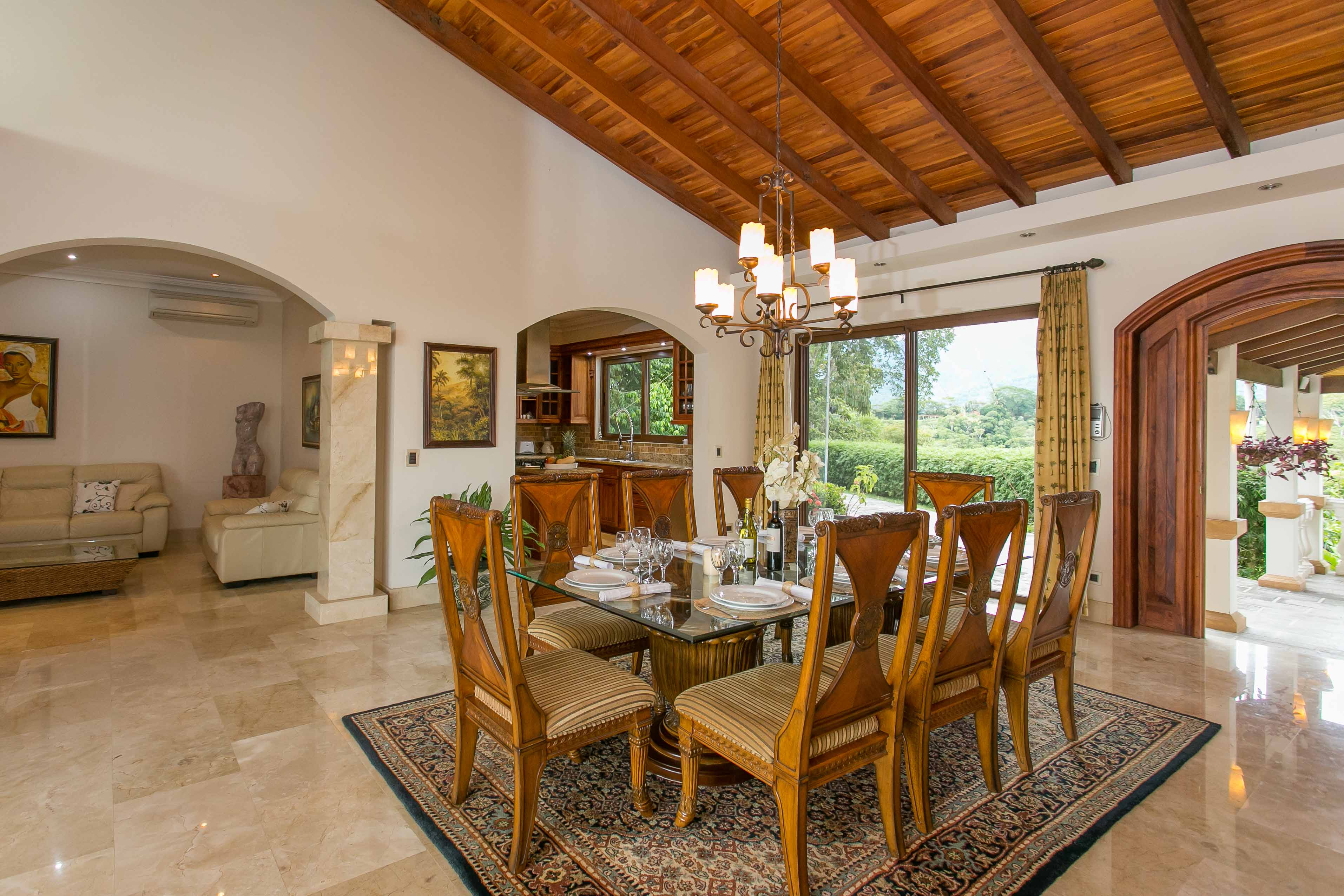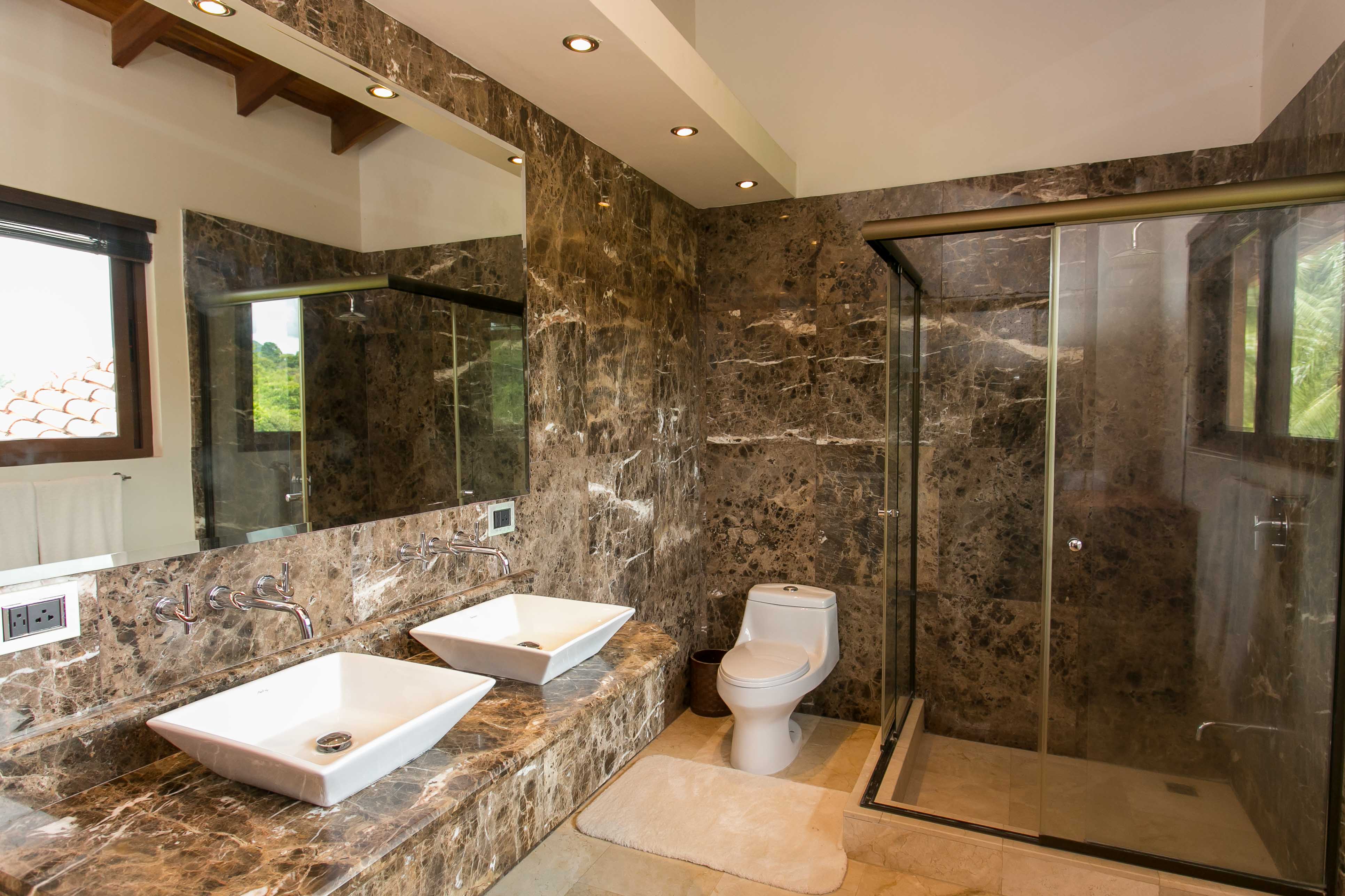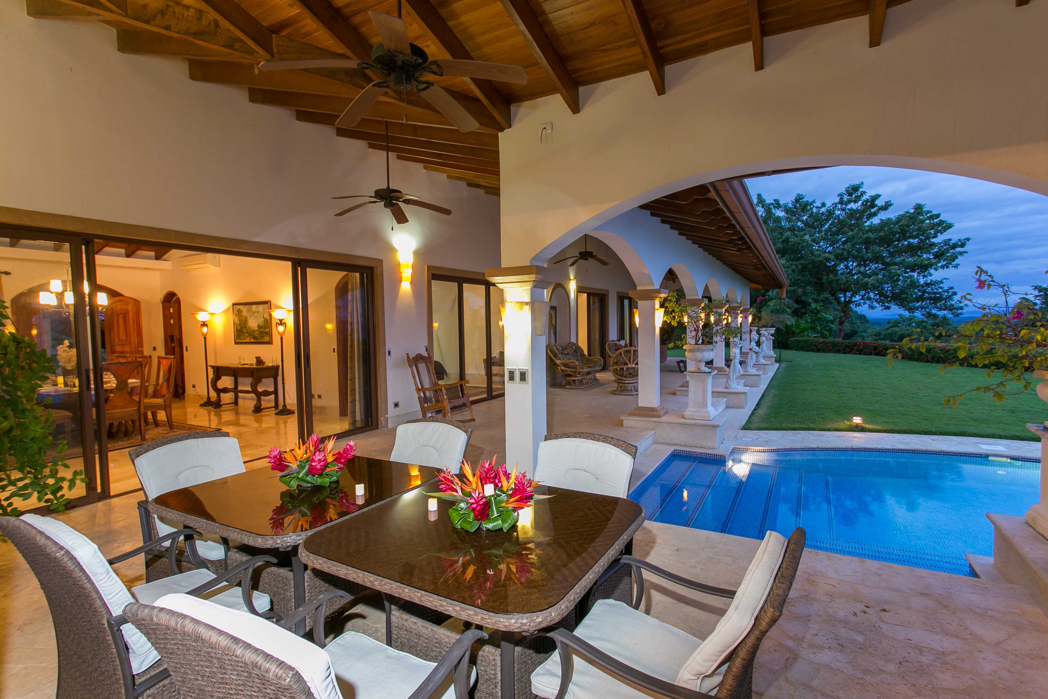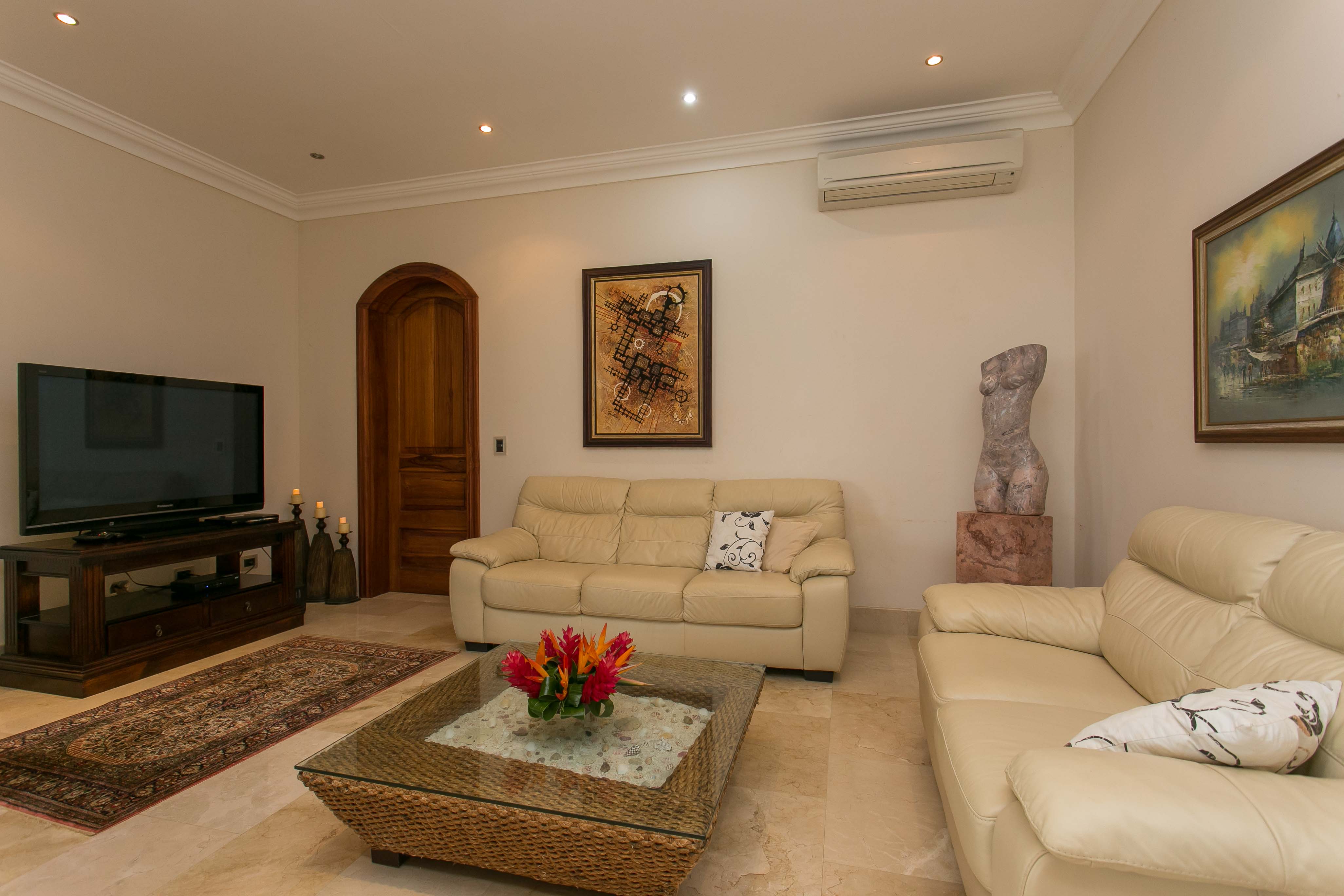 Luxury house located just above the beach. It offers the most breathtaking ocean view while benefiting from the refreshing breezes. This exquisite five bedroom villa was designed and built to offer luxury those who expect the best tropical paradise has to offer. Built facing the ocean you will enjoy the exceptional sunsets from either the interior living and dining room, the master bedroom and more so from the front terrace. The front terrace offers full dining and living facilities for your enjoyment and relaxation. The pool area and jacuzzi are second to none. You will find only high quality materials used for construction, eight inch concrete blocks and poured concrete all steel reinforced. All under roof, doors and cabinets made of teak, extensive use of luxury marble on floors and walls as well as cut stone in some rooms and on the extensive terrace. Two master suites face the pool and ocean. The few photos and the short description barely begin to describe the charm and luxury of this villa. The numerous bedrooms and bathrooms can accommodate family members and friends while providing a high level of privacy. The grounds are beautifully landscaped and the driveway was designed to easily incorporate wheel chair access to the home and terrace.