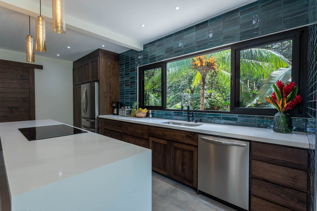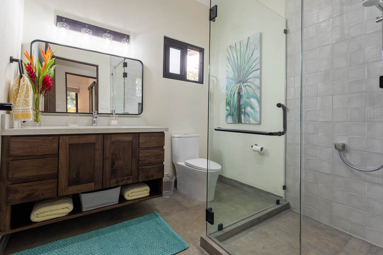 The stunning teak staircase with atrium-like windows leads to the 3 generously sized bedrooms that all feature vaulted ceilings, air conditioning, custom furniture, pillow top mattresses, and hotel-style blackout curtains. The sophisticated linens and housewares are imported from the US. Get the best nights’ sleep in the luxury master bedroom with a sitting area and spa-like en suite bathroom. There is ample storage space throughout the house, under the staircase, and a large secure dehumidified closet. High-speed fiber optic internet is installed here and in the guest house.