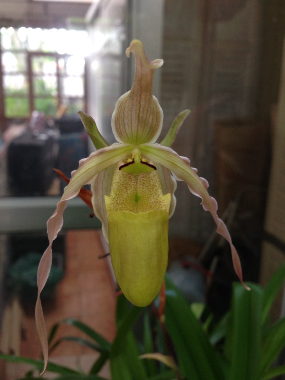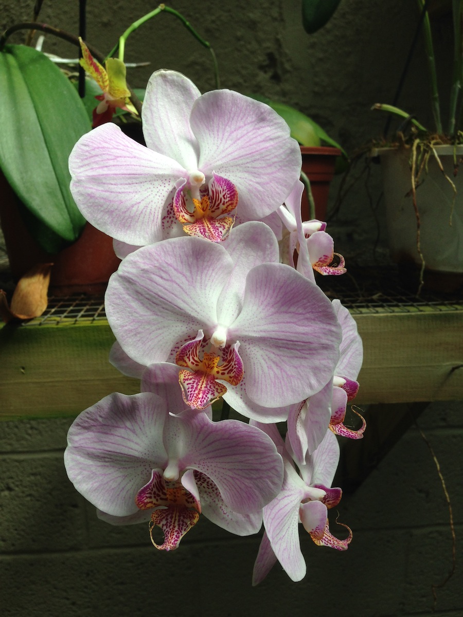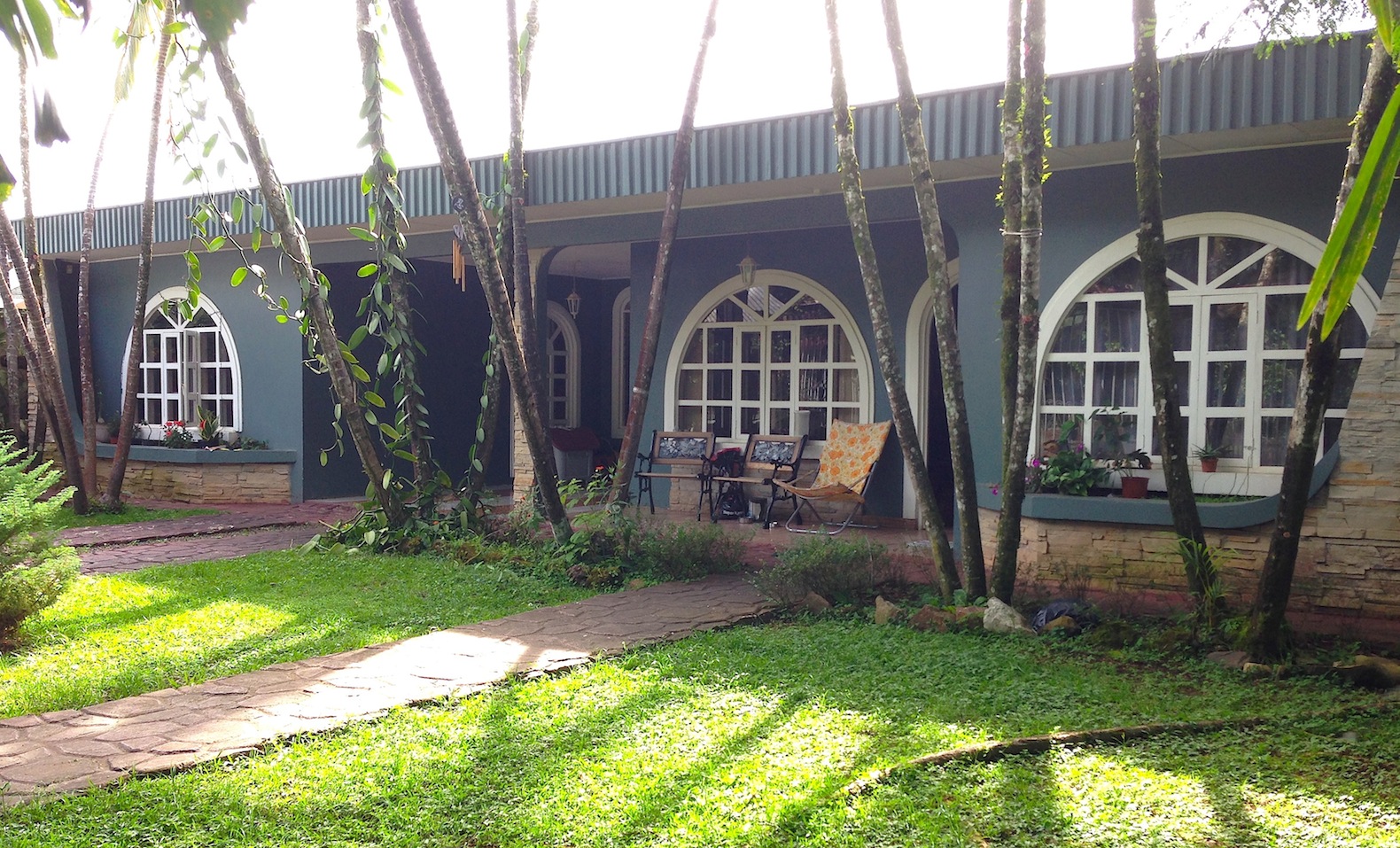 and two large arched windows, one with a view out into the south side orchid nursery.