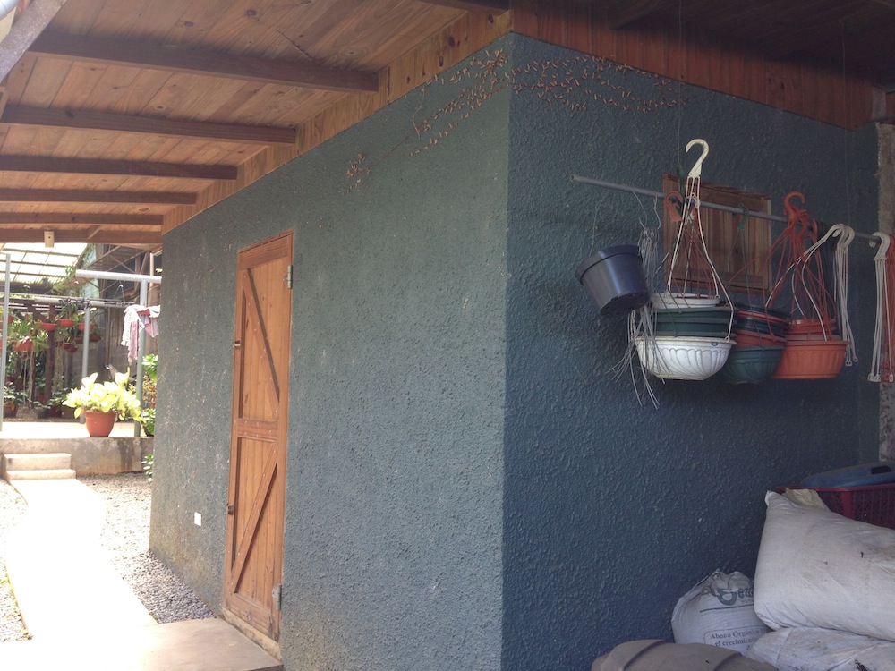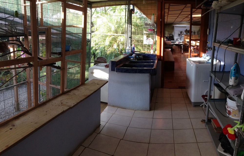 The laundry room connects to the outdoor solar patio that has clear plastic roof panels, used for drying clothes. Inside the laundry area is a small aviary for birds.