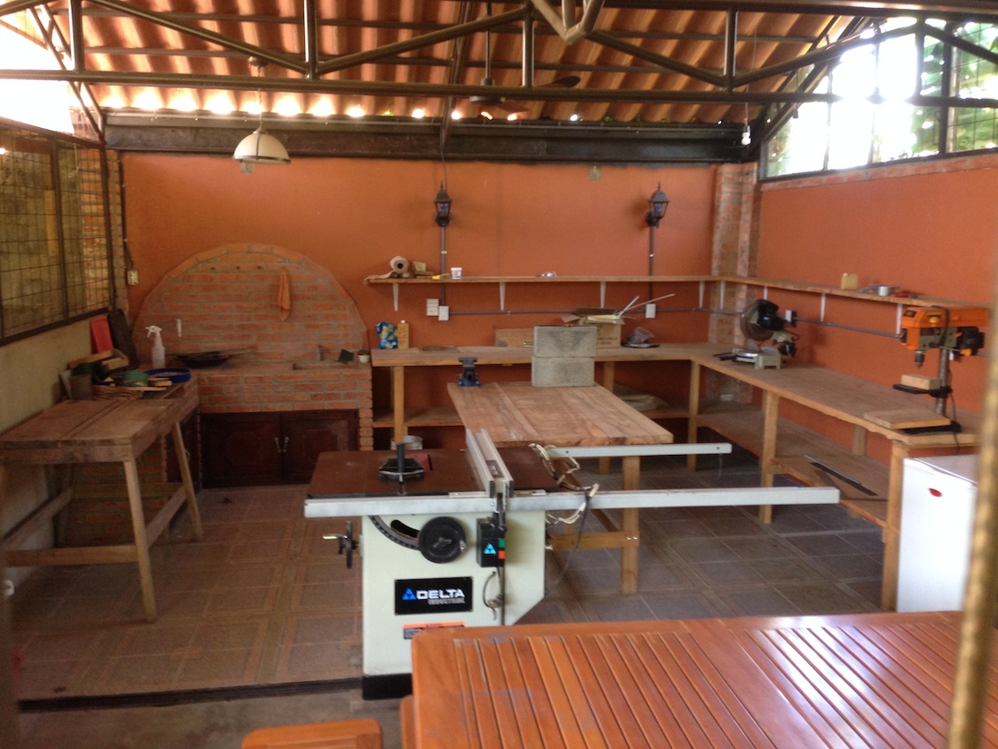 There's a workshop including a new roof, this space has running water and 110v / 220v power. There is a built-in coal/wood fire pit in a red brick countertop with lower shelving and a sink, great for afternoon BBQs or parties.