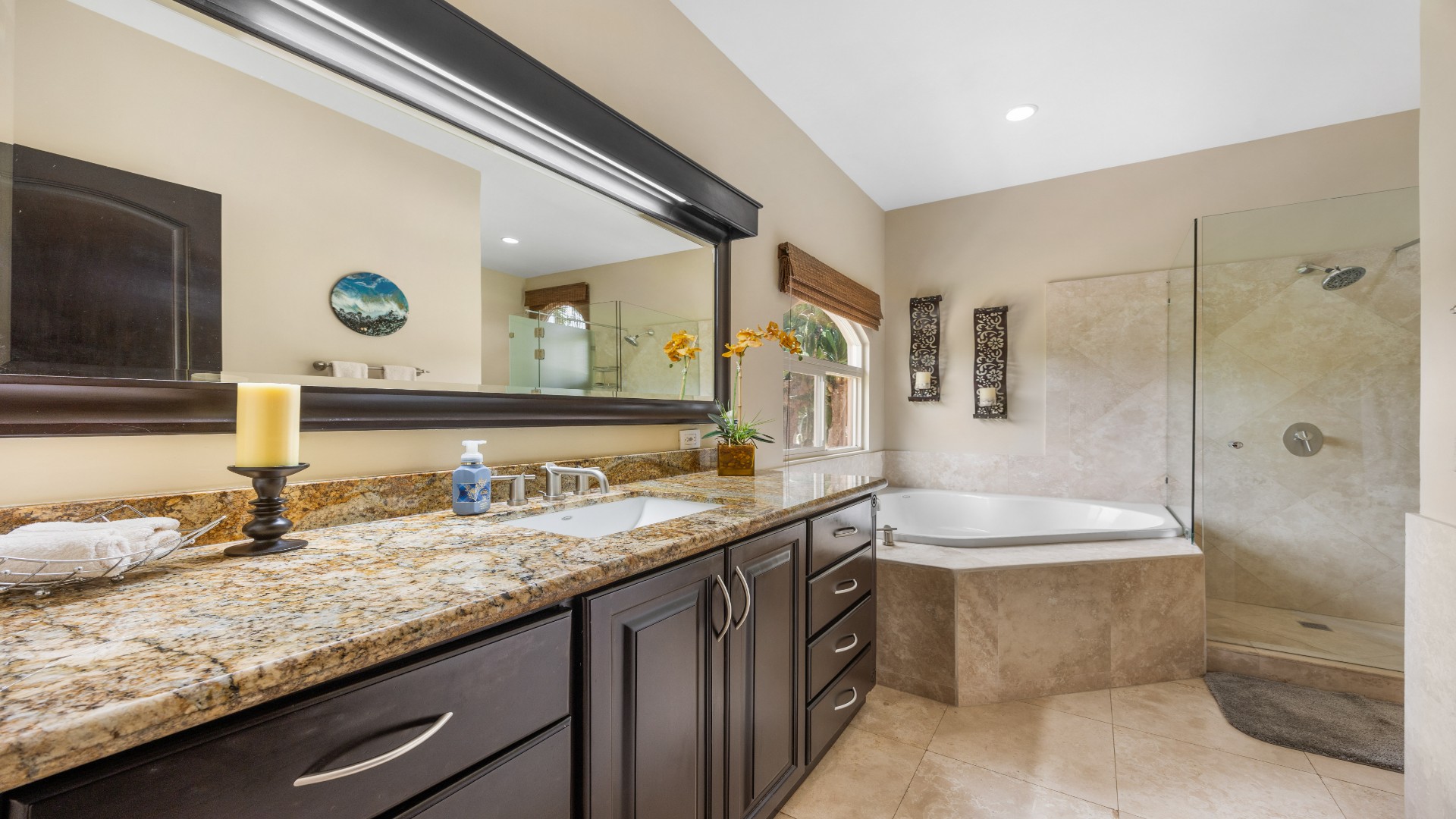 Set on a beautifully landscaped 1.35-acre lot, this turn-key residence offers privacy, grandeur, and a seamless blend of tropical charm and Mediterranean design. A long, palm-lined driveway welcomes you into a world of serenity, where mature gardens, a resort-style pool with waterfall and jacuzzi, and multiple outdoor living areas create the ultimate setting for entertaining and relaxation.