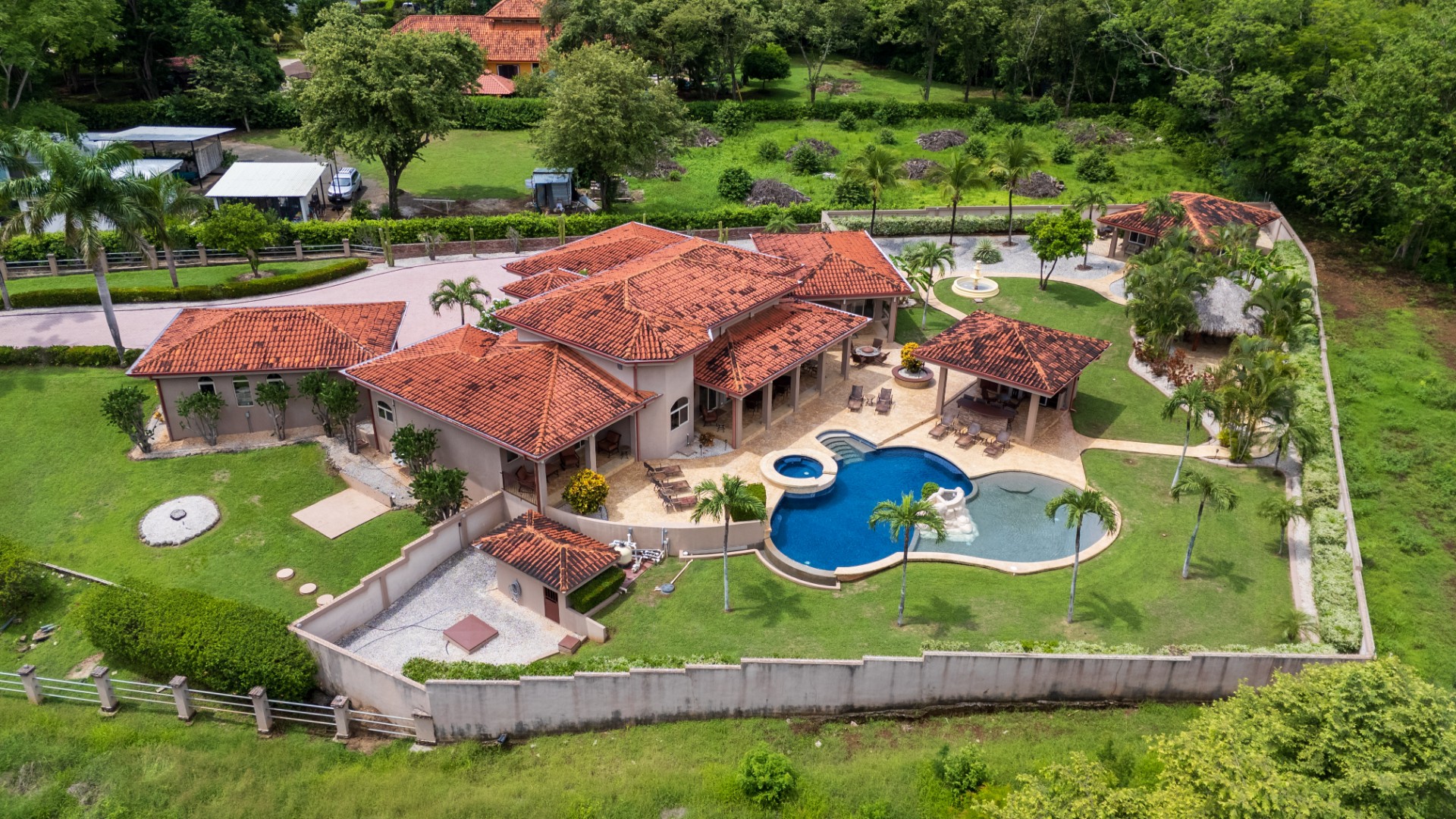Fully walled property with mature palms and manicured gardens