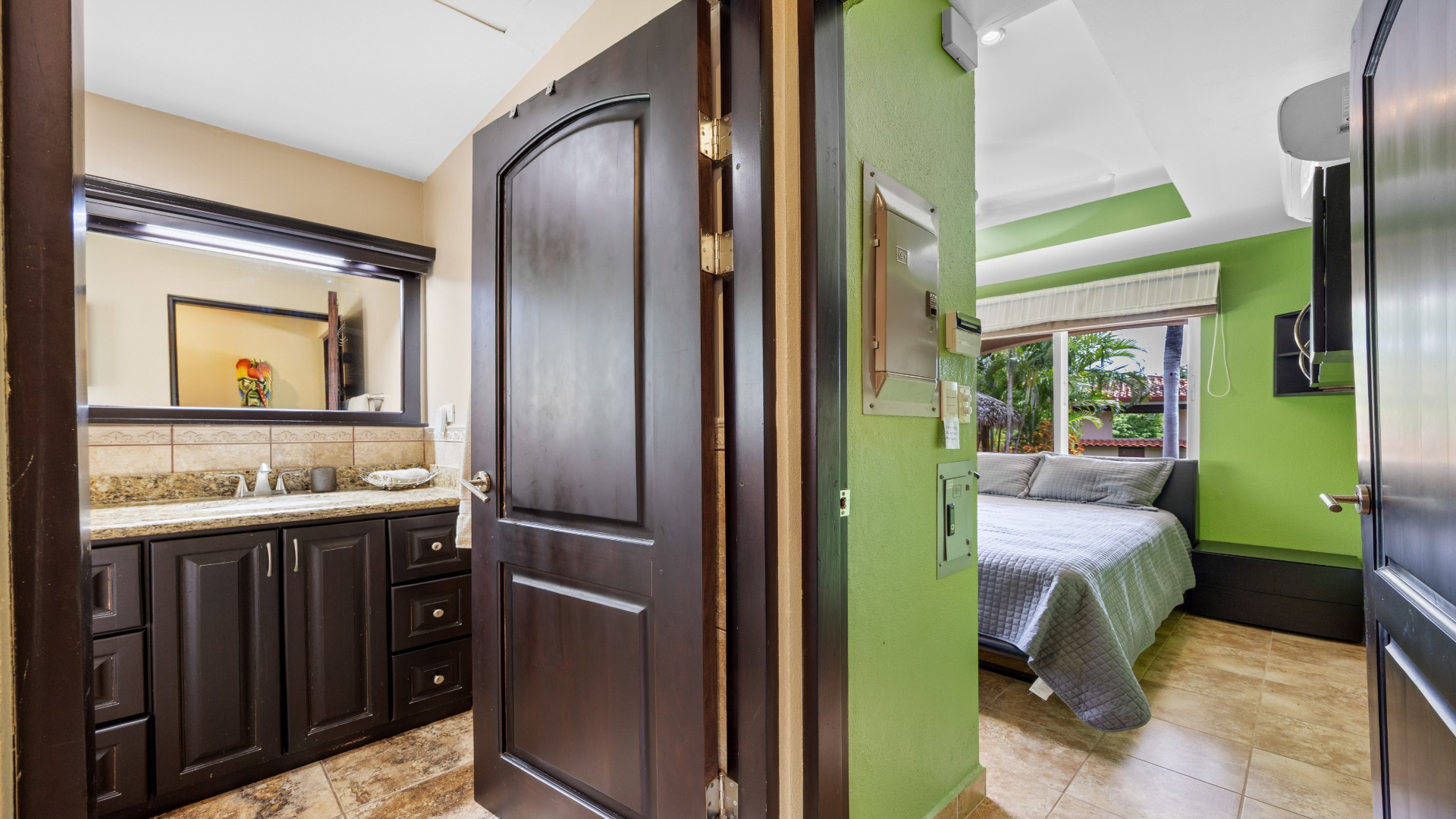 Two lavish primary suites, each with spa-style bathrooms, private sitting areas, and direct pool access
