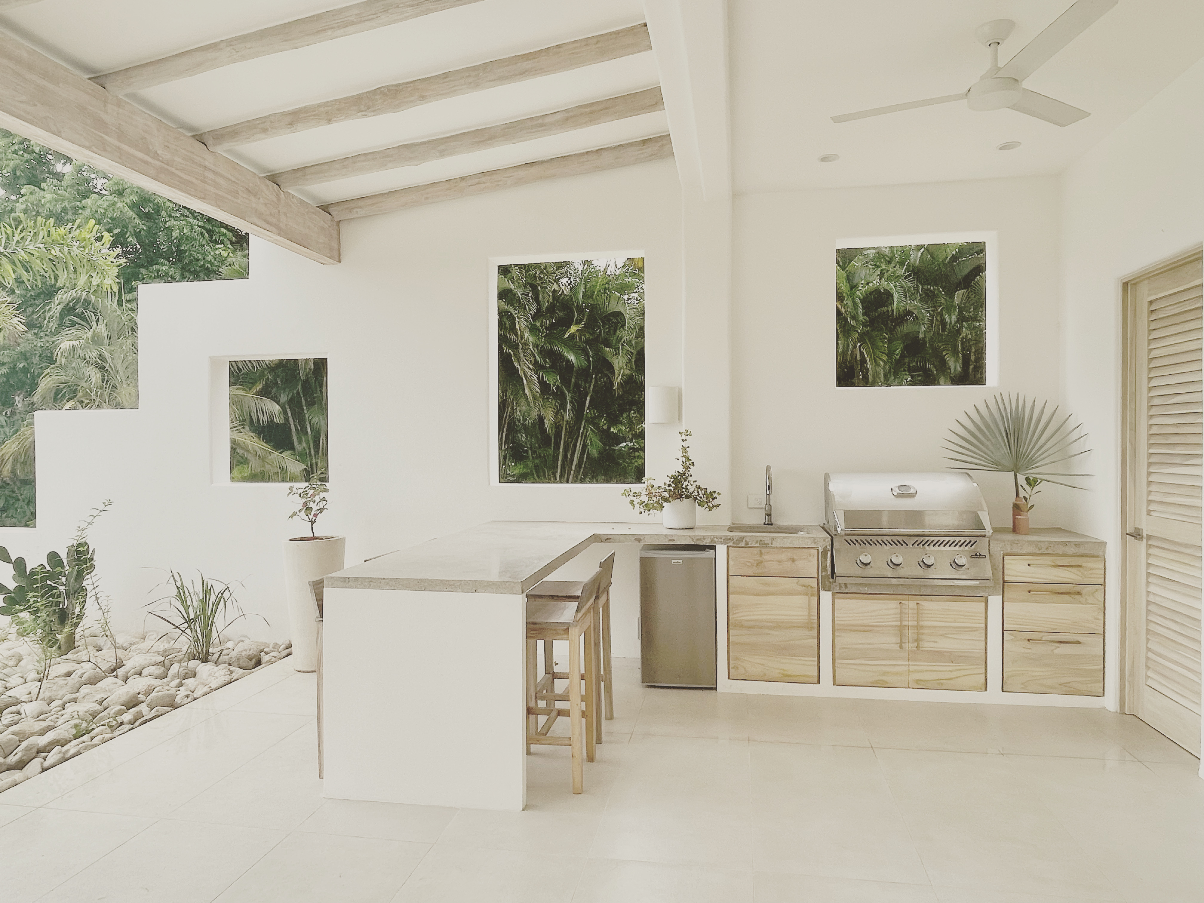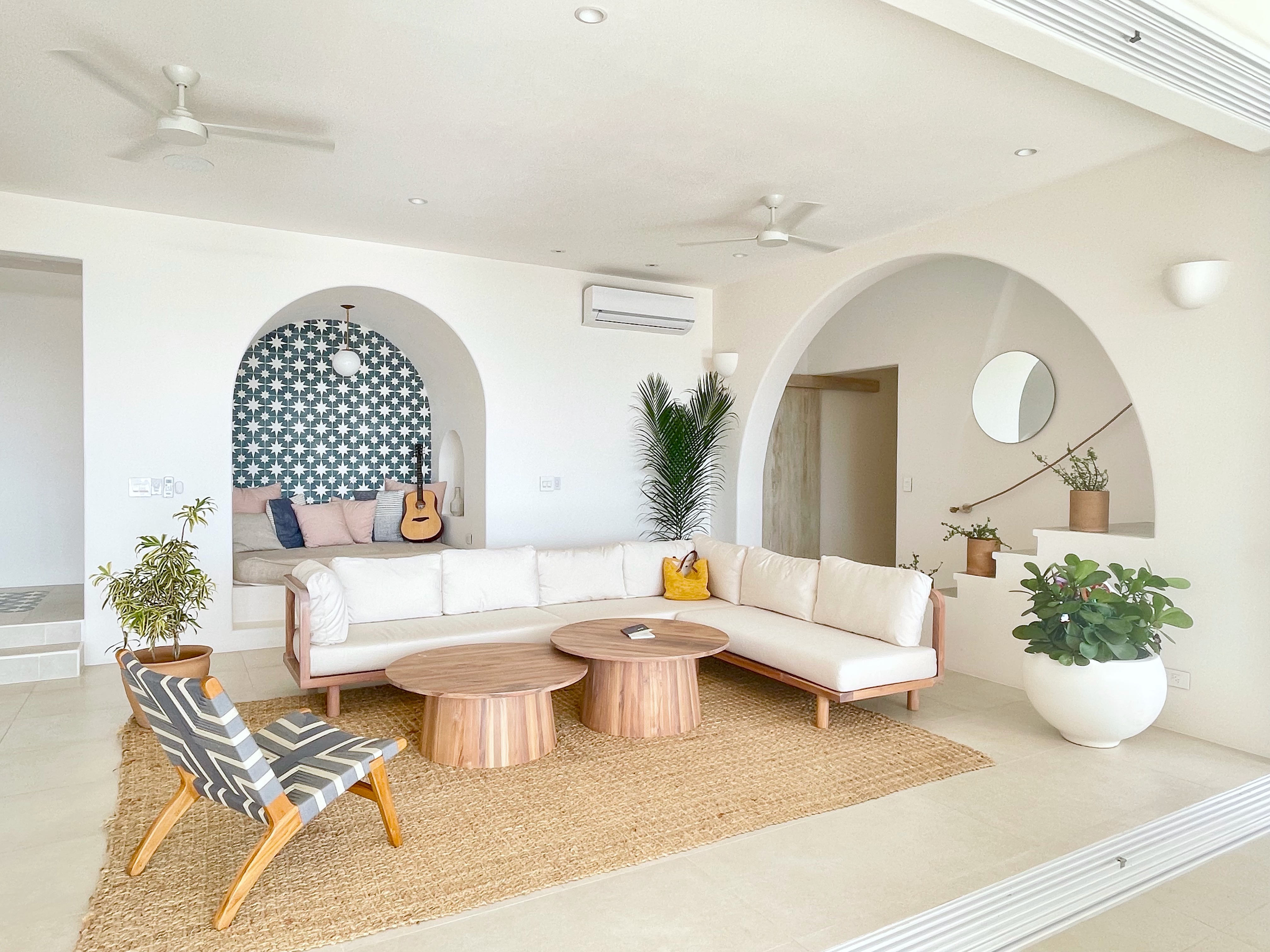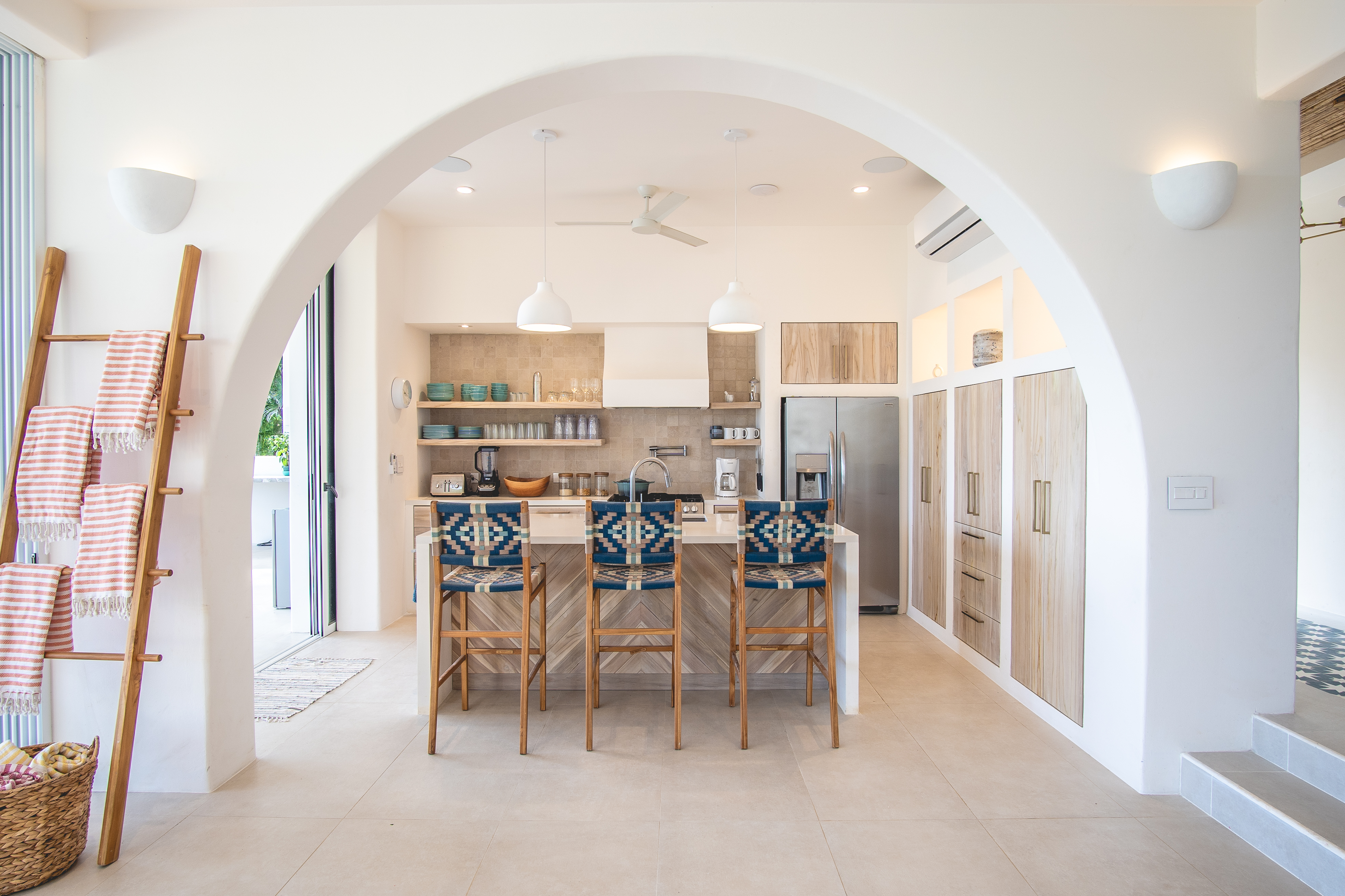 Architecturally, this high-end build takes its inspiration from the islands of the Mediterranean, featuring sculpted corners and a gracious arch motif throughout. The villa was built from the simple quality materials, including locally handcrafted cement tiles, venetian plaster, custom teak cabinets, and custom bathtubs and sinks.