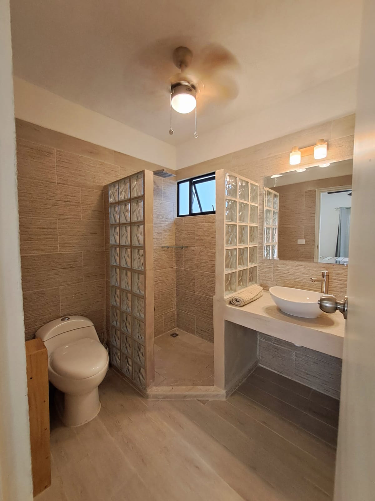 The compound includes two houses, each with its own distinctive appeal. The main house features 2 generously sized bedrooms, one on the upper floor and one on the ground floor with separate access, ensuring complete privacy of access to each of them. The house boasts a modern design, with a cozy living room that opens to a spacious, fully equipped kitchen leading to a terrace. The ground-floor bedroom has an ensuite bathroom, along with a guest toilet, a laundry room, and extra storage space. The master bedroom is upstairs, accessed via a stunning staircase framed by UV-resistant contemporary design windows, and features a classic and elegant fully tiled bathroom, a large closet, and a balcony/terrace.