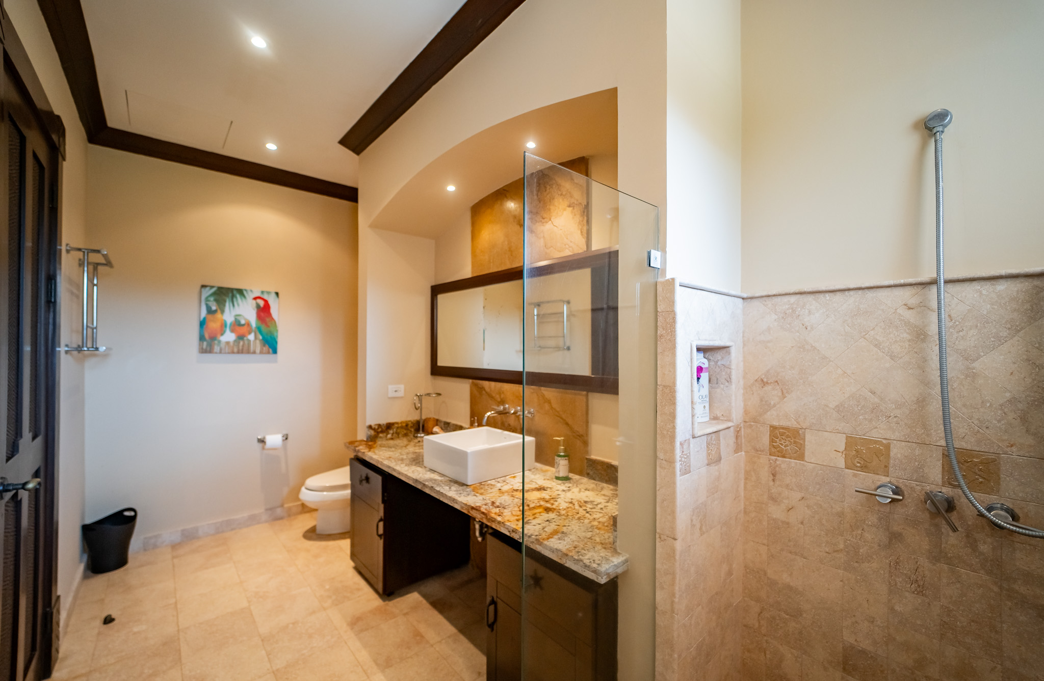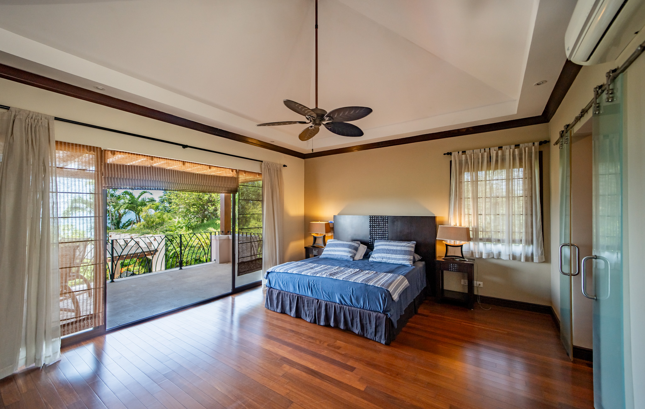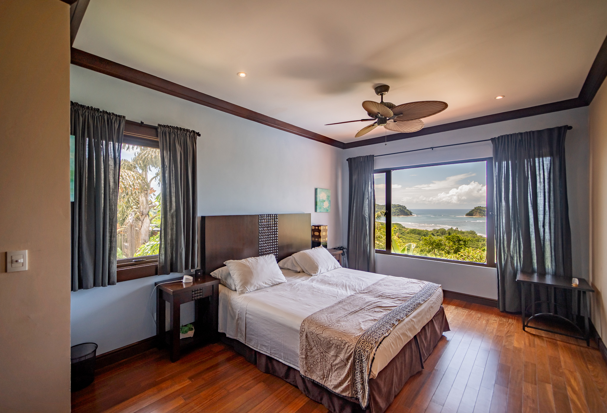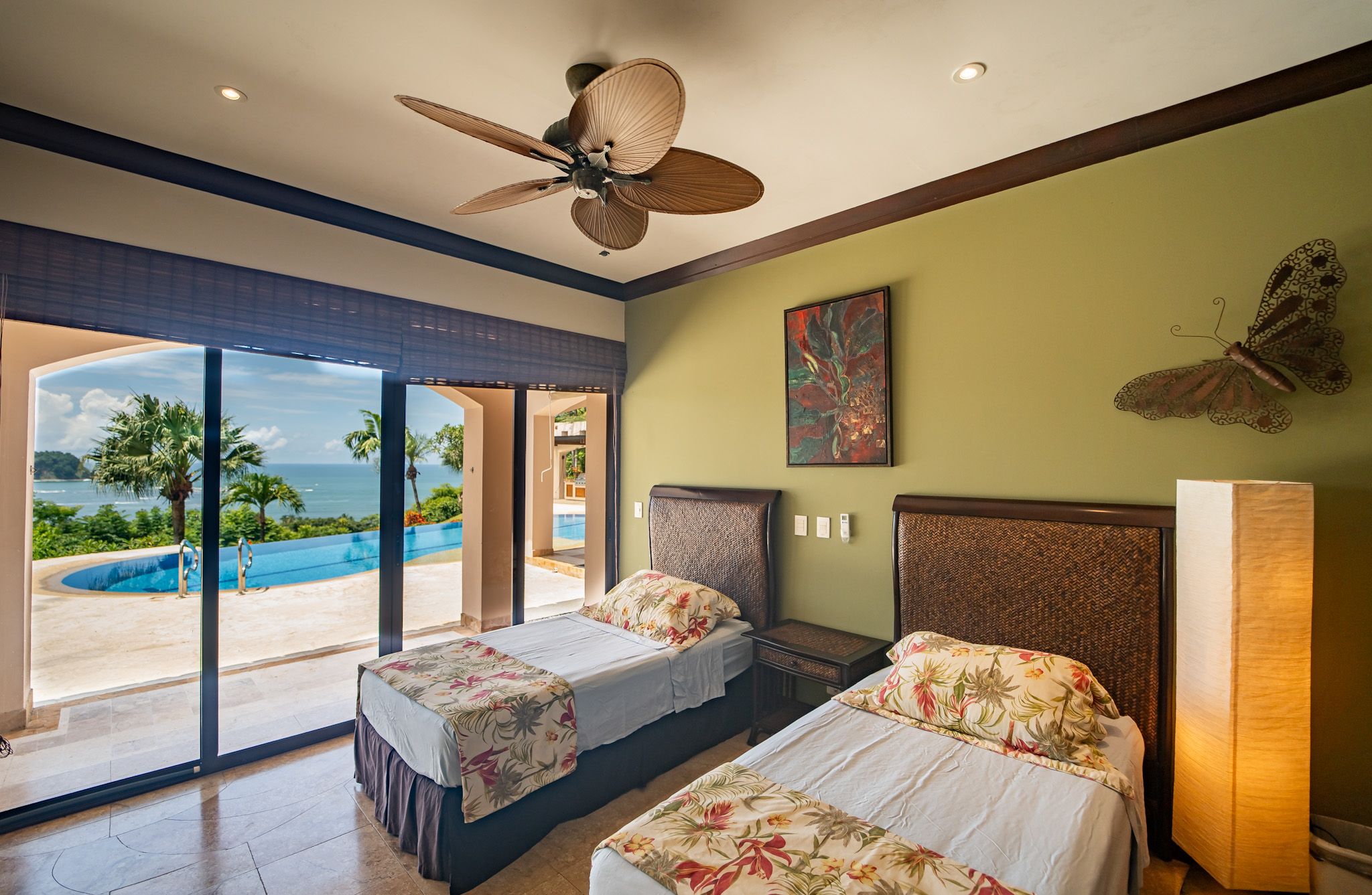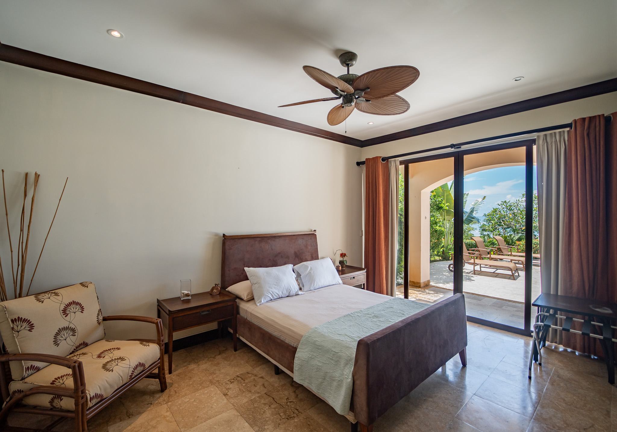 Each bedroom enjoys sweeping views of Sámara Bay and Isla Chora, with two master suites offering large ensuite baths and private balconies. The lower-level bedrooms were thoughtfully designed to accommodate wheelchair access, ensuring comfort and inclusivity for all guests.