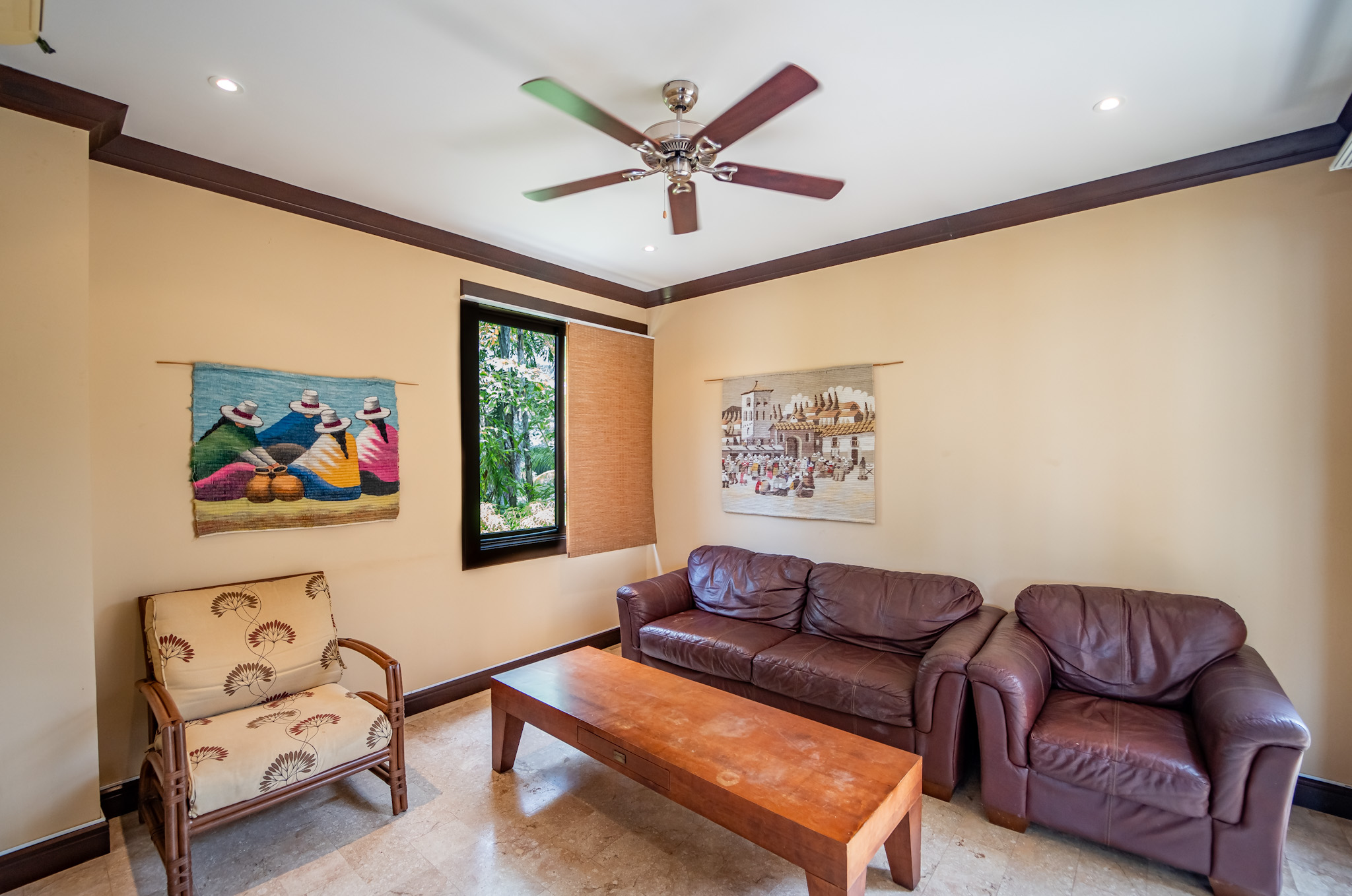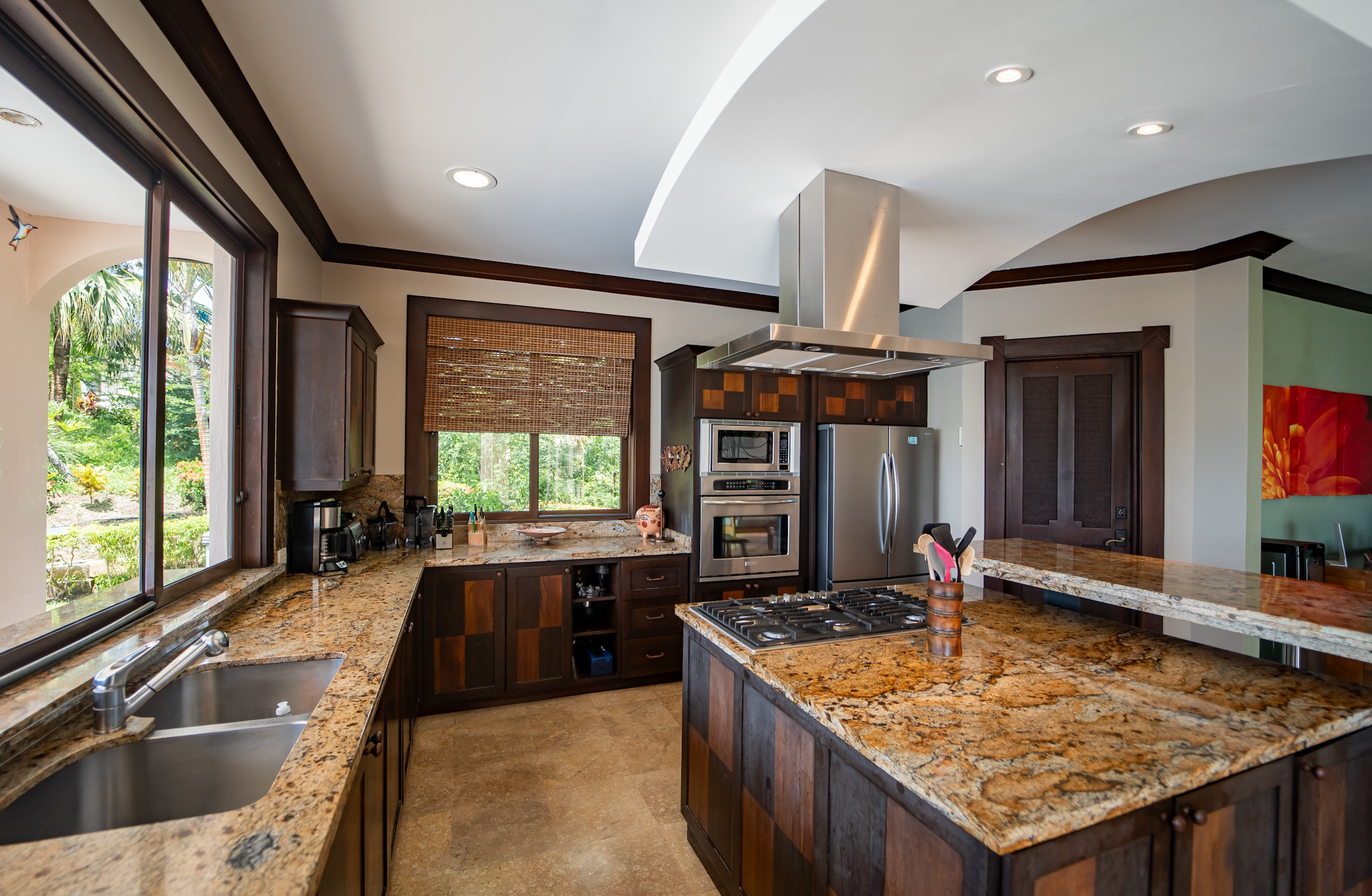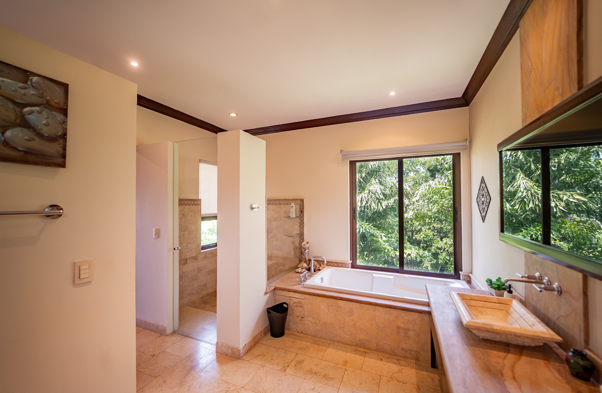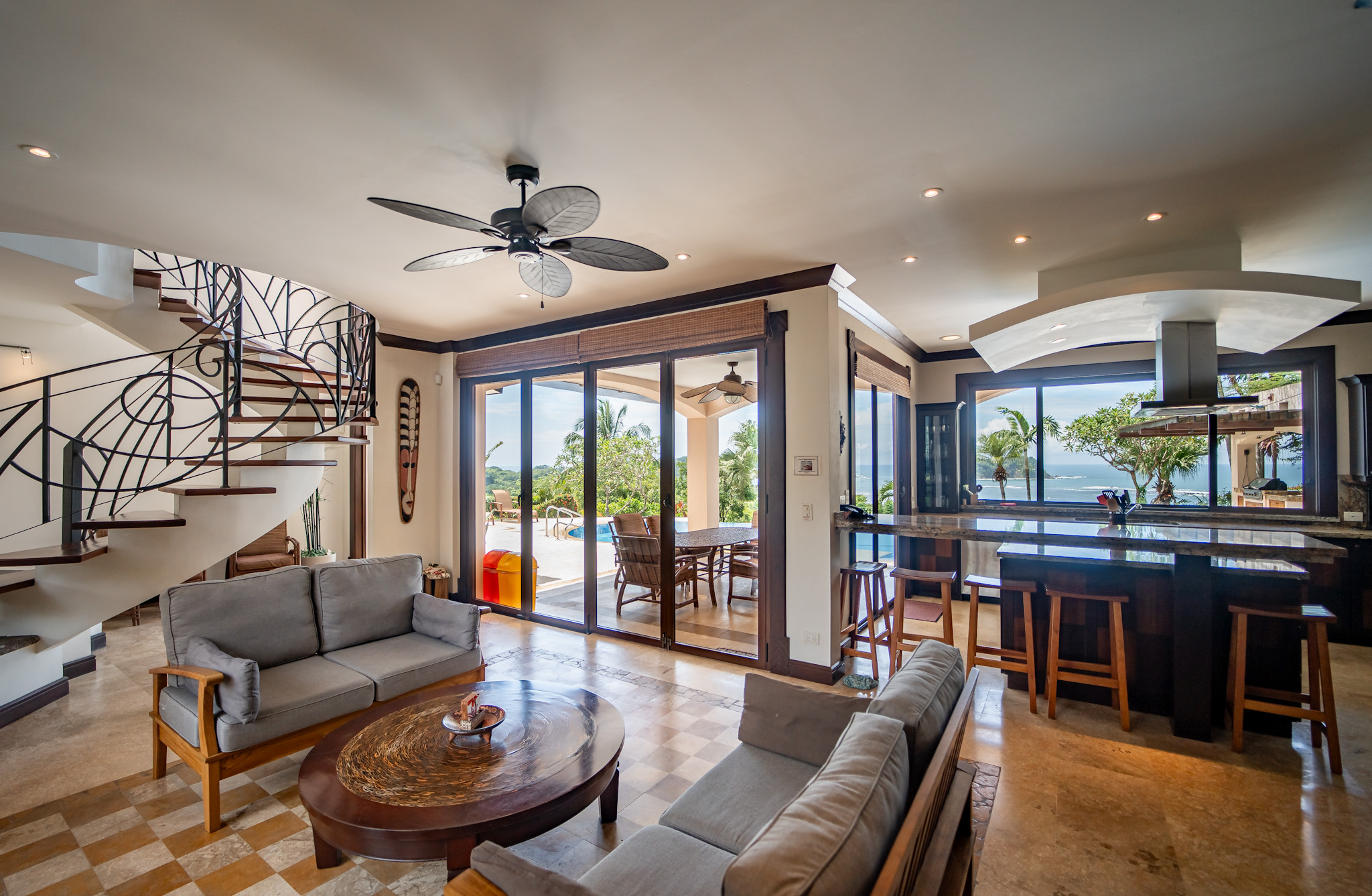 High-end finishes—local hardwoods, polished Colombian limestone floors on the lower level, and high-quality laminate wood floors in the upper bedrooms—blend natural textures with refined style, creating a relaxed tropical atmosphere.