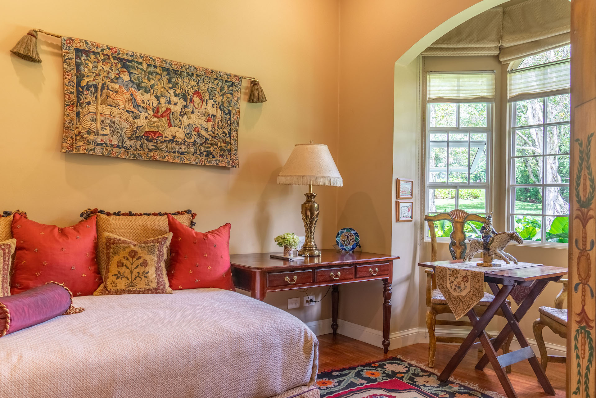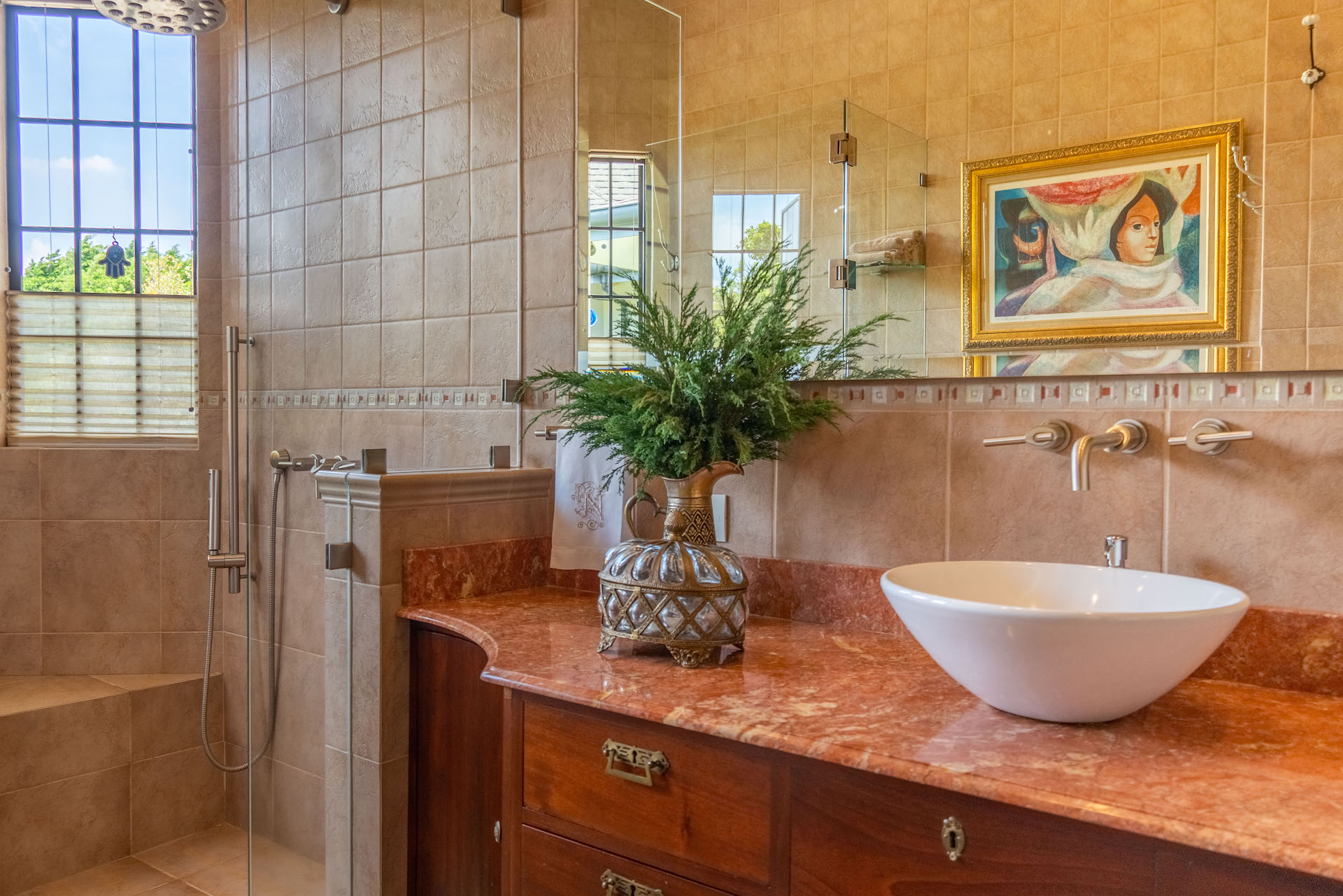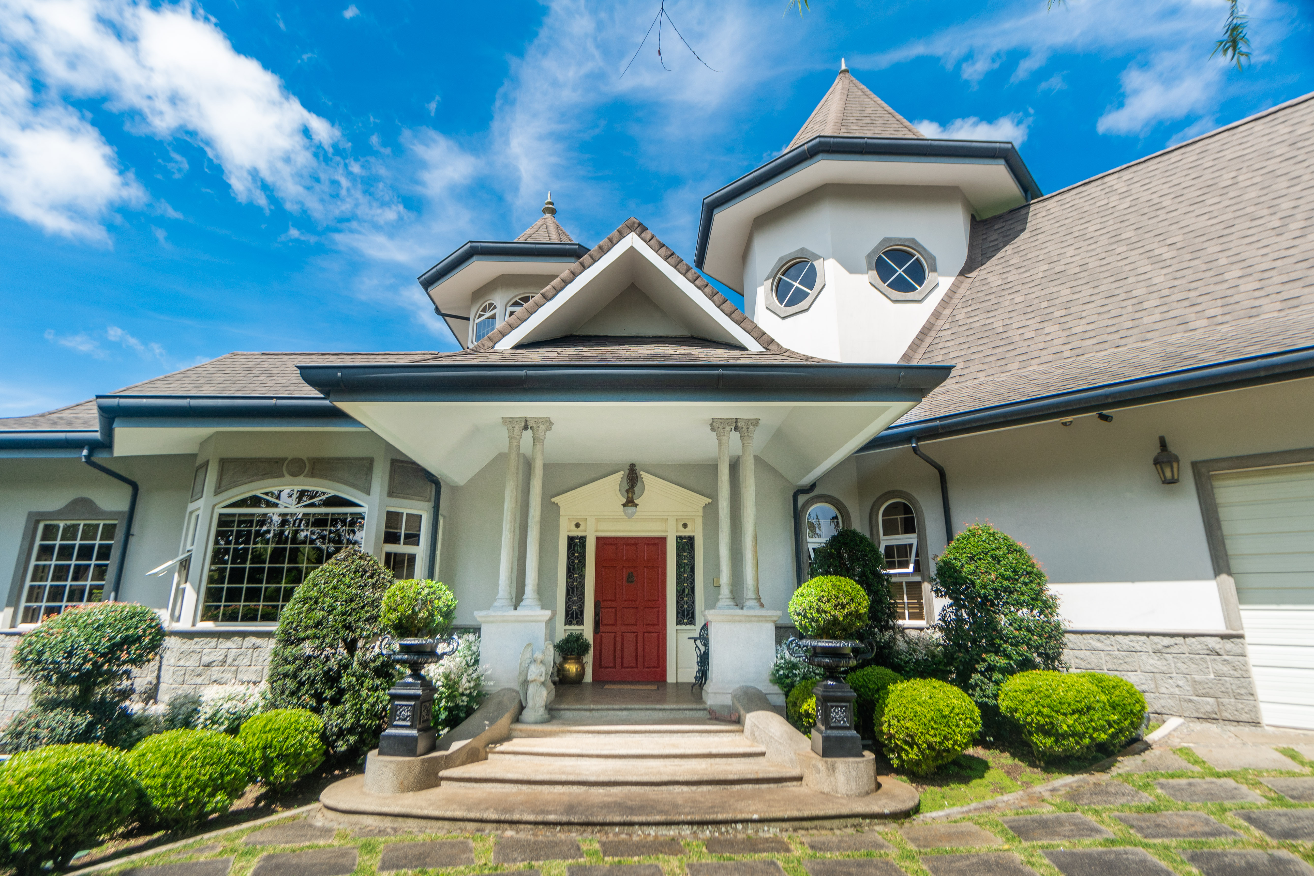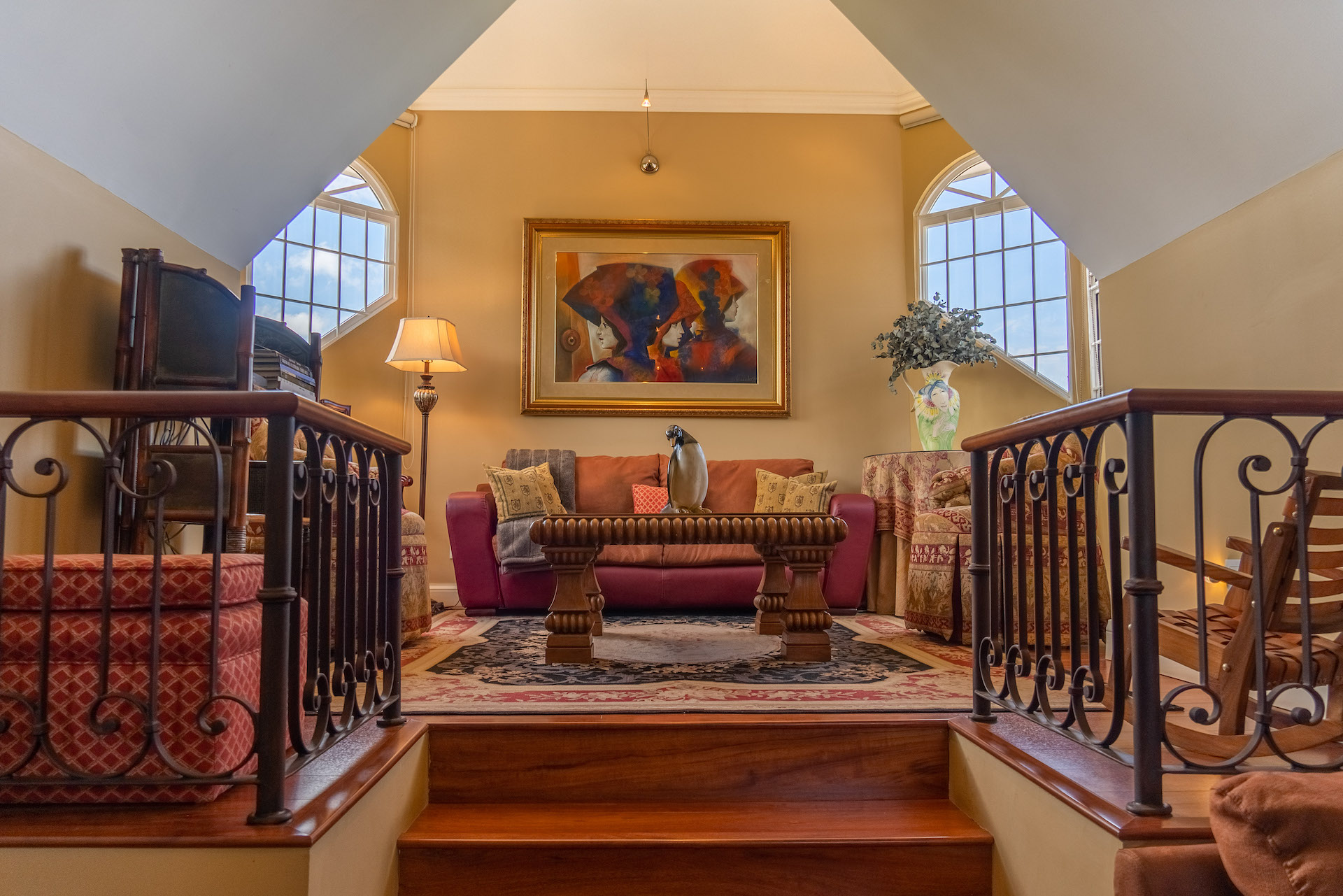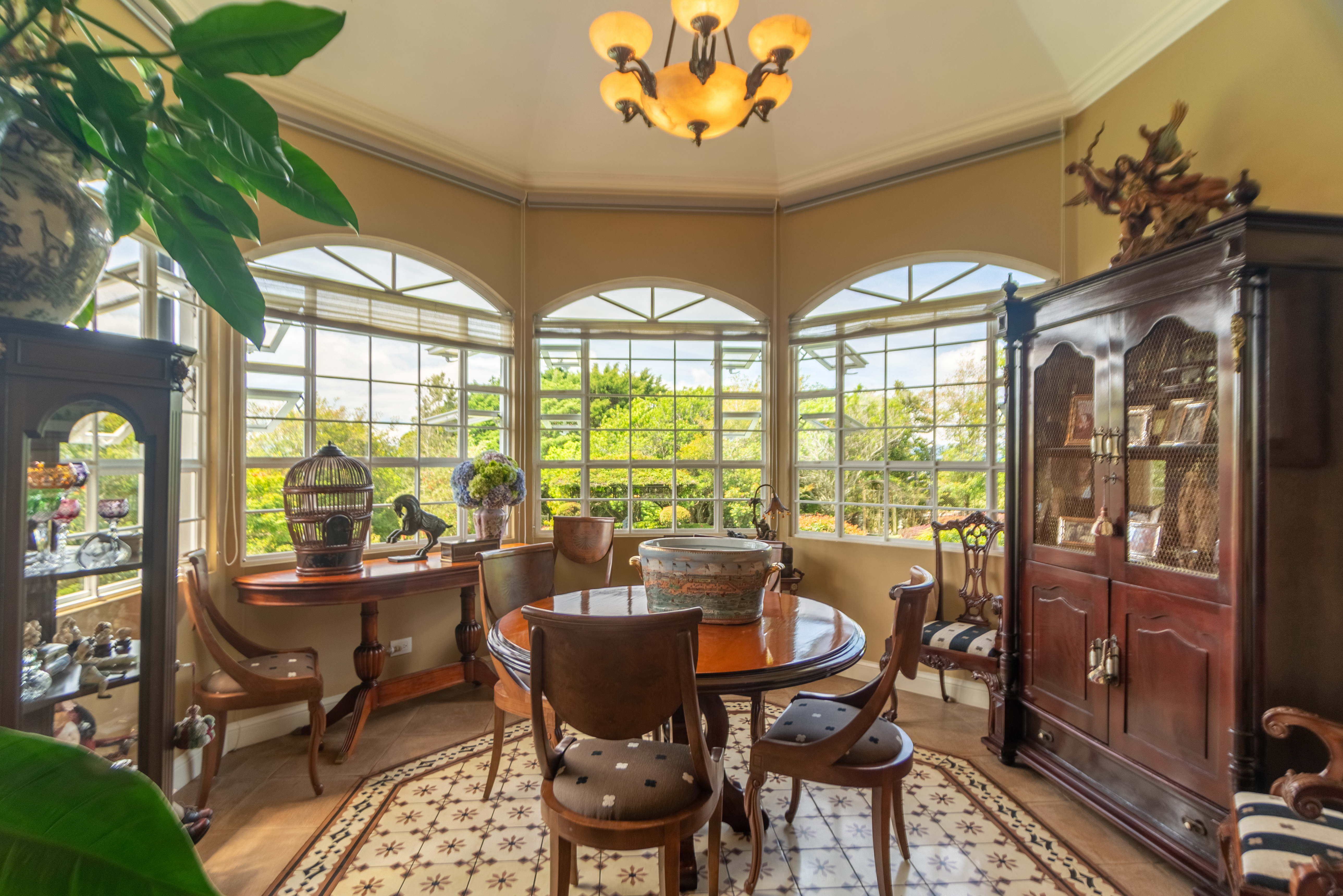 Three bedrooms on the first level each with its bathroom. The master bedroom is quite spacious for a king bed, sitting room, office and private access to the garden. The main bathroom has red marble and antique furniture. Door with viscelated glass at the entrance to the bedroom area. On the second floor (in the tower), there is a wonderful two-ambiance bedroom with a full bathroom and views of the Poas and Turrialba volcanoes. On the ground floor, there is a multipurpose room that can be used from the 5th room or social area. It offers a full bathroom, stone floors of MOSAICOS DONINELLI, access to the garden through a private door (so it can even be a nice mini-apartment for visitors, in-laws or use it as Airbnb), it even has space for a wine cellar and storage room.