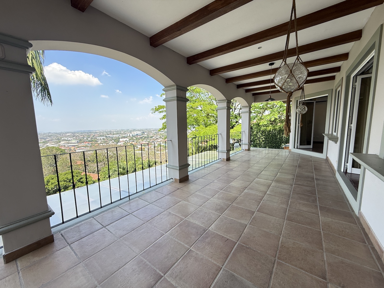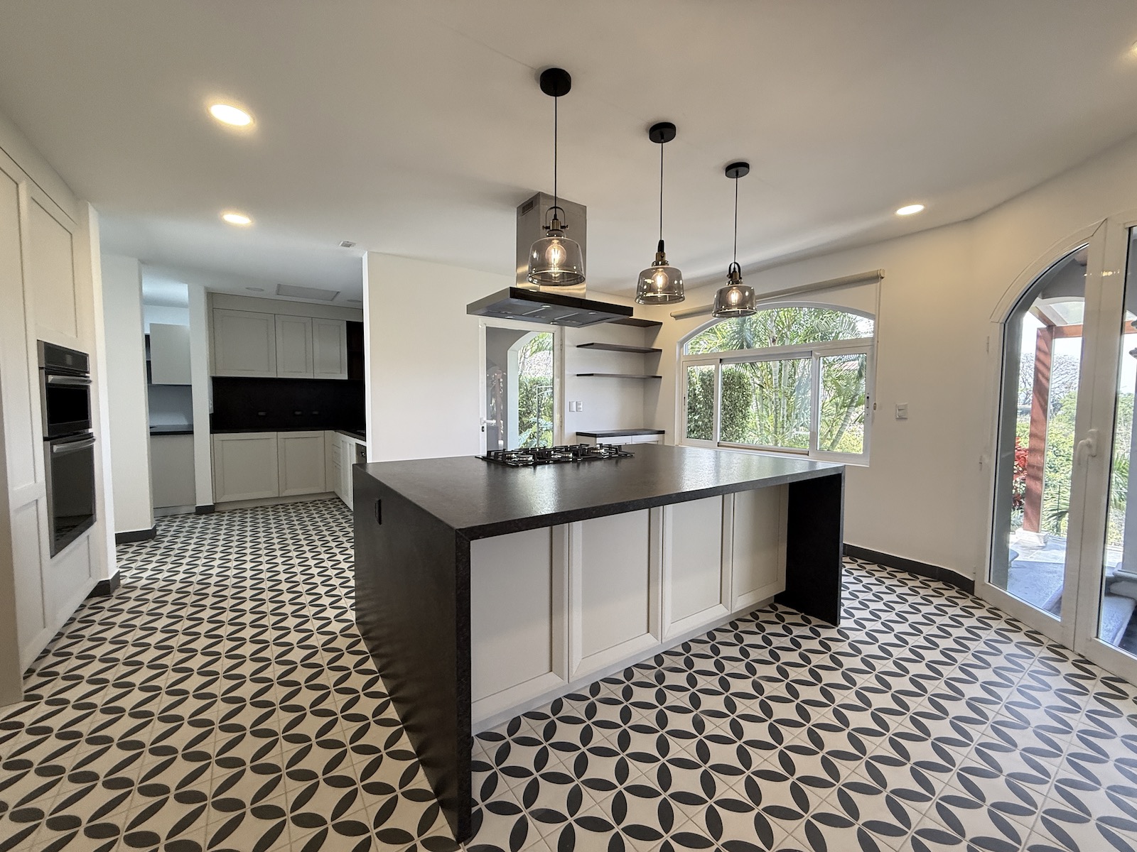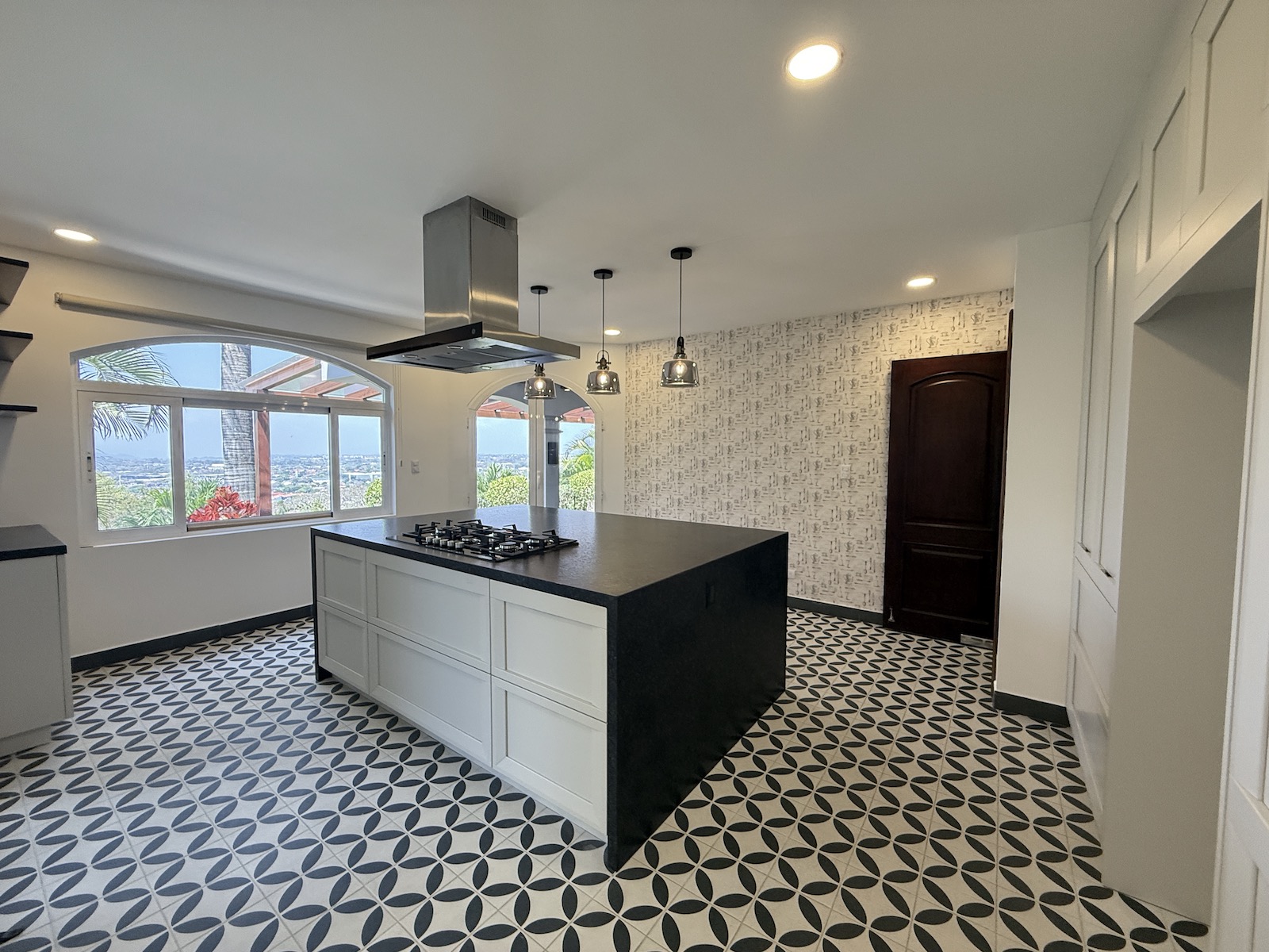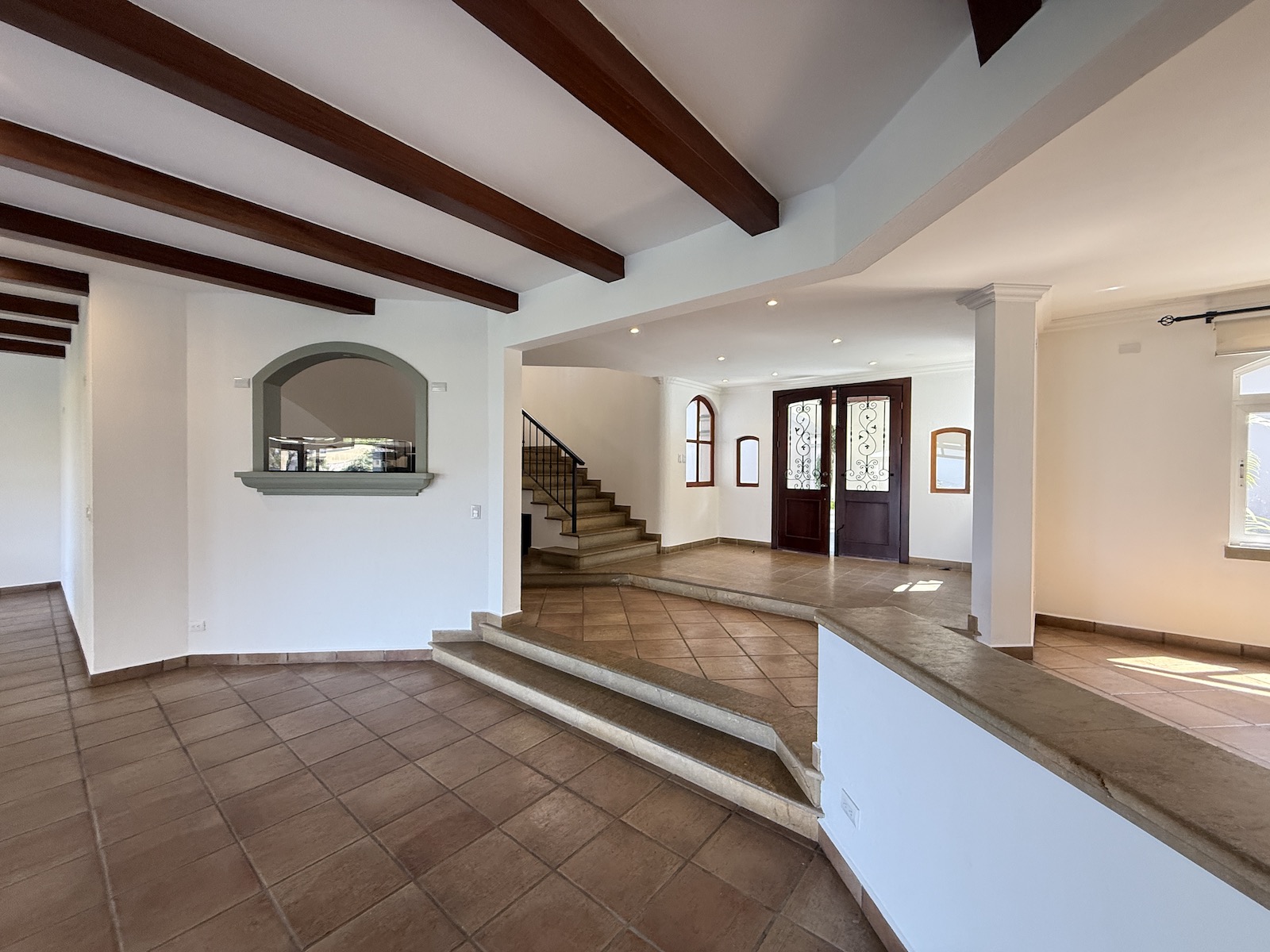 Al ingresar, un drop-off techado da la bienvenida a un espacioso comedor a la izquierda y una amplia sala de estar al frente, que abre paso a una terraza y jardín con vistas panorámicas al valle y espectaculares atardeceres. La cocina de gas, remodelada con un diseño fresco de villa mediterránea, incluye encimera de granito y cuenta con una salida hacia el comedor, además de una puerta arqueada de vidrio que conecta con la terraza, permitiendo disfrutar de las vistas mientras se preparan deliciosos platillos. A la derecha, encontrarás un área moderna y fresca para barbacoas, perfecta para reuniones familiares.