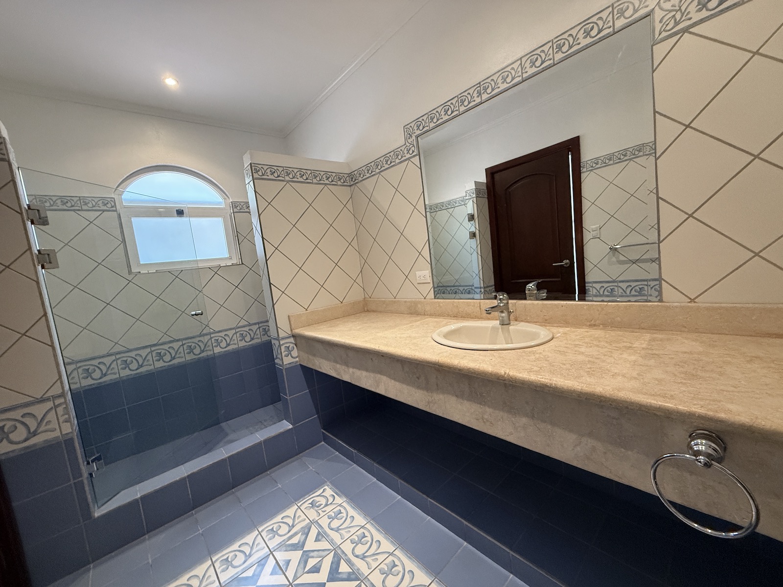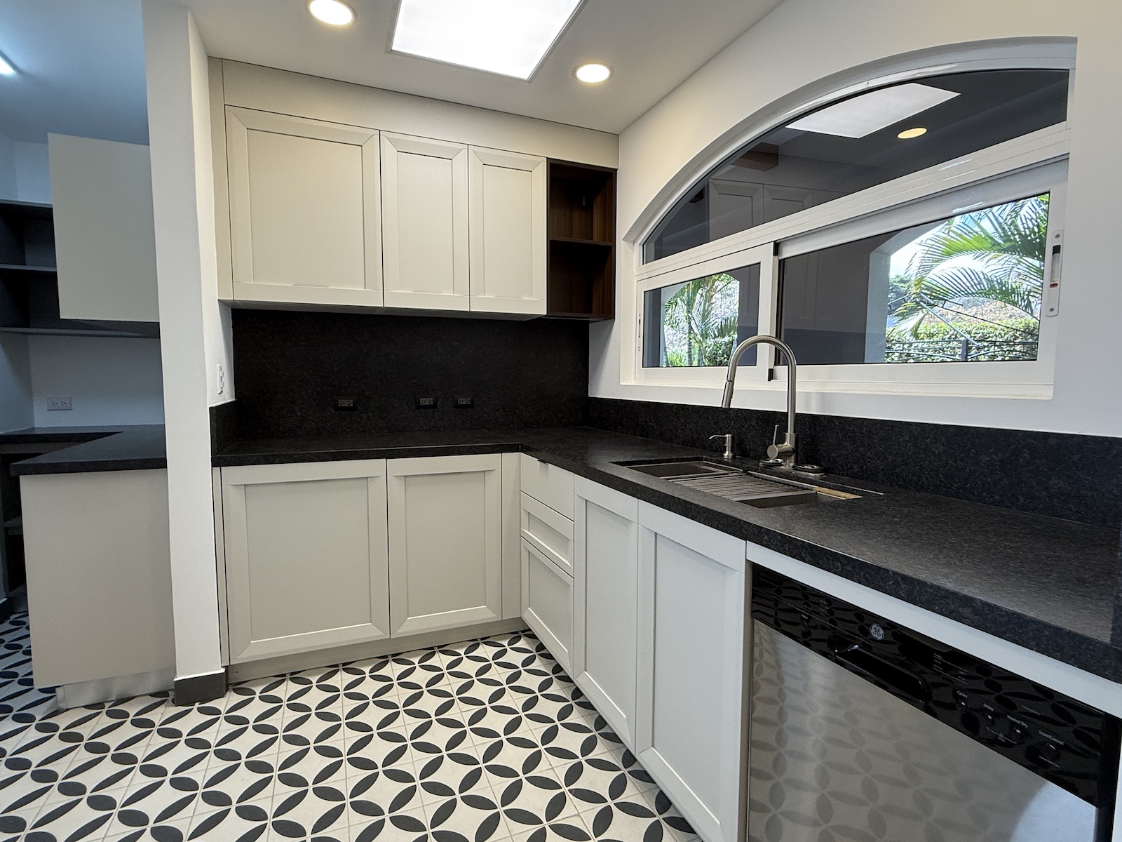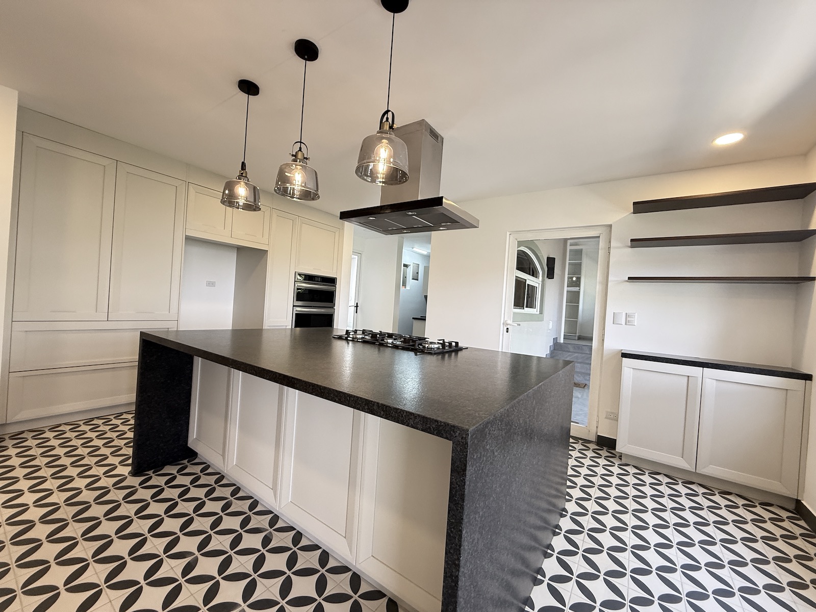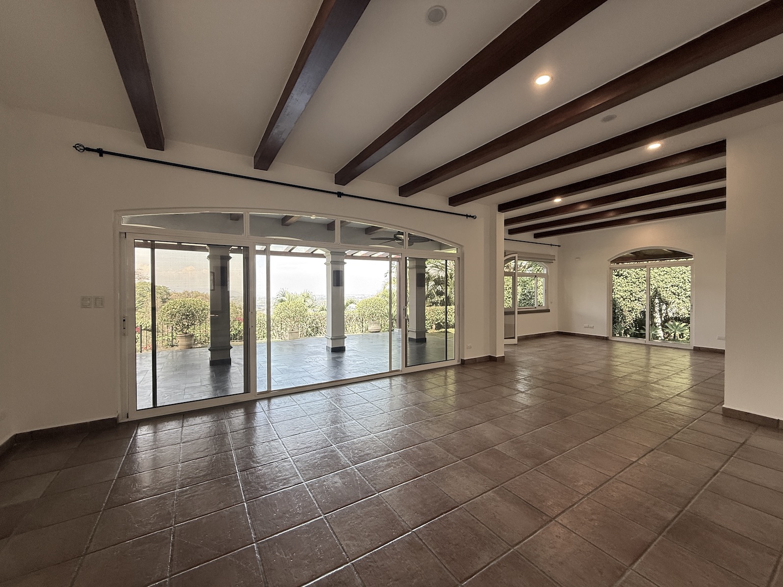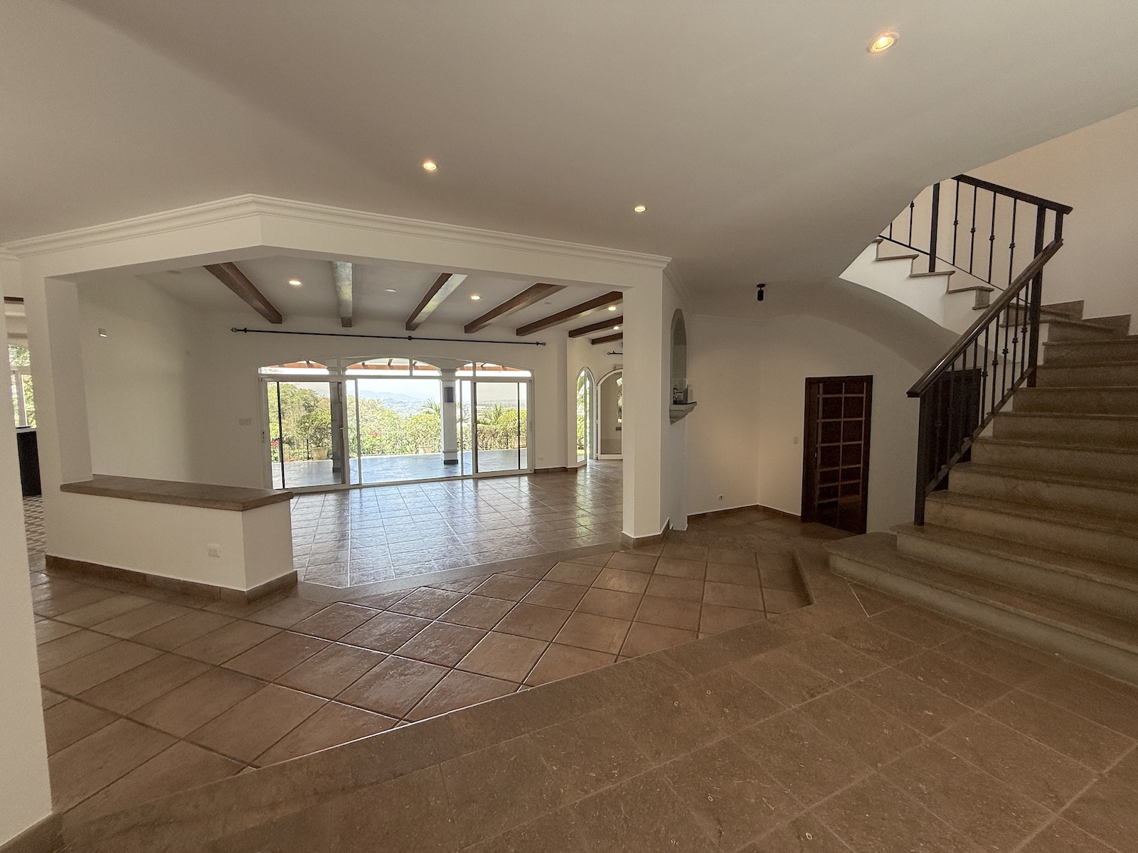 Al ingresar, un drop-off techado da la bienvenida a un espacioso comedor a la izquierda y una amplia sala de estar al frente, que abre paso a una terraza y jardín con vistas panorámicas al valle y espectaculares atardeceres. La cocina de gas, remodelada con un diseño fresco de villa mediterránea, incluye encimera de granito y cuenta con una salida hacia el comedor, además de una puerta arqueada de vidrio que conecta con la terraza, permitiendo disfrutar de las vistas mientras se preparan deliciosos platillos. A la derecha, encontrarás un área moderna y fresca para barbacoas, perfecta para reuniones familiares.