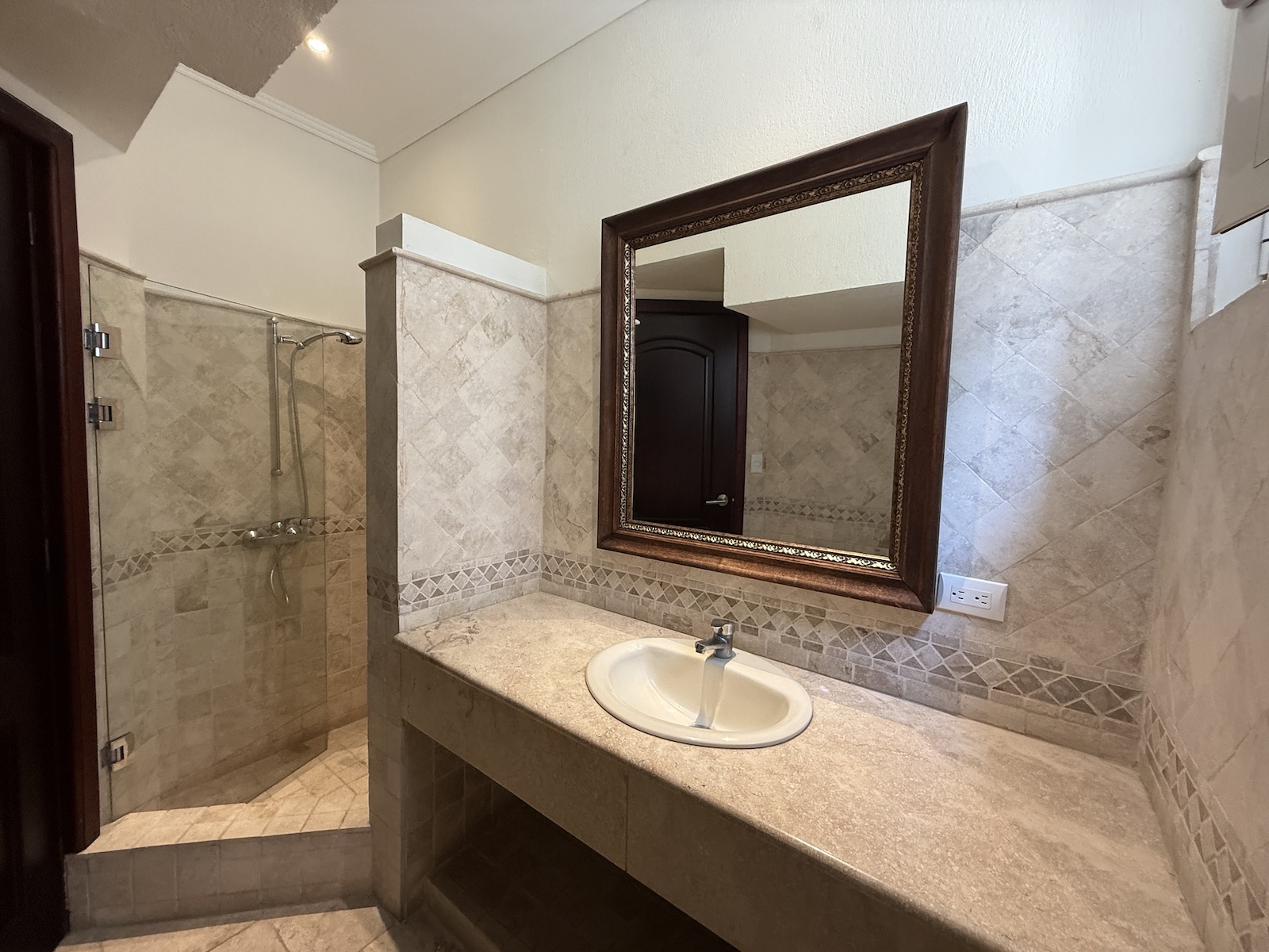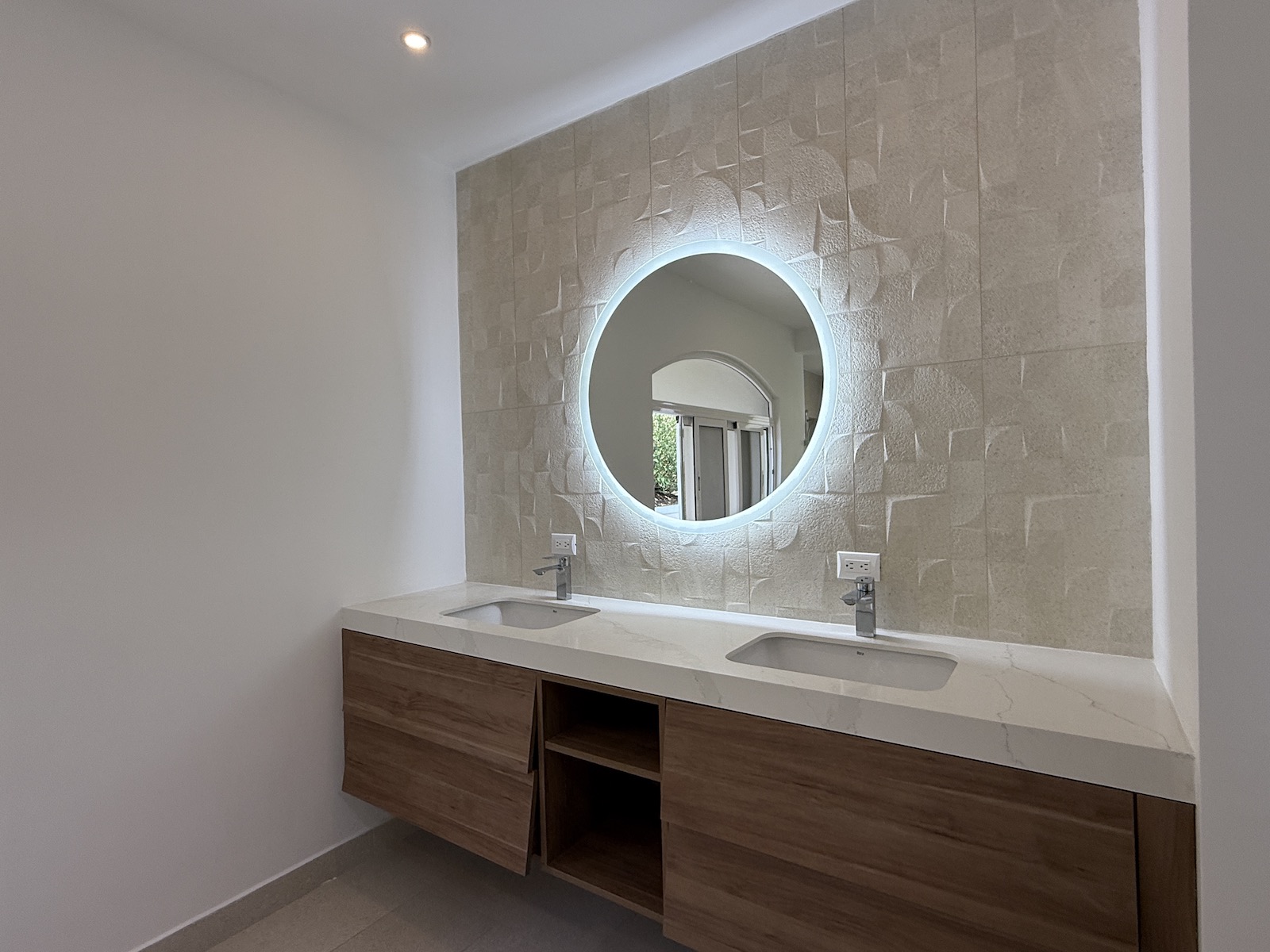• One on the first level, ideal as a bedroom or an office, with a full bathroom featuring a marble countertop.