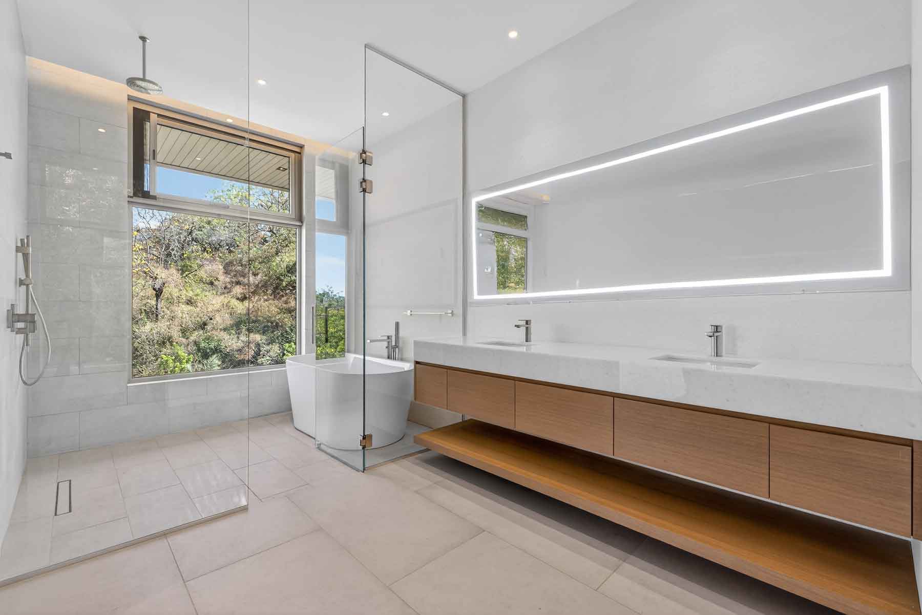 -Primary suite with dual walk-in closets, double vanities, balcony access, and sweeping coastal vistas—even from the bathtub