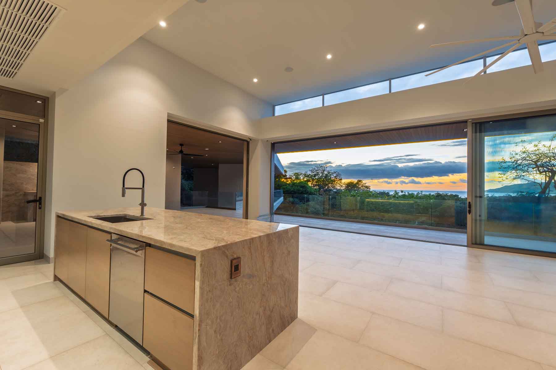 -Open-concept living areas featuring natural oak finishes, soft-toned palettes, and expansive windows framing the tropical scenery