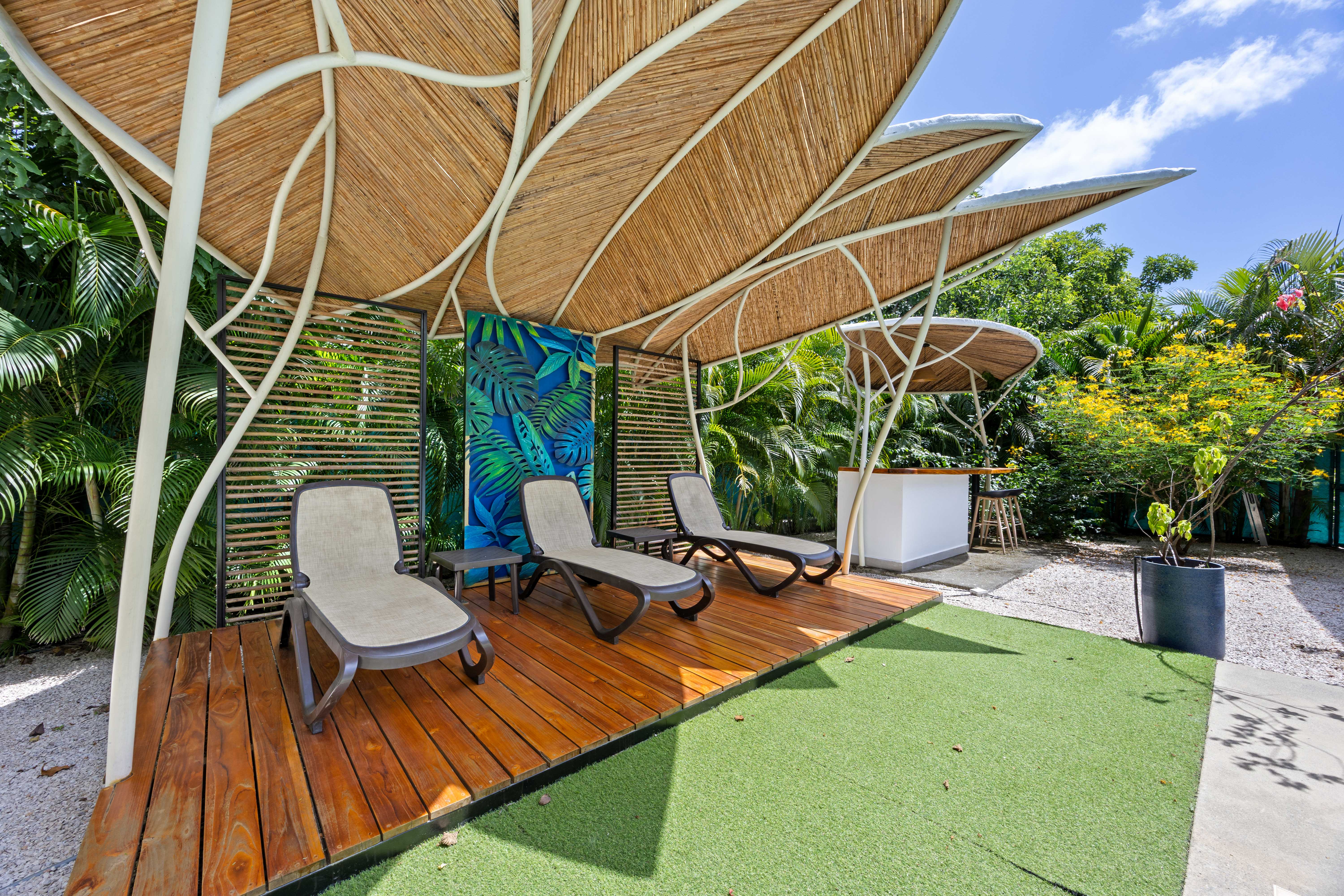 Step outside to your tropical oasis: an expansive terrace with a sparkling private pool framed by swaying palms, loungers, and a shaded rancho with al fresco dining and a barbecue setup—perfect for afternoons of relaxation or lively evenings under the stars.