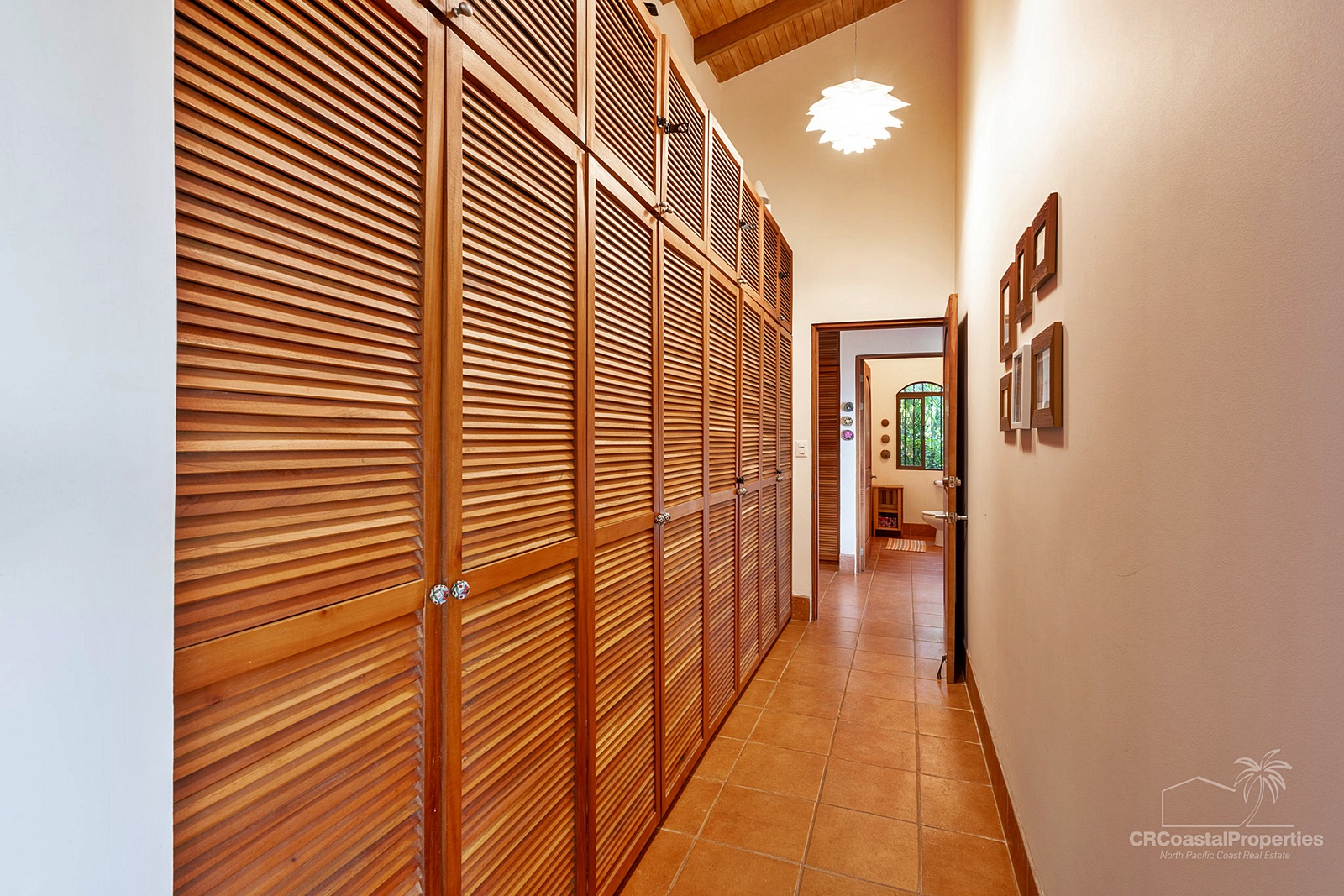 The main residence features a generous primary suite with high ceilings and uninterrupted ocean views. The en suite bathroom includes double sinks and a double shower. An additional room currently used as an office can easily be converted into a children’s bedroom. The home also offers a large utility room, a guest half bathroom, and ample built-in storage along the hallway leading to the primary suite.