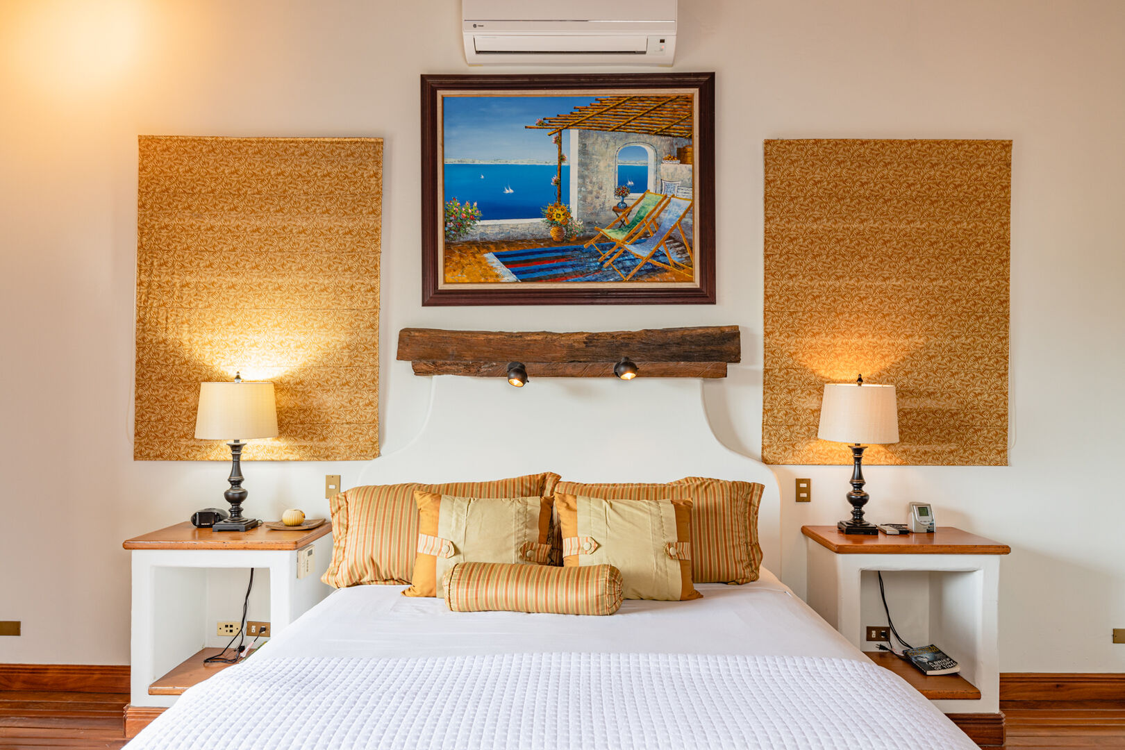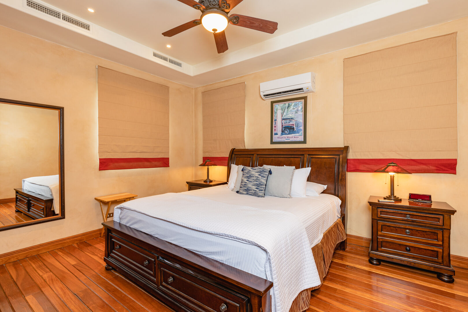 Designed by California architect Miguel Podolsky and built by engineer Karl Gronemeyer, this 6-bedroom, 4.5-bath residence spans nearly 6,000 sq. ft. and blends Spanish Colonial architecture with fine finishes. The open floor plan includes a Great Room, dining area, and professionally equipped kitchen with custom cabinetry and granite countertops. The poolside master suite opens to shaded terraces, while two guest suites share a traditionally styled bathroom.
